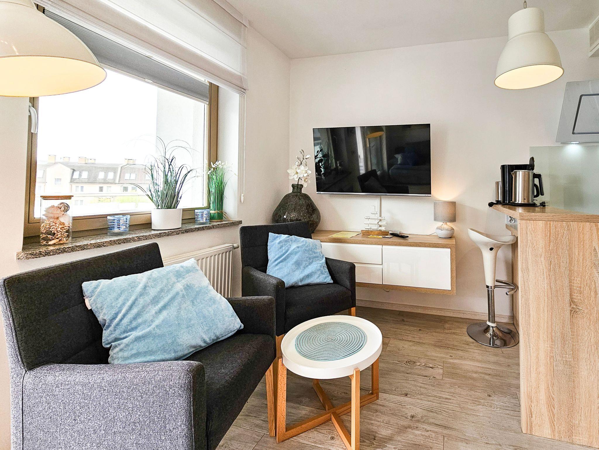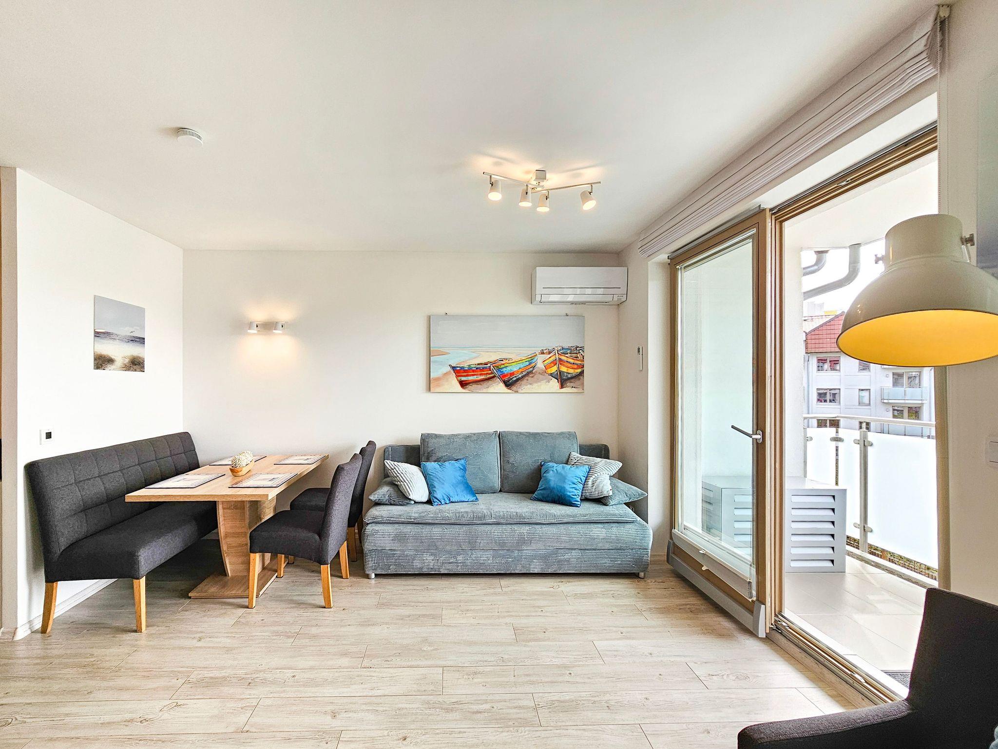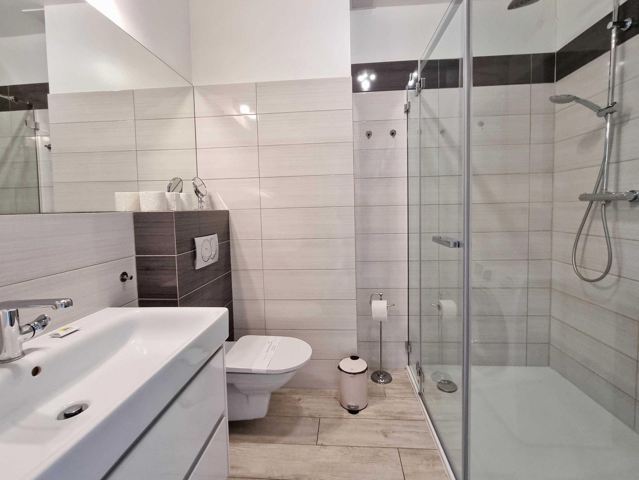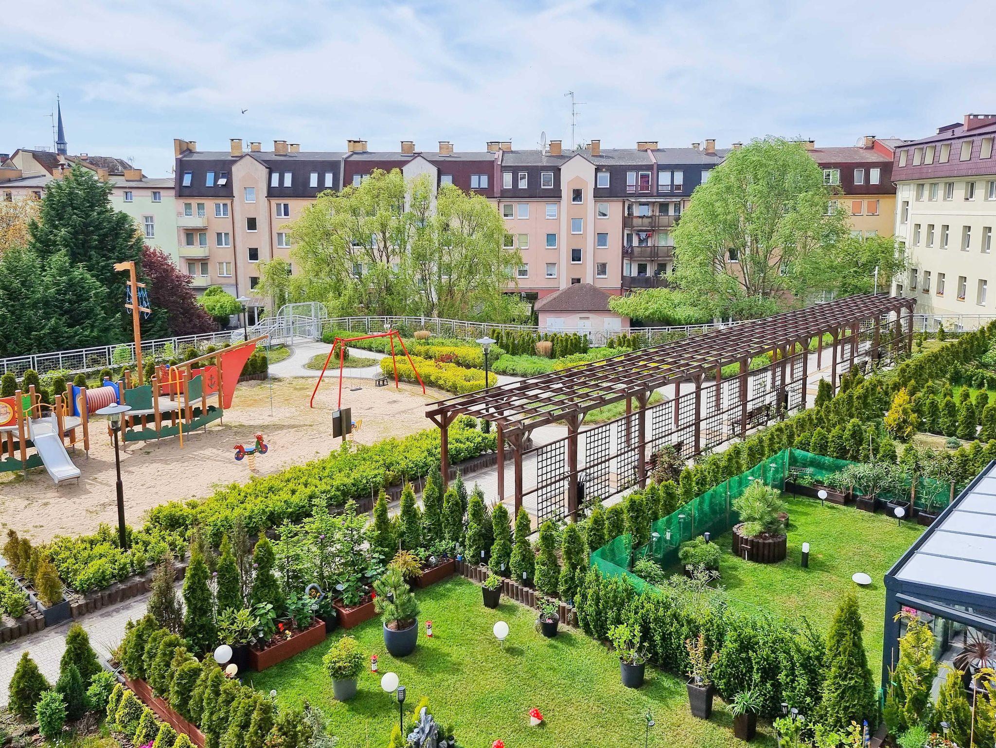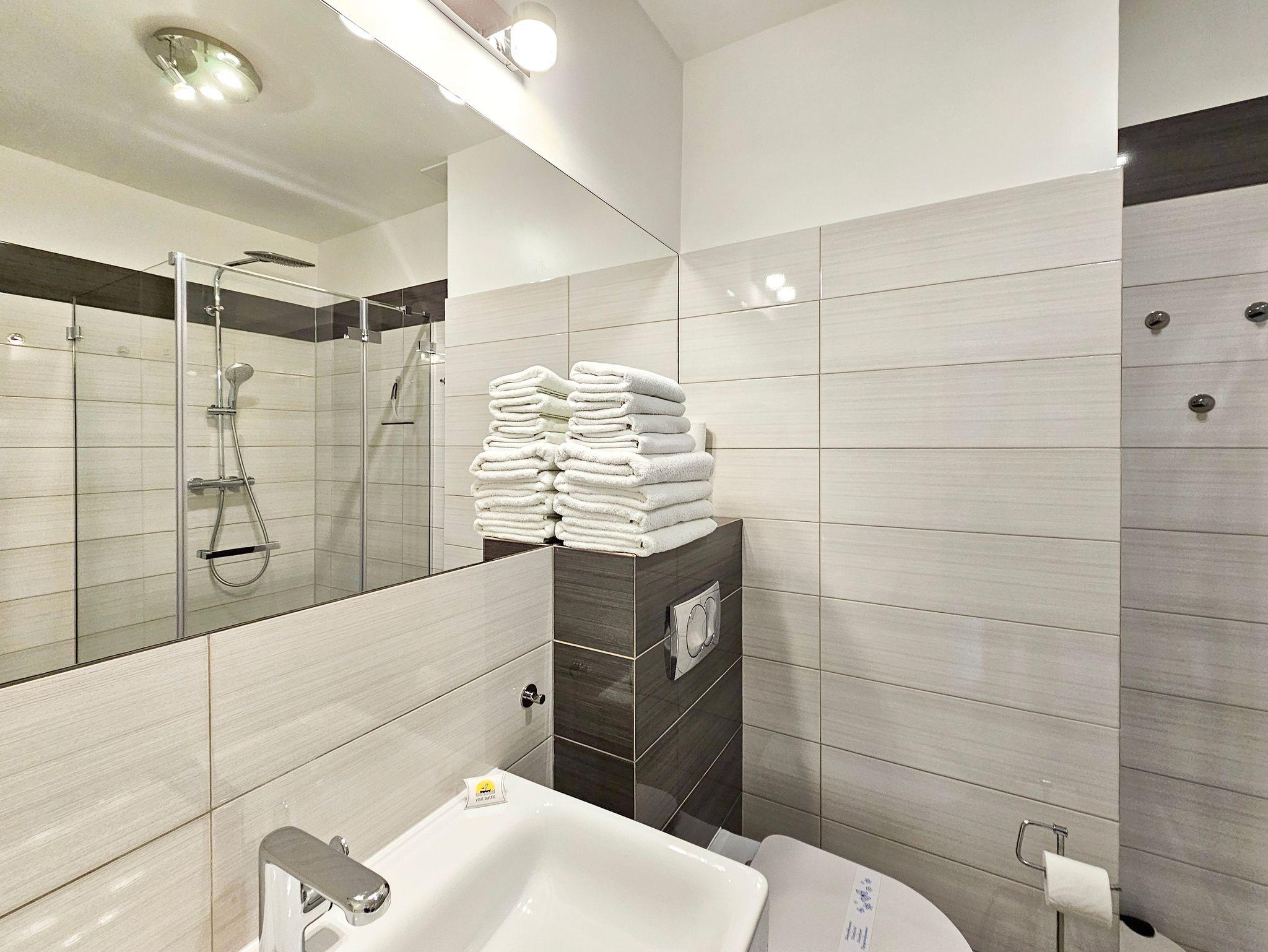 Die Wohnung besteht aus einem Wohnzimmer mit einem Schlafsofa (140cm x 200cm), einem Tisch mit einer Bank und zwei Stühlen, einer Küchenzeile und Zugang zu einem großen Balkon mit Blick auf einen grünen Innenhof. Im Wohnzimmer gibt es einen LCD-Fernseher mit polnischen und deutschen Kanälen. Die Küche ist mit allen Geräten ausgestattet, die für die Zubereitung und den Verzehr von Mahlzeiten notwendig sind, sowie mit einem großen Kühlschrank mit Gefrierfach, Backofen, Mikrowelle, Geschirrspüler, Induktionsherd mit 4 Kochplatten, Wasserkocher, Toaster und Filterkaffeemaschine.