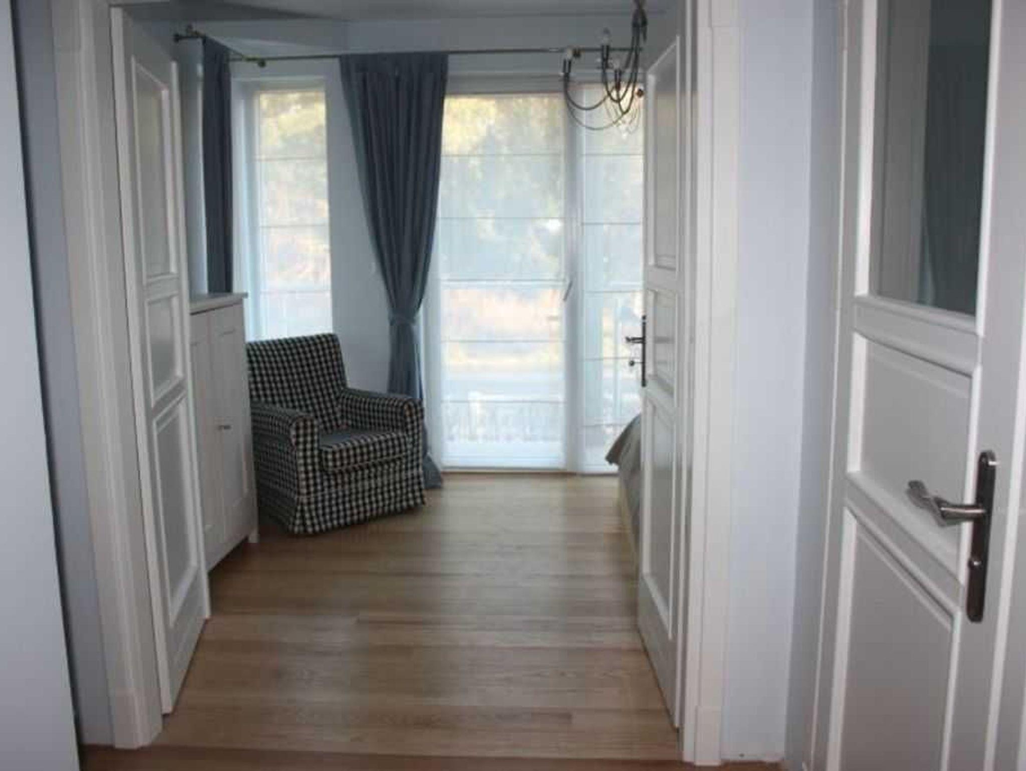 Durch die Öffnung der breiten Doppeltür zum Schlafzimmer können Sie sich bei Bedarf, z.B. am Tag, mehr Wohnraum schaffen. In unserem maßgeschneiderten stilvollen Einbauschrank zwischen dem Schlaf- und Wohnzimmer ist für genug Stauraum gesorgt.