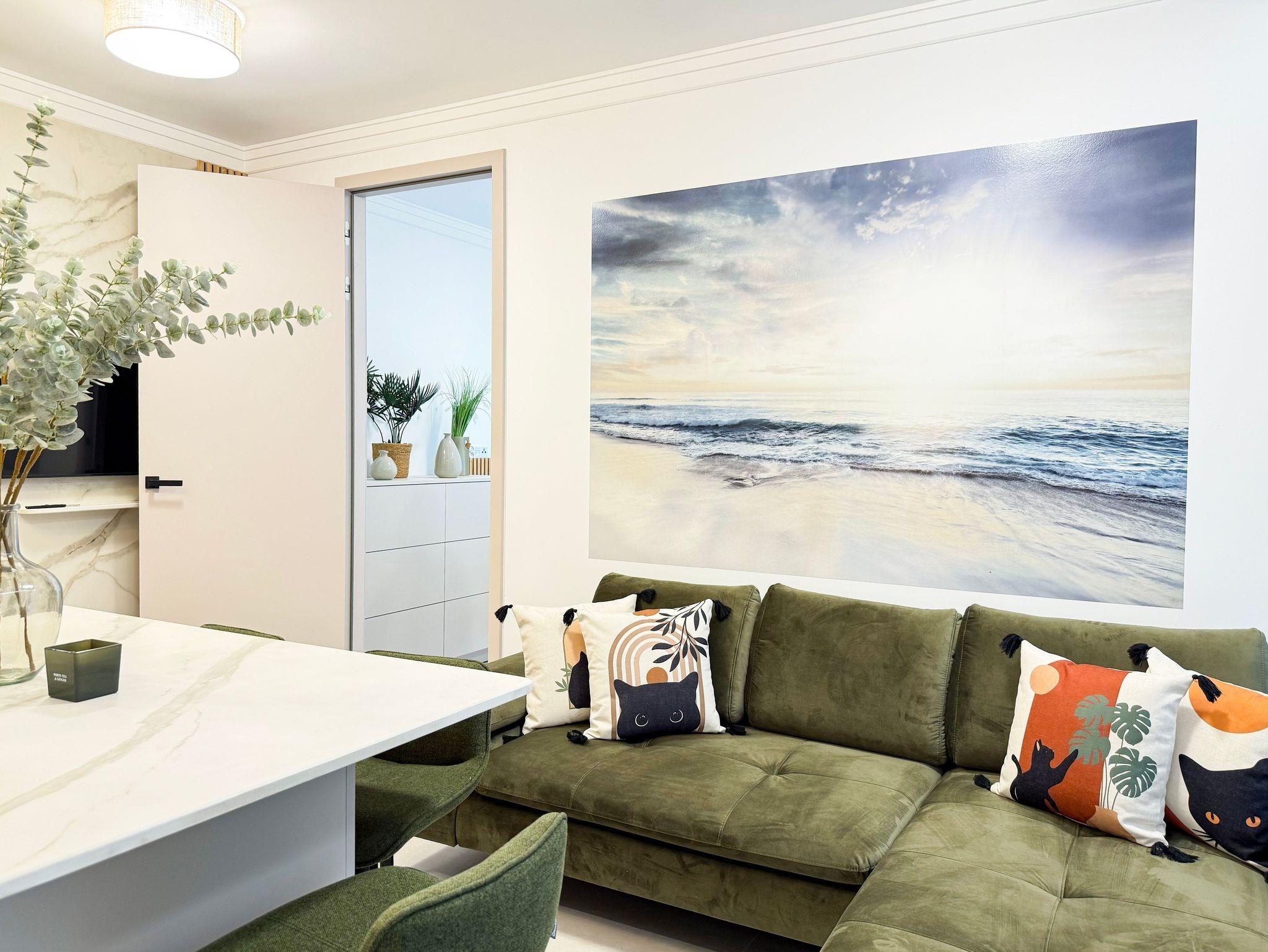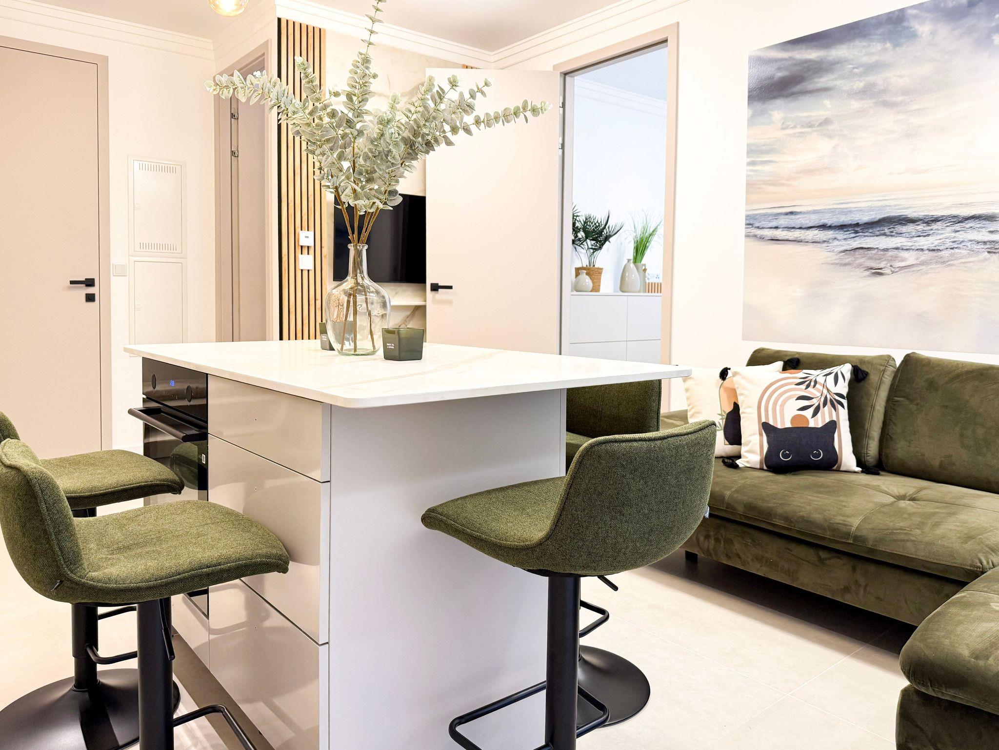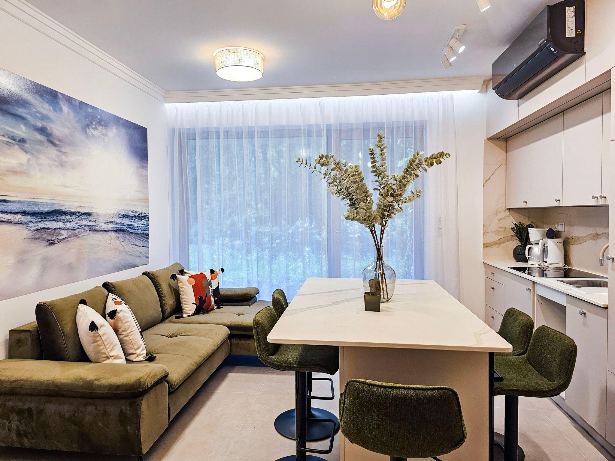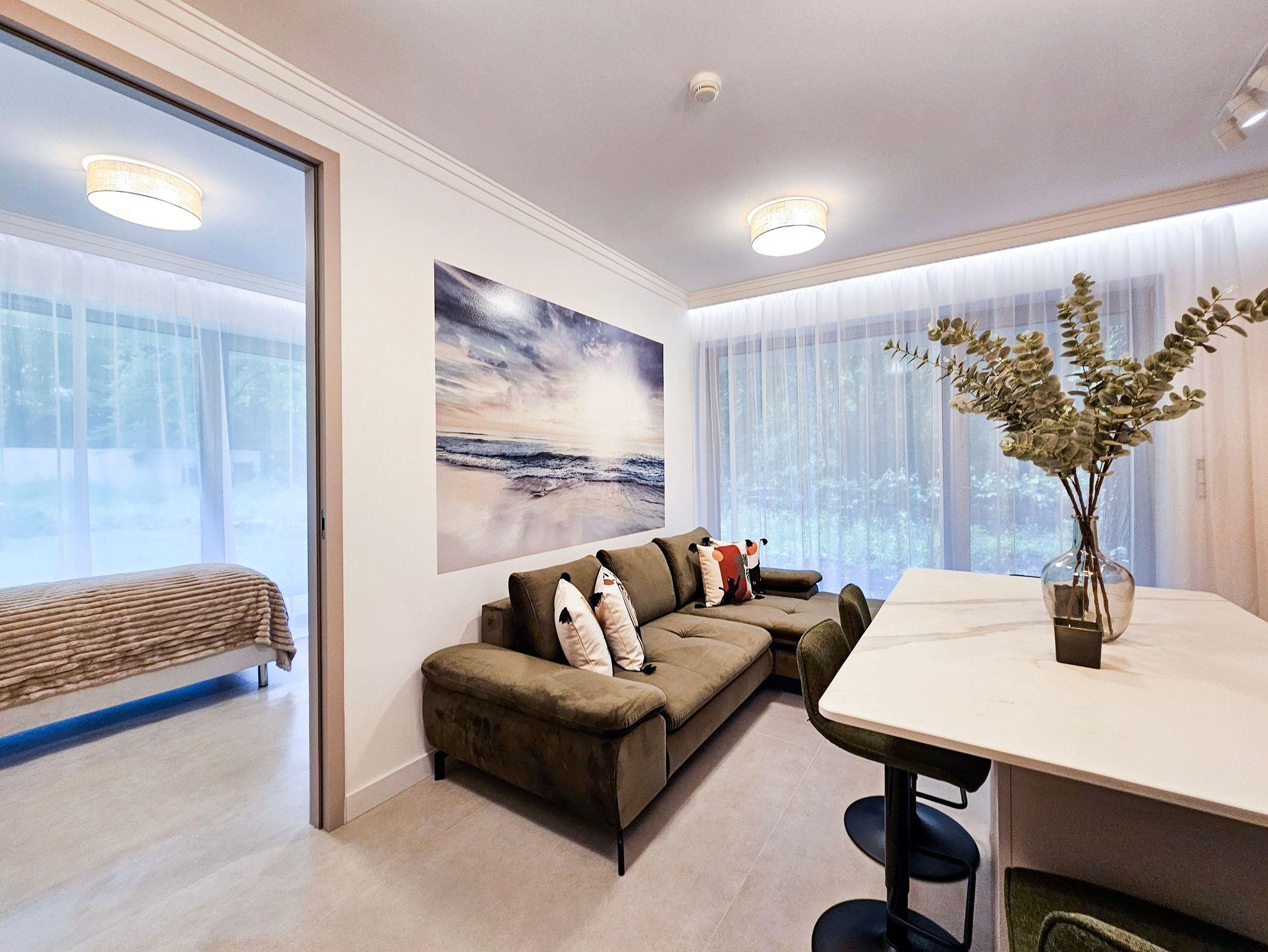 Das 46 m² große Apartment besteht aus zwei Schlafzimmern, einem Wohnzimmer und einer Terrasse. Es ist modern eingerichtet und wurde kürzlich zur Nutzung freigegeben. Im Wohnzimmer befinden sich ein Schlafsofa, ein Fernseher und eine gut ausgestattete Küchenzeile. Den Gästen stehen Geschirr, eine Spülmaschine, ein Backofen, ein Kochfeld, ein Kühlschrank, eine Filterkaffeemaschine, ein Toaster und ein Wasserkocher zur Verfügung.