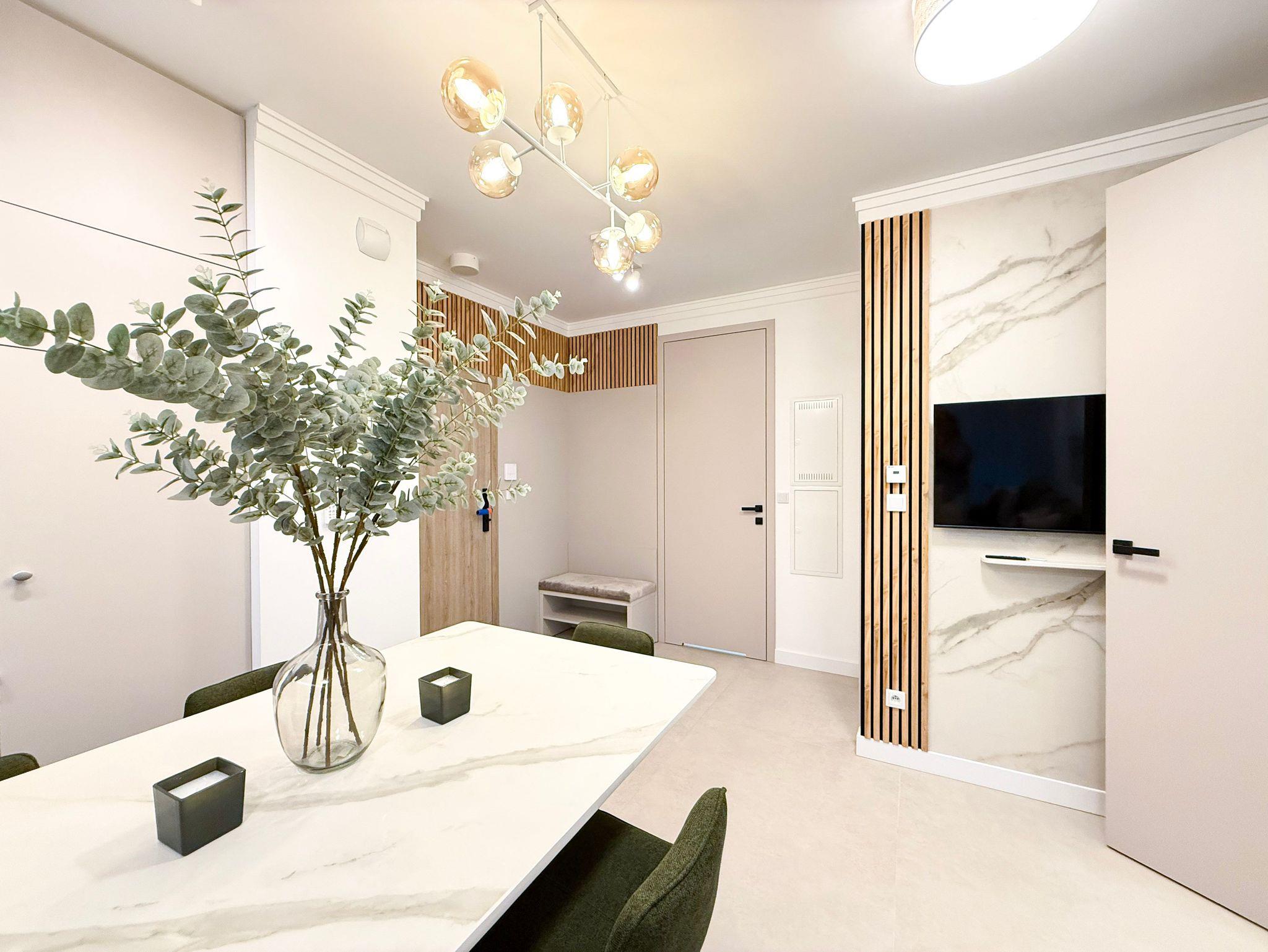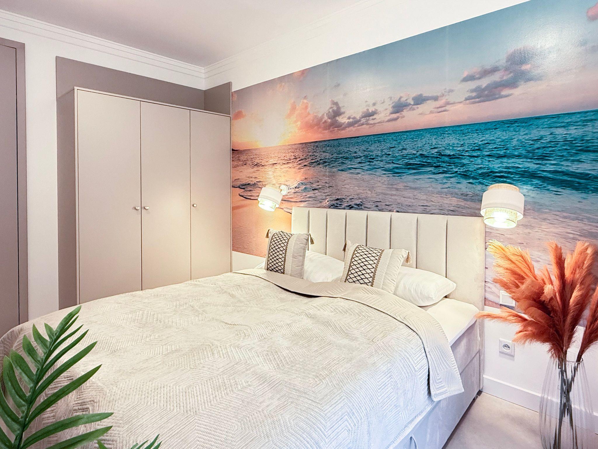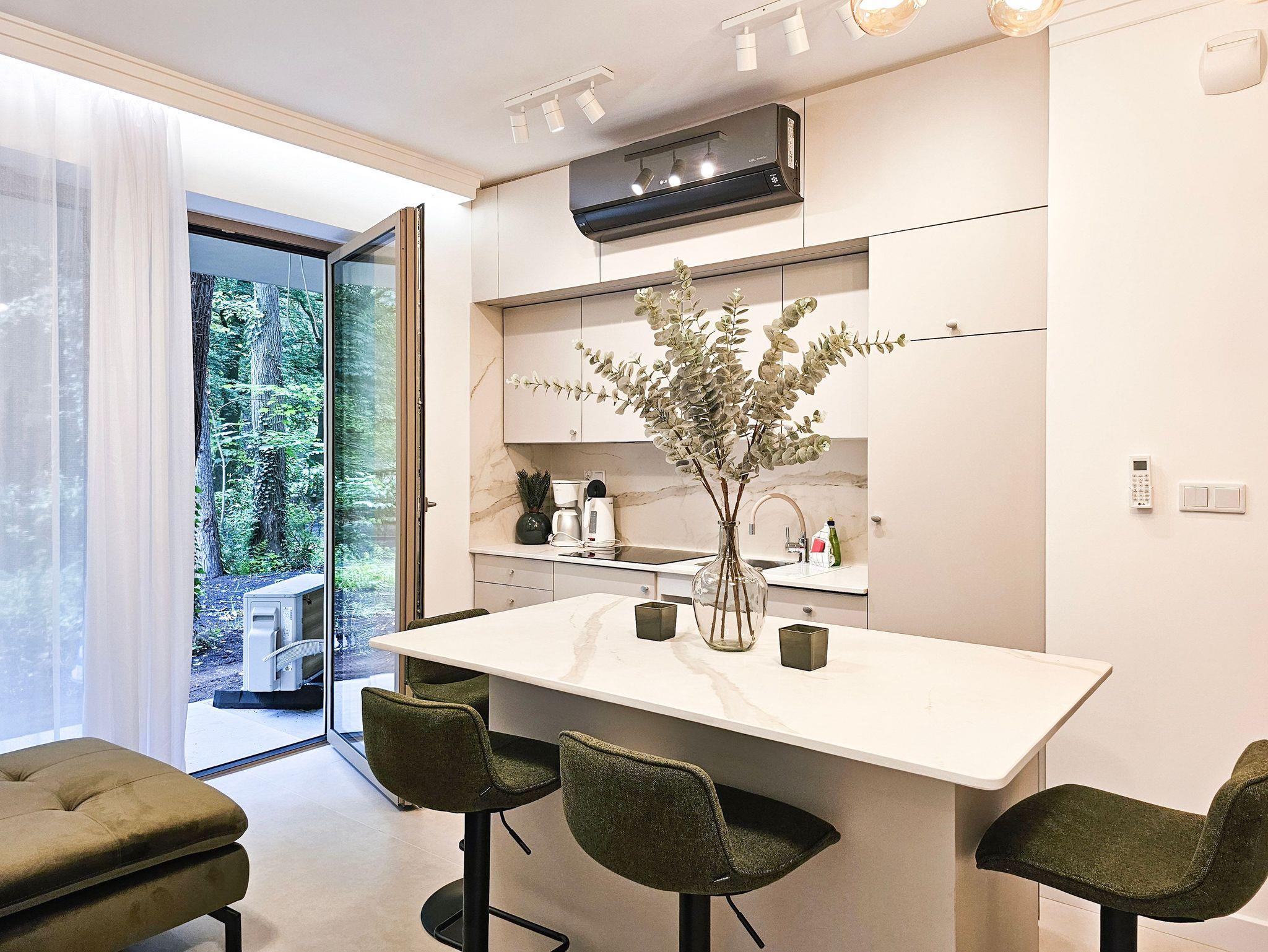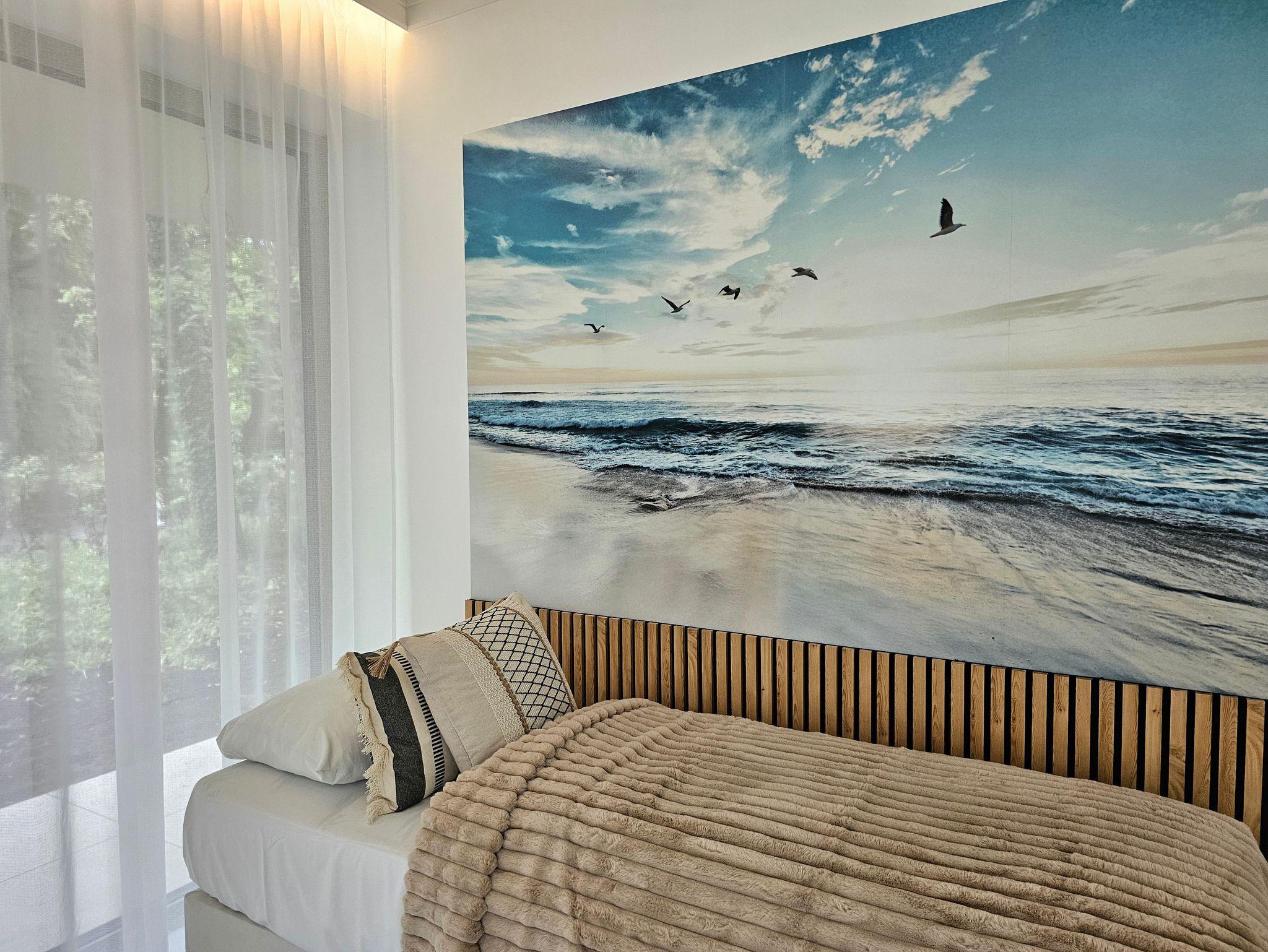 Das 46 m² große Apartment besteht aus zwei Schlafzimmern, einem Wohnzimmer und einer Terrasse. Es ist modern eingerichtet und wurde kürzlich zur Nutzung freigegeben. Im Wohnzimmer befinden sich ein Schlafsofa, ein Fernseher und eine gut ausgestattete Küchenzeile. Den Gästen stehen Geschirr, eine Spülmaschine, ein Backofen, ein Kochfeld, ein Kühlschrank, eine Filterkaffeemaschine, ein Toaster und ein Wasserkocher zur Verfügung.