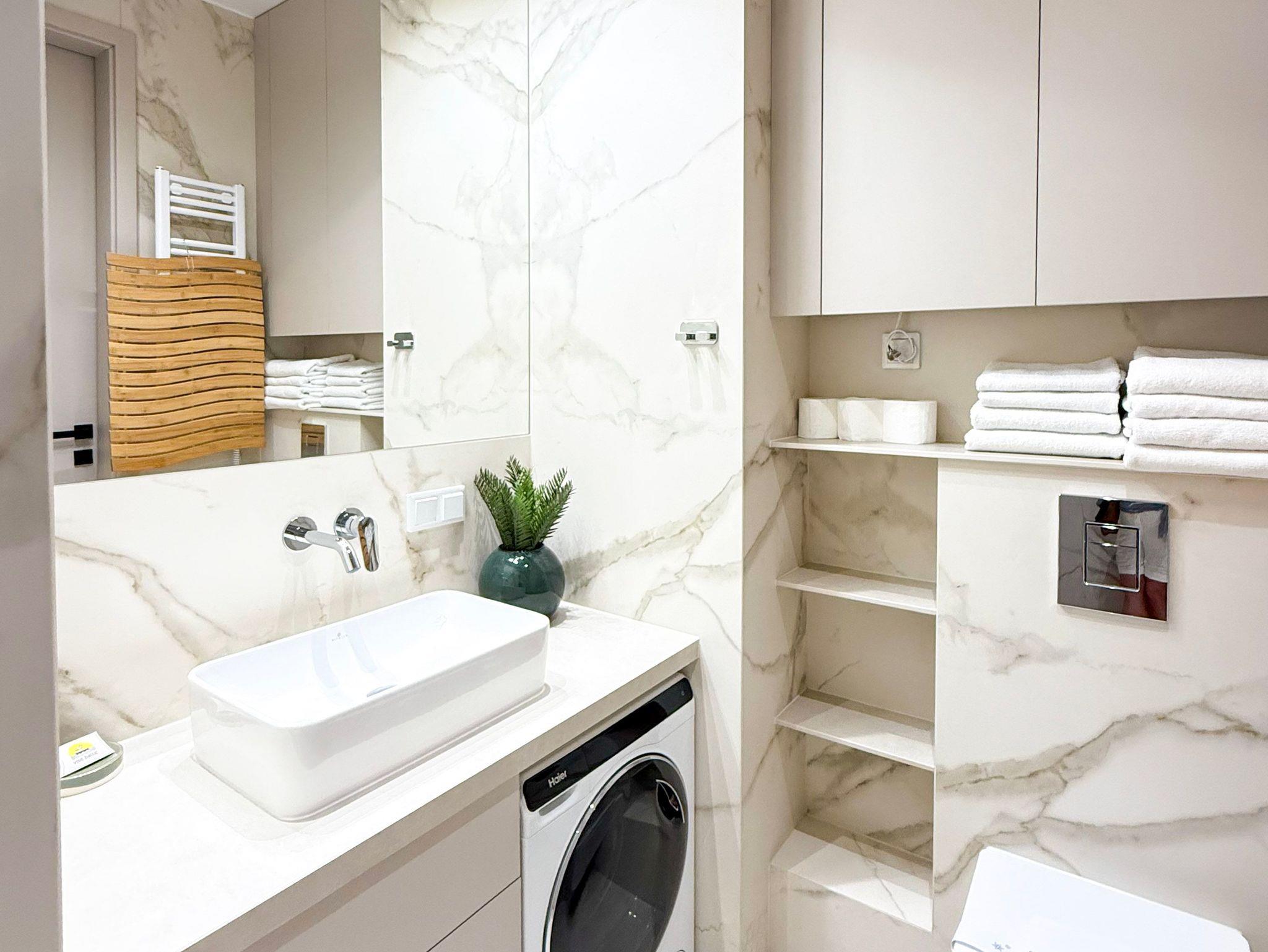 Das Badezimmer ist mit einer ebenerdigen Dusche, einem Waschbecken, einem WC und einer Waschmaschine ausgestattet. Zum Apartment gehört ein Stellplatz in der Tiefgarage. Hunde sind wilkommen.