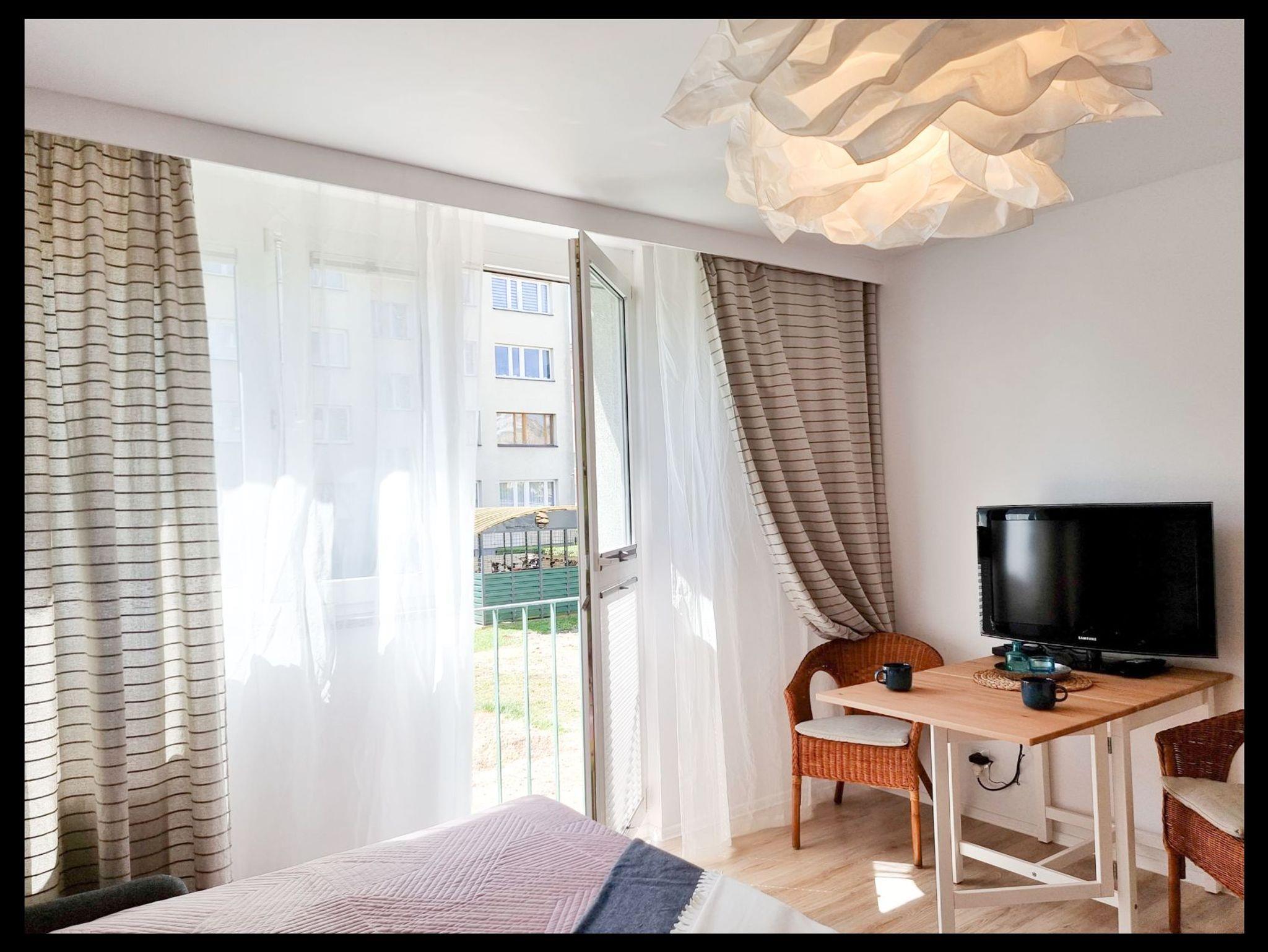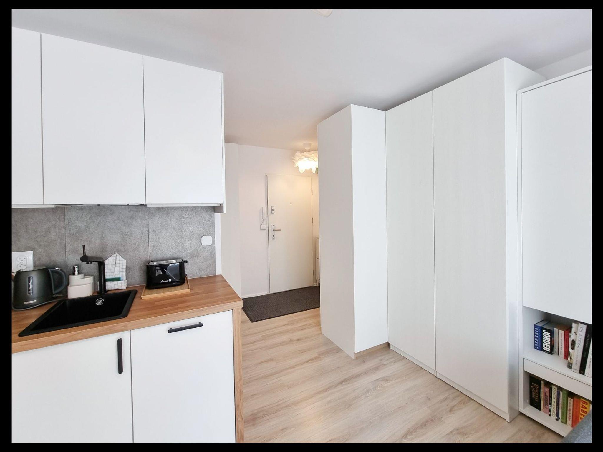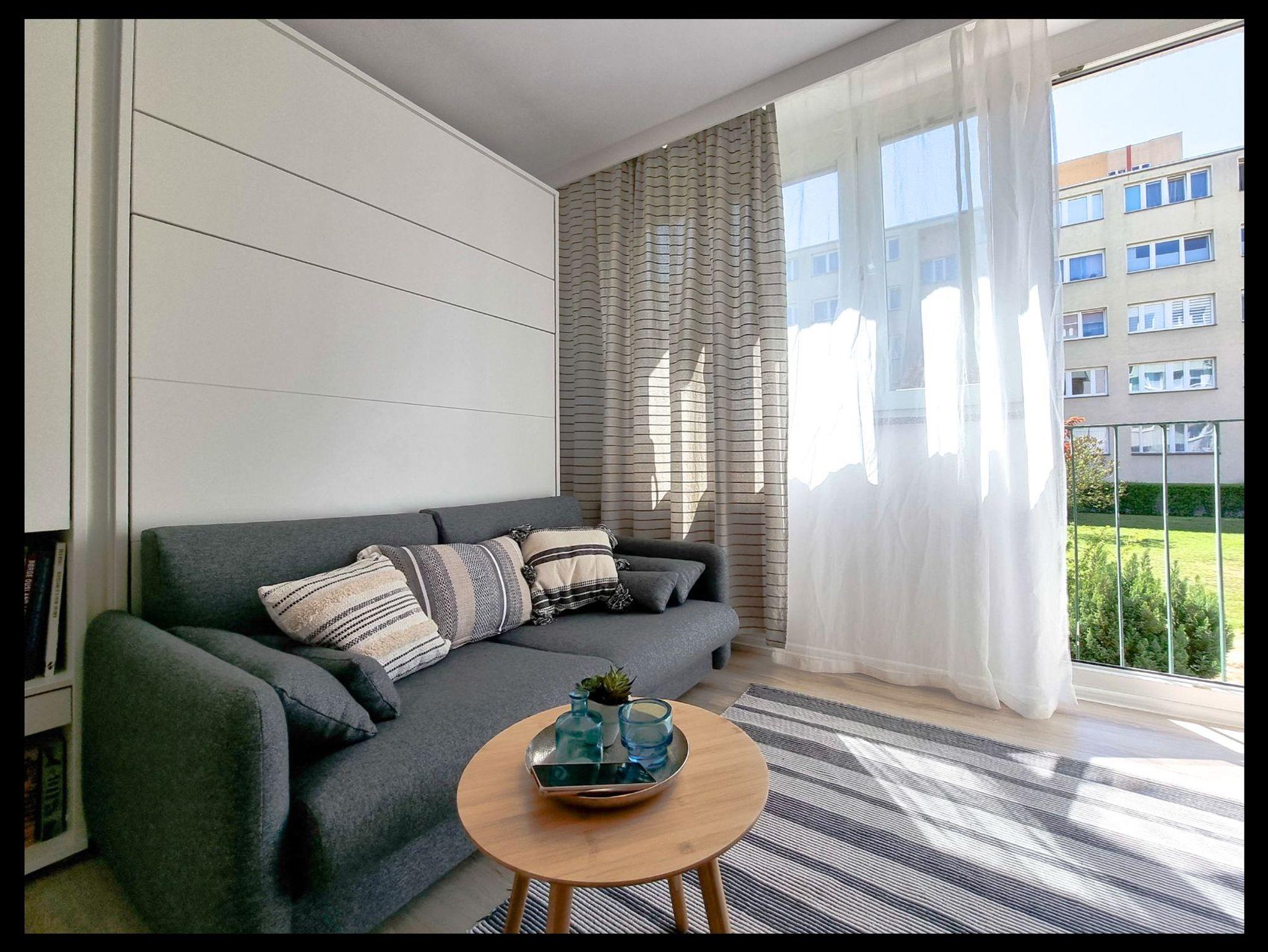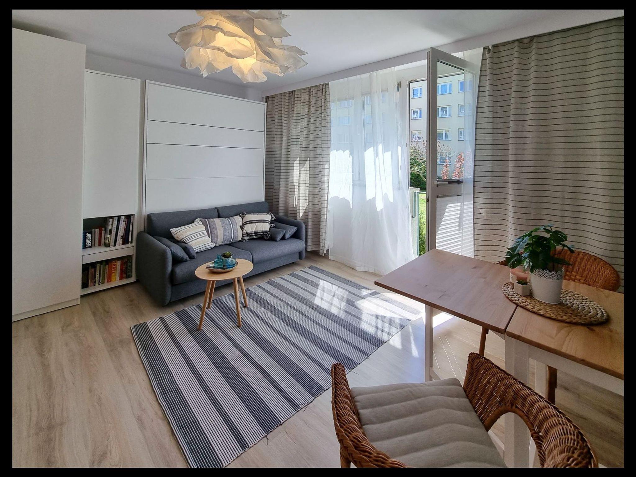 Die Wohnung besteht aus einem Wohnzimmer mit einem Halb-Doppel-Schlafzimmer, so dass der Raum perfekt genutzt wird, hat das Wohnzimmer eine Küchenzeile, einen Tisch mit 2 Stühlen, eine Französisch Art Balkon.