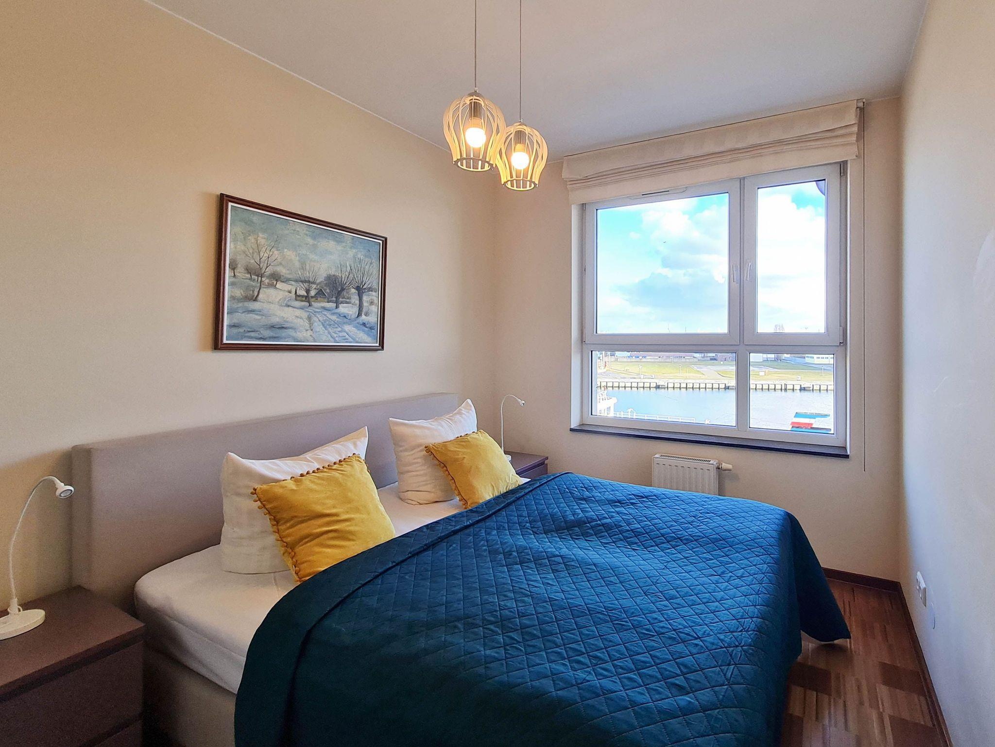 Eine sonnige Zweizimmer- Wohnung im dritten Stock, mit einem Südbalkon von dem sich ein schöner Blick auf die Mündung der Swine und den Hafen ausbreitet. Es besteht aus einem hellen und geräumigen Wohnzimmer verbunden mit einer voll ausgestatteten Küchenzeile (Kühlschrank, Geschirrspüler, Backofen, 4-Platten- Elektroherd, elektrischer Wasserkocher, Kaffeemaschine, Toaster) einem Schlafzimmer mit Ehebett und einem großem Kleiderschrank und einem Badezimmer mit Badewanne, WC und Waschmaschine. Vom Wohnzimmer aus, das eine gemütliche Sofa 140x210cm, einen Esstisch mit vier Stühlen, einen Couchtisch, Fernseher und einen TV- Regal beinhaltet, kann man auf einen möblierten Balkon rausgehen. Die Fenster sind nach Süden gerichtet. Zur Verfügung der Gäste WLAN.