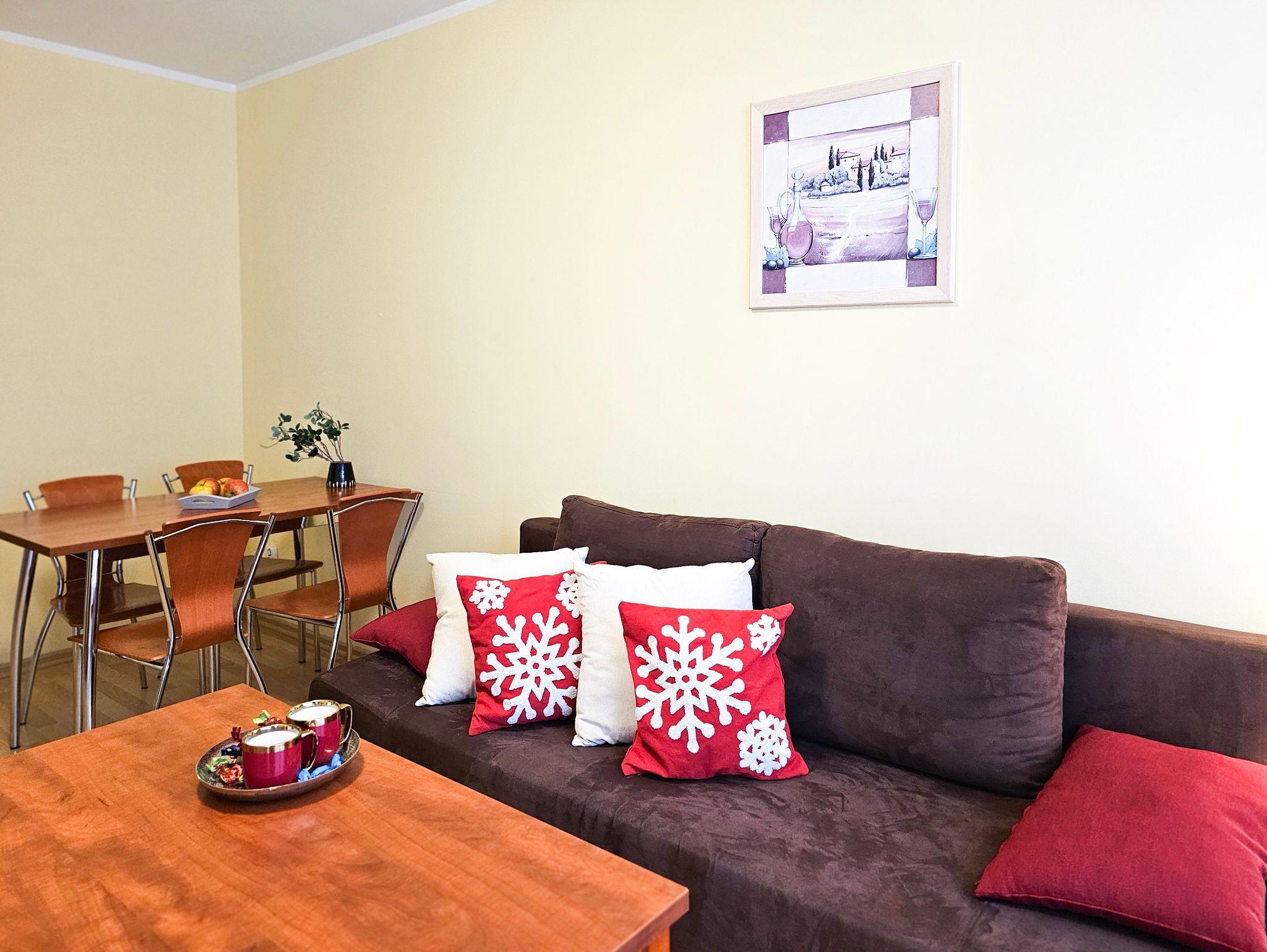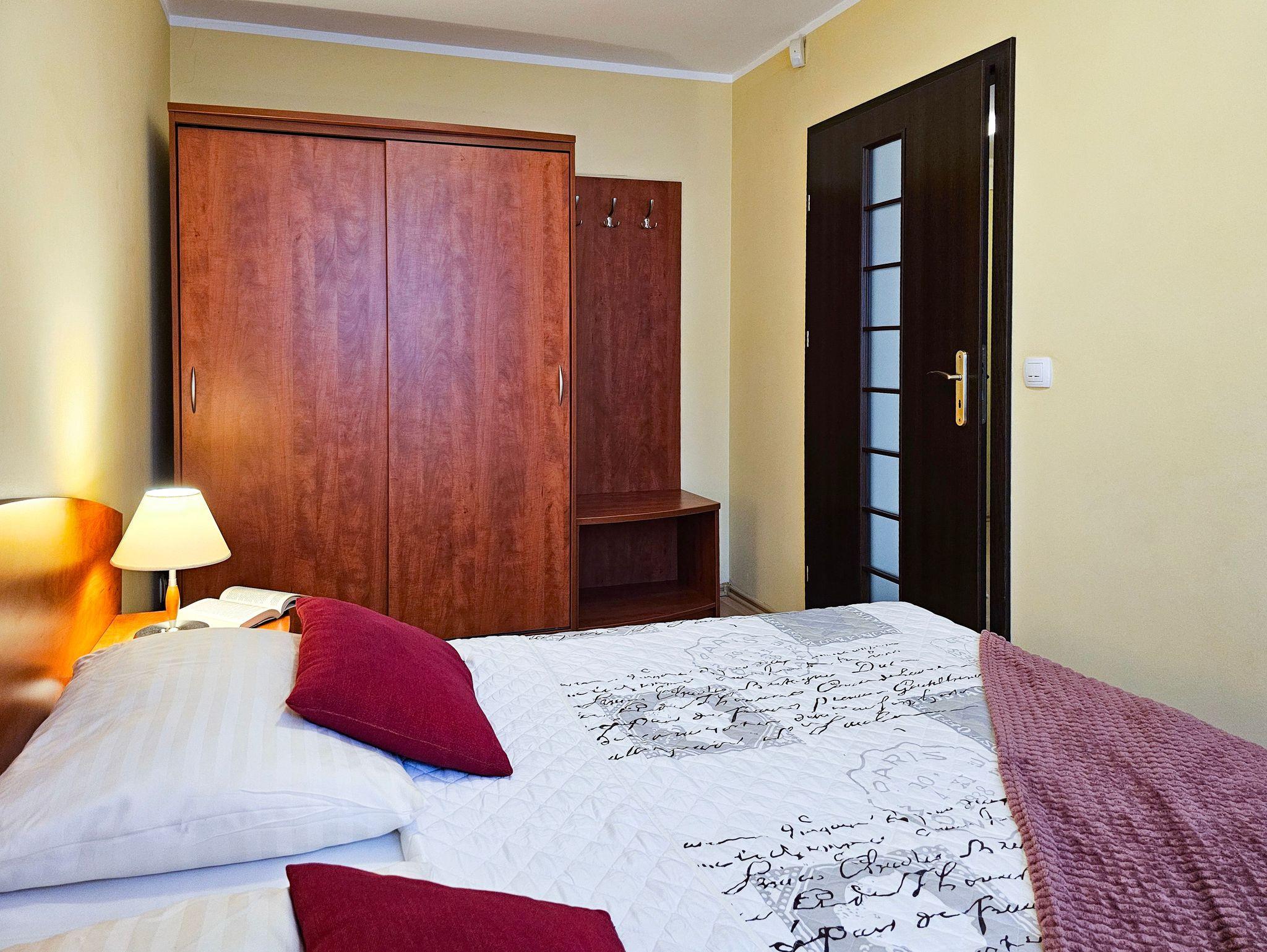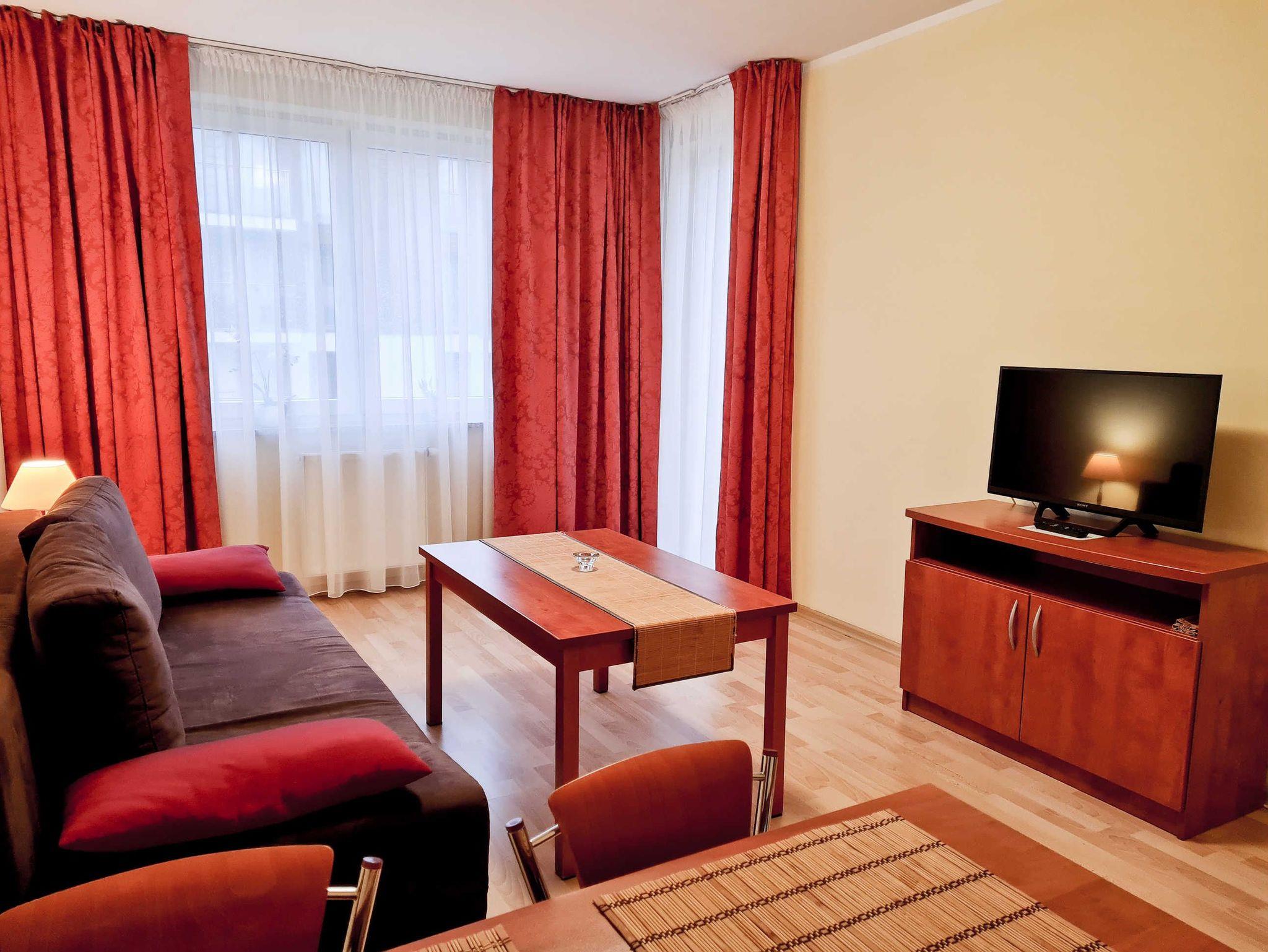 Schlafzimmer mit einem Doppelbett (160x200cm), Nachttischen, einem Kleiderschrank. Wohnzimmer mit Balkon und einem Tisch mit vier Stühlen. Die Wohnung hat der Balkon. Die Fenster und Balkon nach Nord ausgerichtet sind. Badezimmer mit Dusche, WC und Waschbecken.