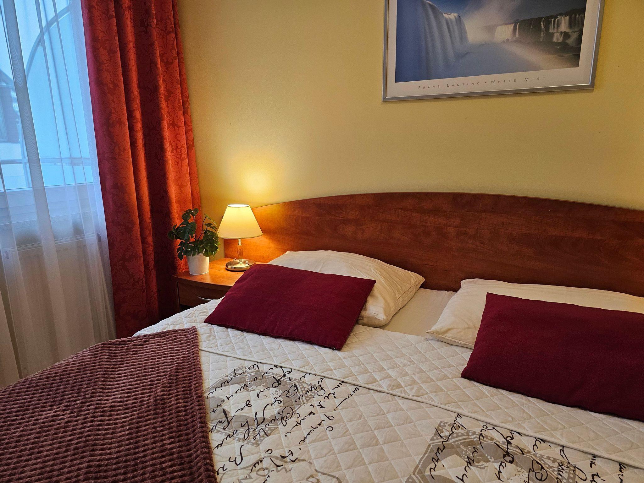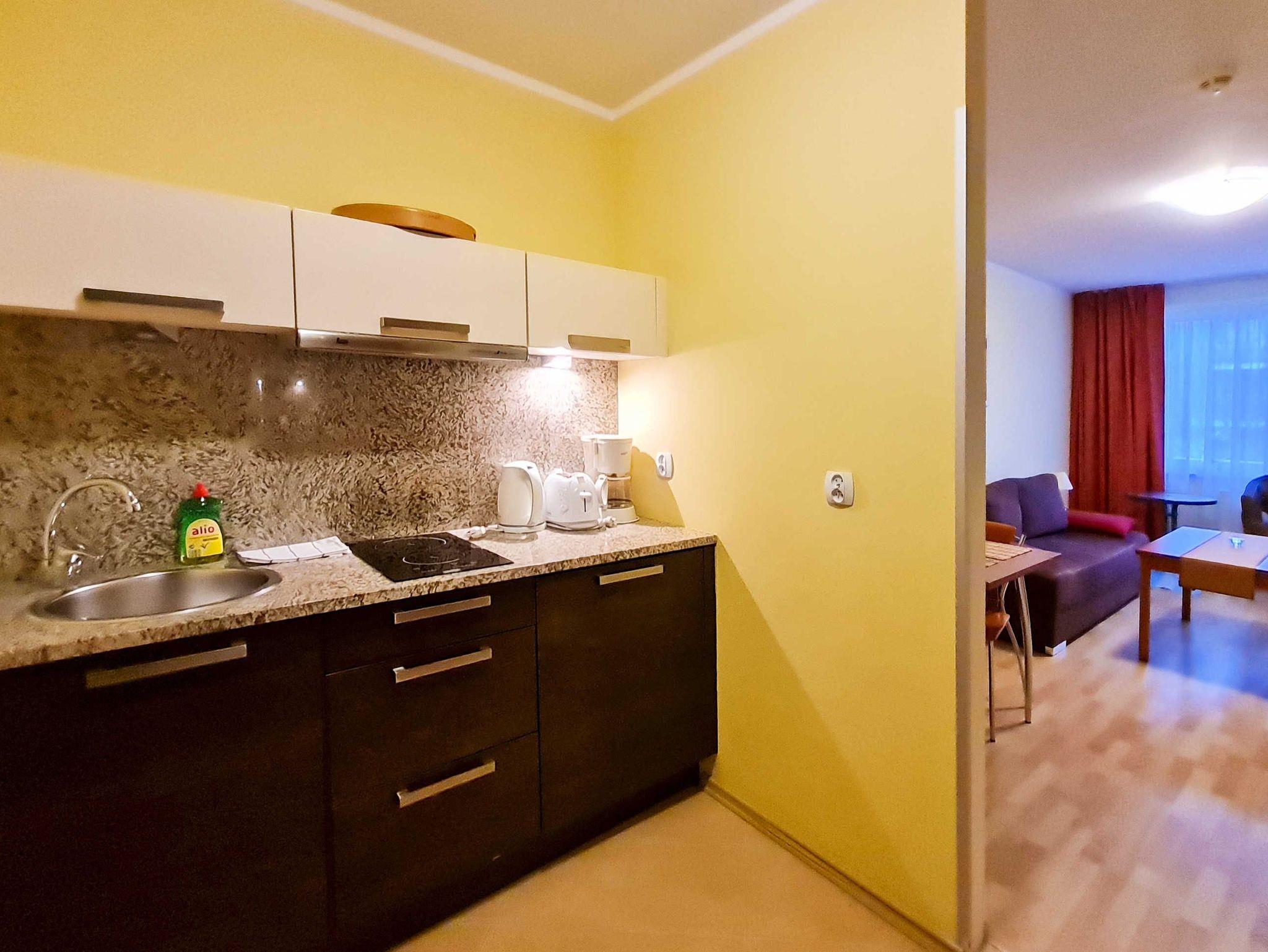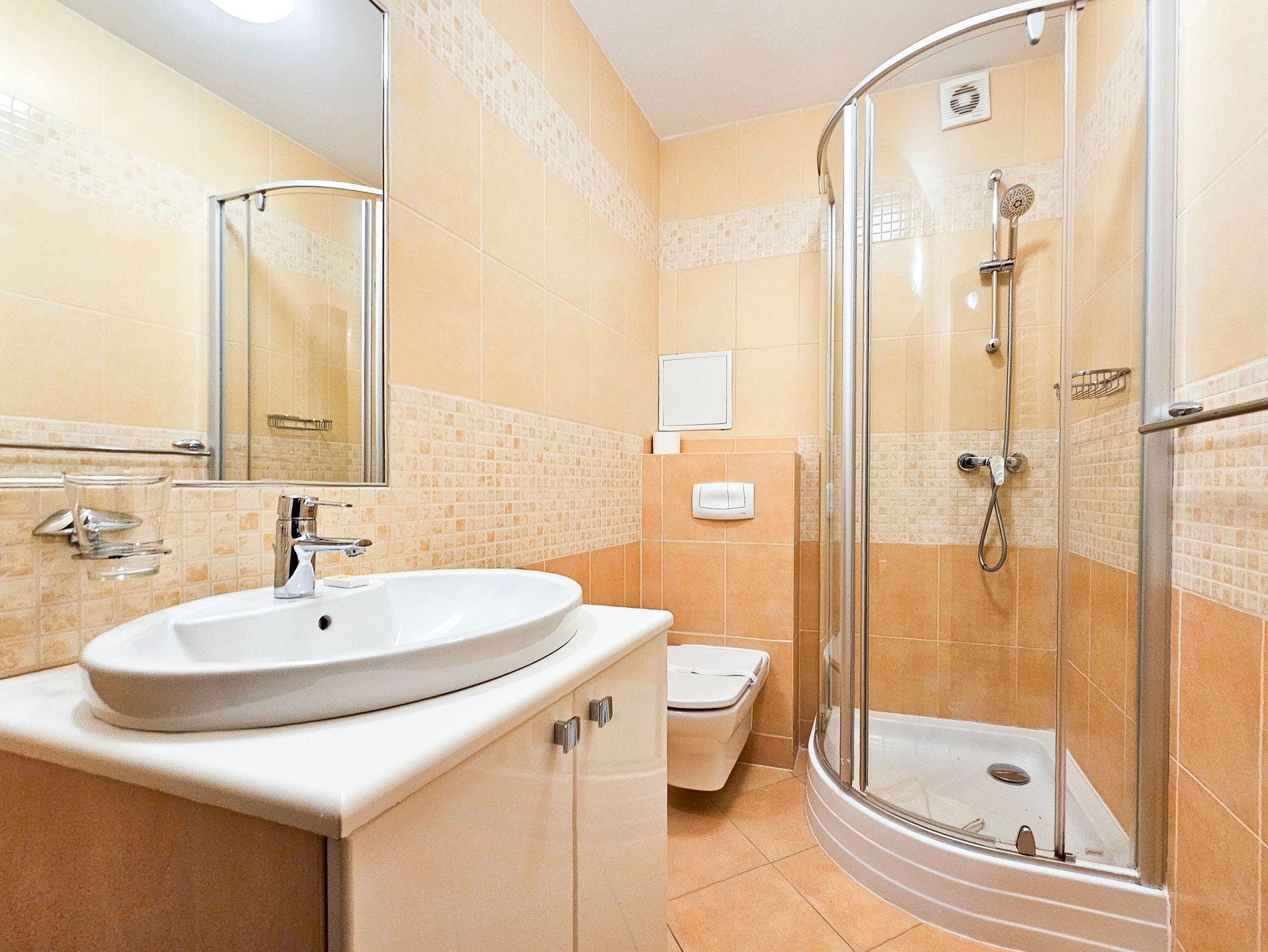 Schlafzimmer mit einem Doppelbett (160x200cm), Nachttischen, einem Kleiderschrank. Wohnzimmer mit Balkon und einem Tisch mit vier Stühlen. Die Wohnung hat der Balkon. Die Fenster und Balkon nach Nord ausgerichtet sind. Badezimmer mit Dusche, WC und Waschbecken.