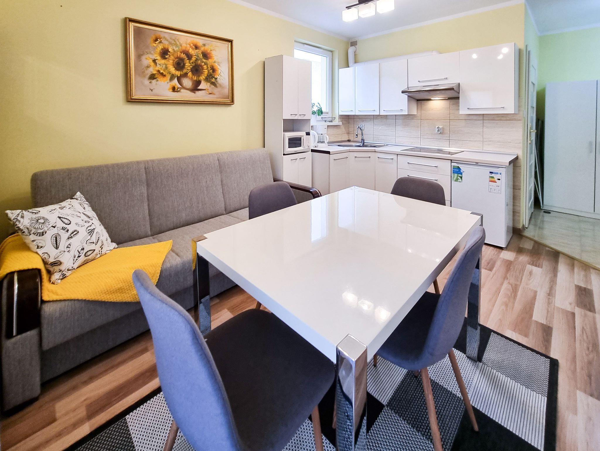 Das Wohnzimmer mit Küchenzeile, verfügt über einen Esstisch mit 4 Stühlen, eine Kommode, einen LCD-TV und eine Schlafcouch.