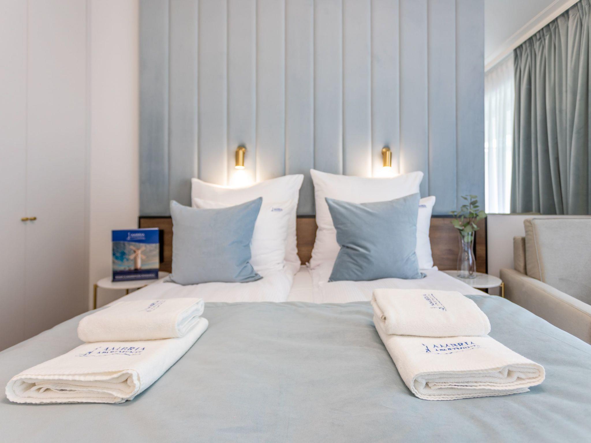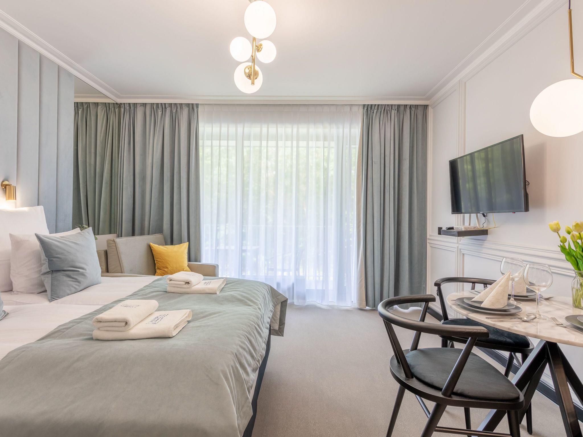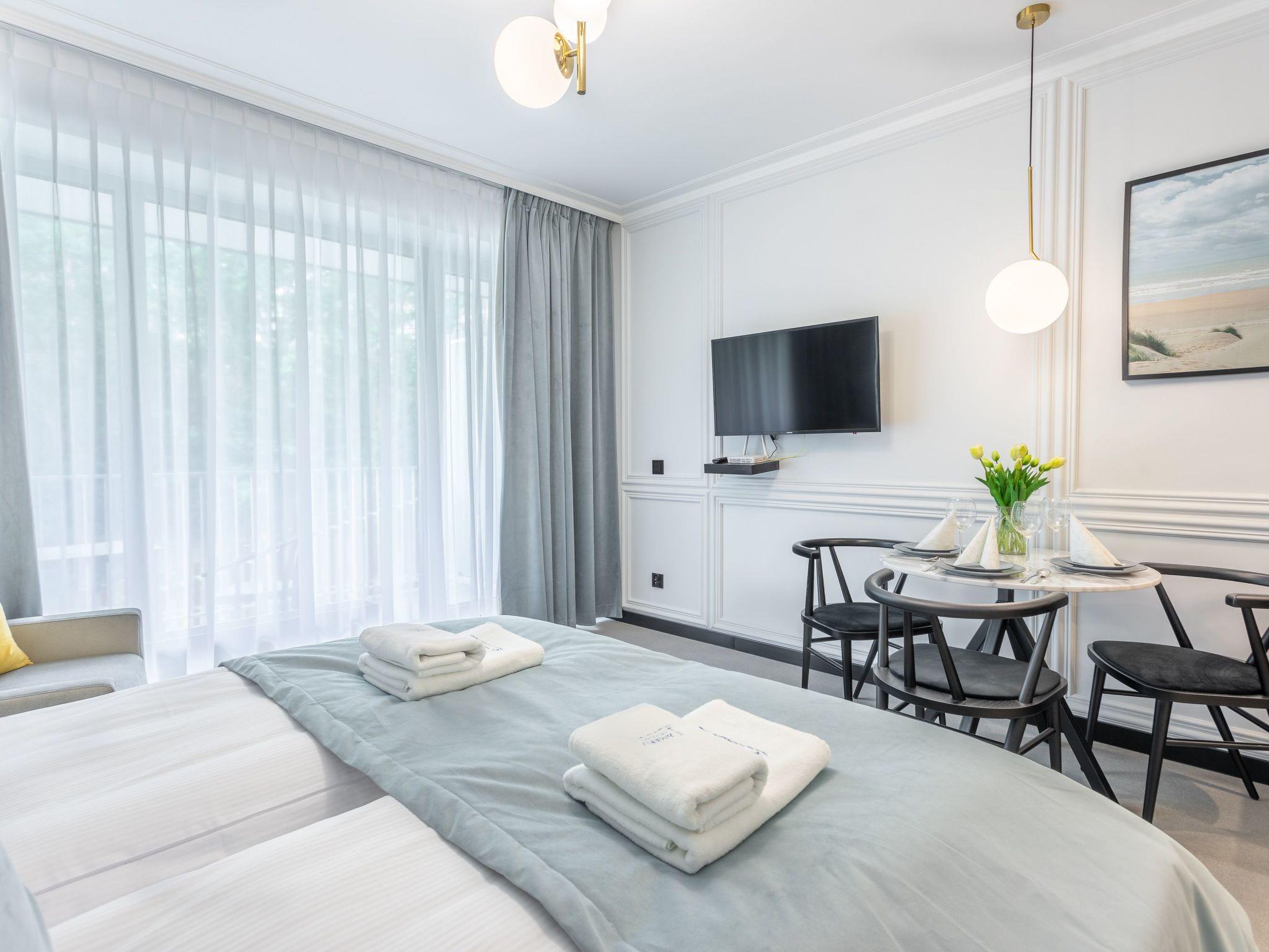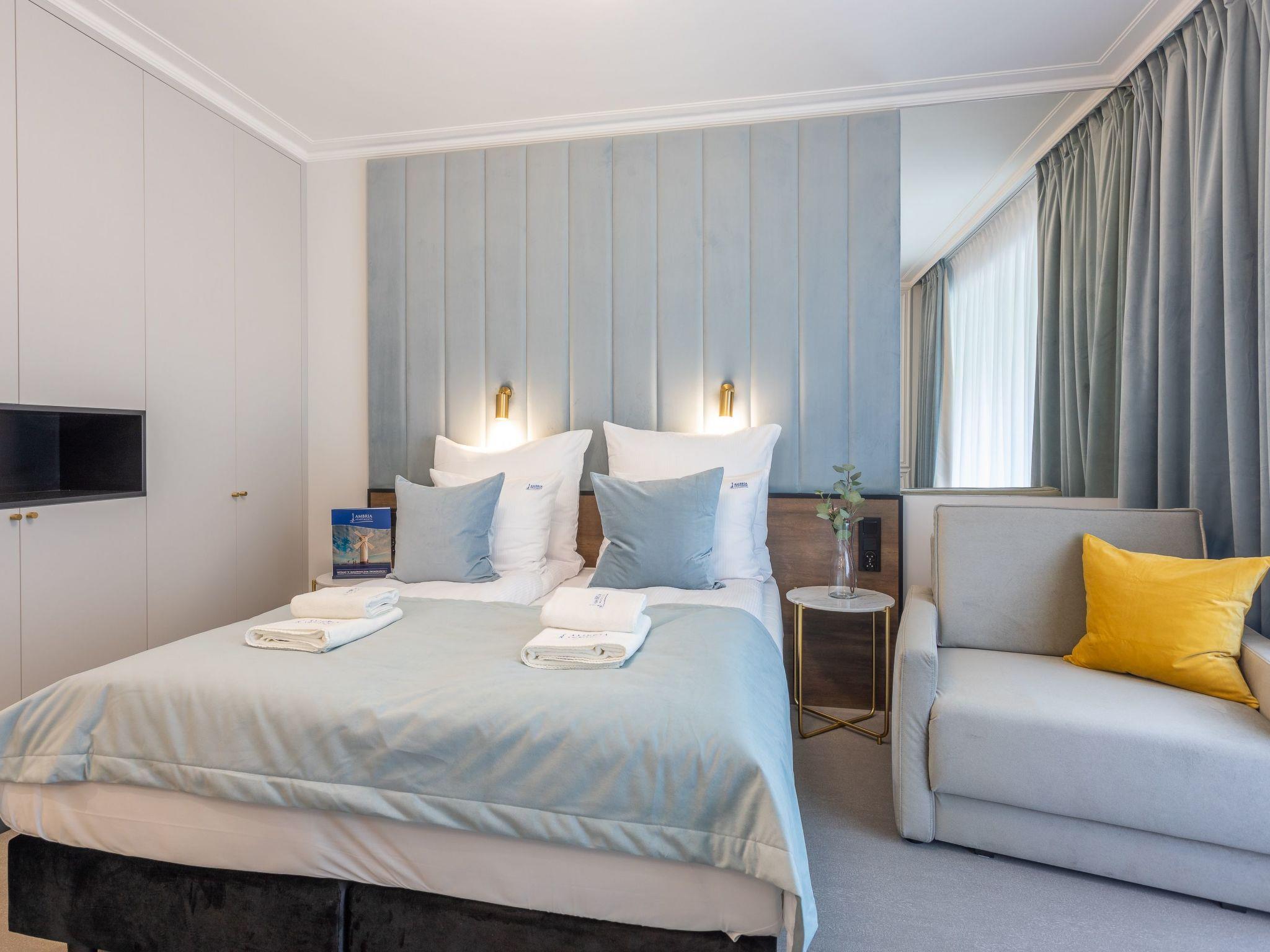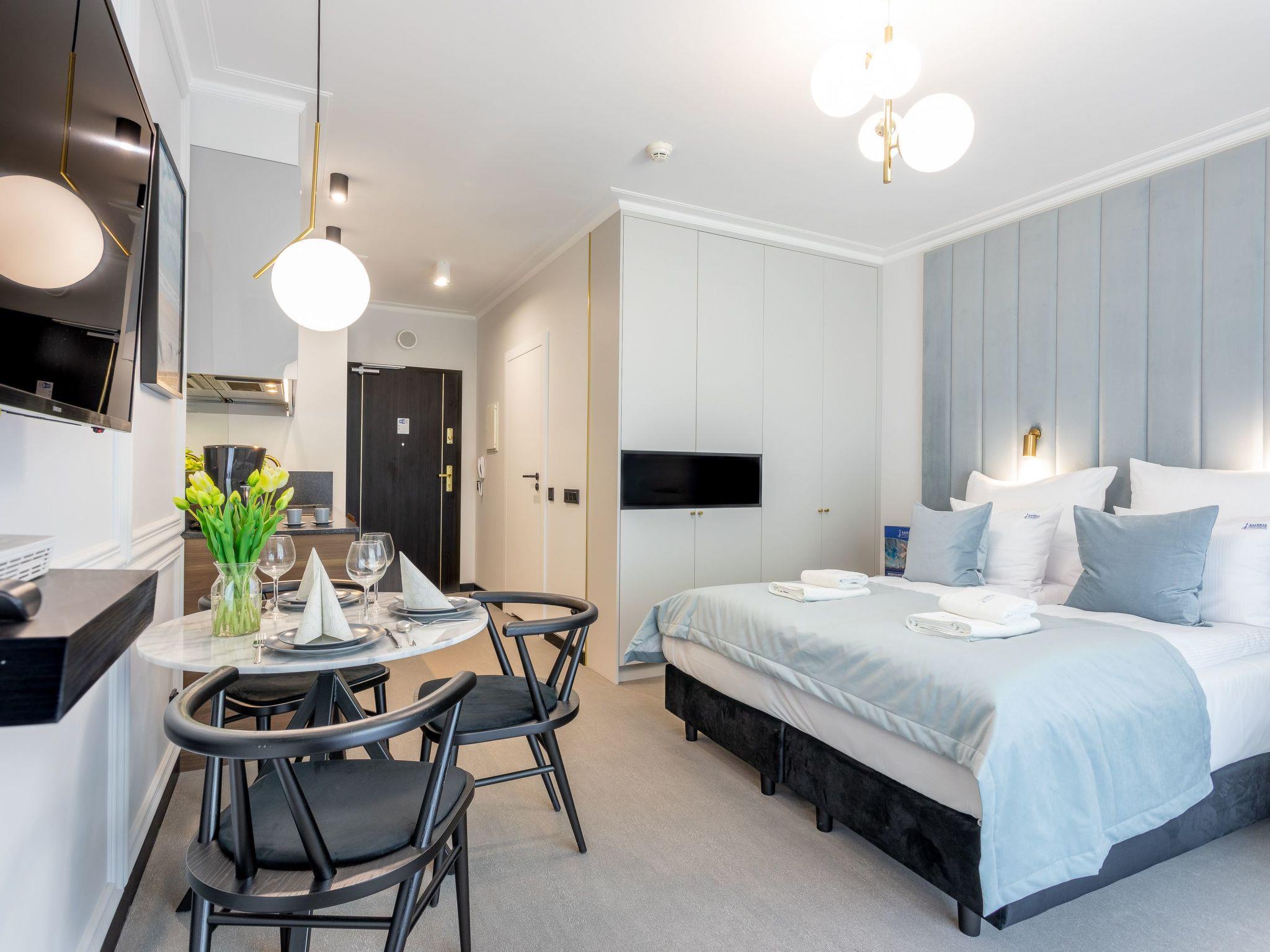 "Lividus 121" in Swinoujscie is a very elegant flat in an exclusive apartment building from 2021 with a restaurant and a café. It consists of a living, dining and sleeping area, a fully equipped kitchenette and a spacious bathroom with a total area of 28 m2. Another advantage is the balcony, which is a practical and functional extension of the flat and allows moments of relaxation in the fresh air. Comfortable and convenient furnishings guarantee a pleasant stay, both for private and business purposes. The interior is charming, tasteful and cosy: full of bright, warm tones that, together with modern furniture and elegant accessories, create an exquisite yet minimalist whole where you can rest and actively indulge in your interests and passions. A beautiful decoration on the wall, just behind the headboard, emphasises the charm of this place and ... ignites the senses.