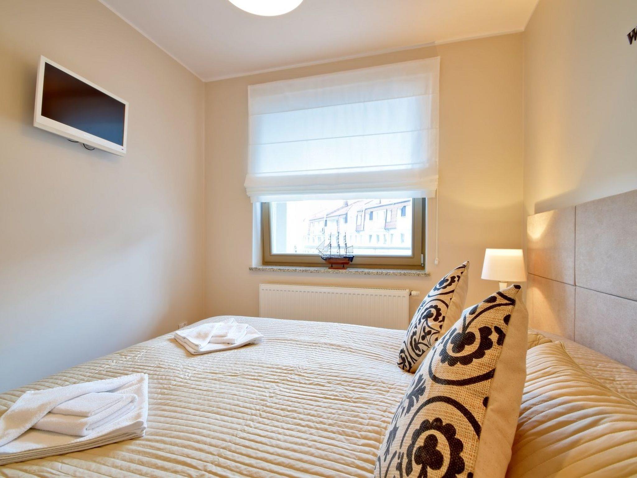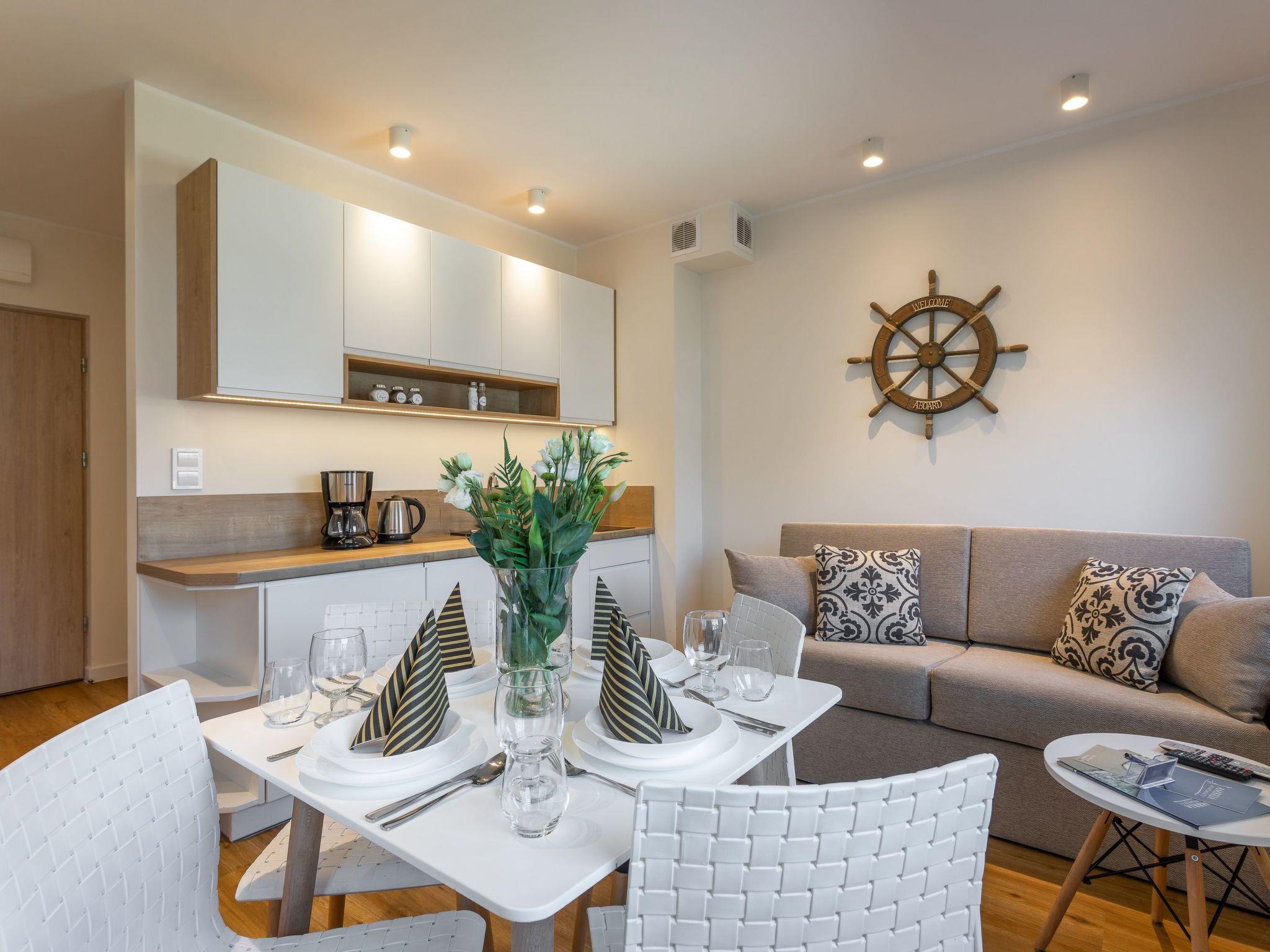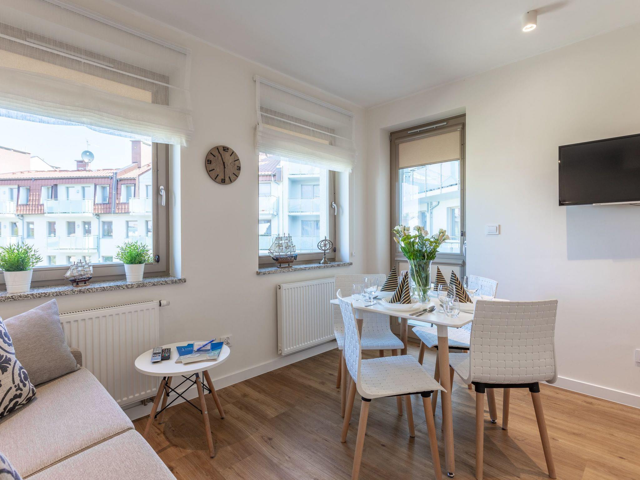 It is a flat with very spacious bedrooms, living room with well-equipped kitchenette, dining area and modern bathroom with total area of 29 m2. A very comfortable double bed in the bedroom and a sofa with a sleeping function and an Italian folding frame ensure a good night's sleep, and it is a very functional, comfortable and bright flat. White, grey and light wood tones dominate, warming up the room and giving it a cosier character. The interior is also characterised by harmony, simplicity, moderation and classic proportions that create a timeless decor. Perfect for people who appreciate tradition and simplicity with a touch of rigour, like on board a ship setting off on a longed-for voyage.