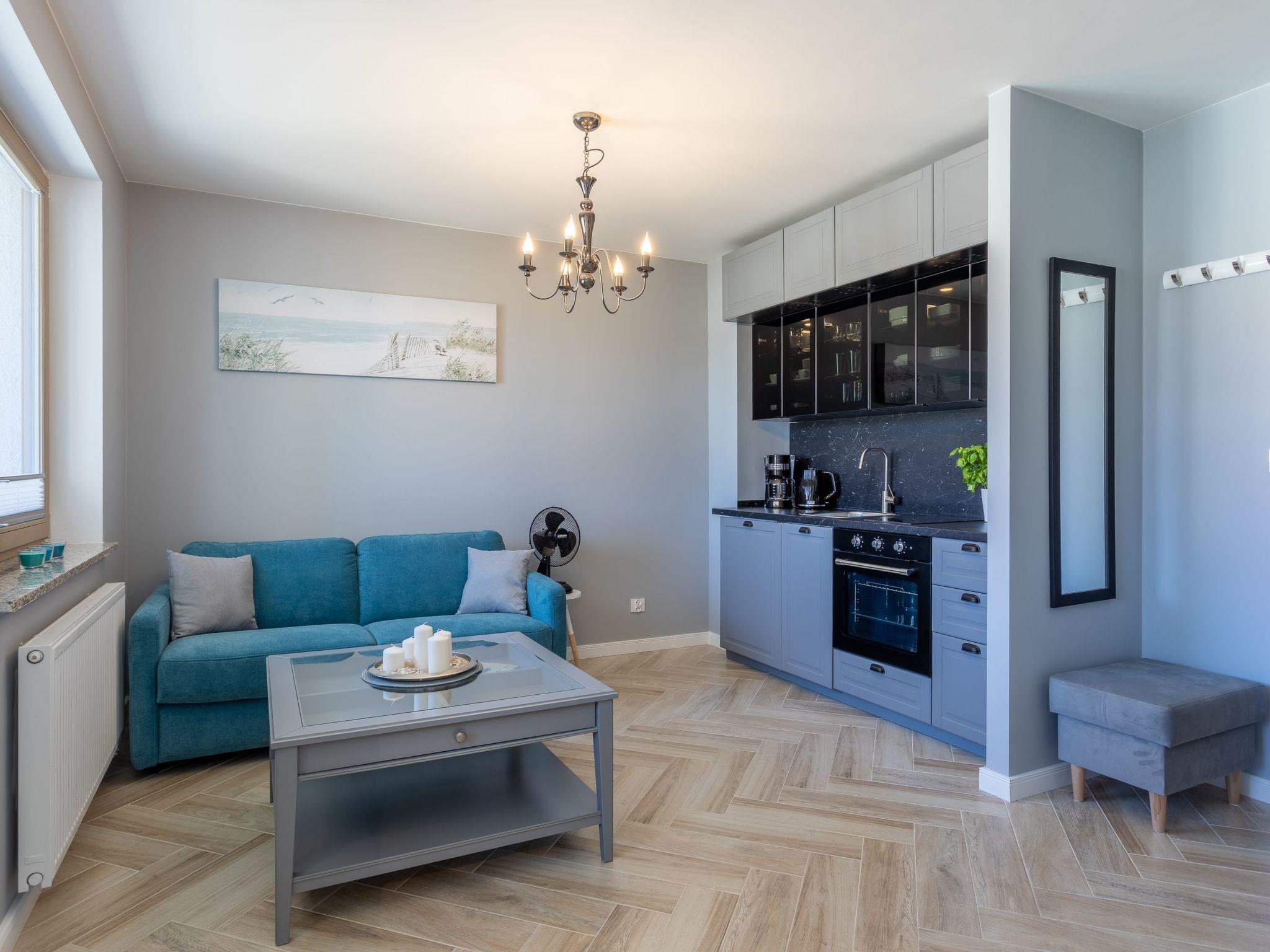 It is a flat with a very spacious bedroom, living room with a well-equipped kitchenette, dining area and modern bathroom with a total area of 29 m2 and a balcony. A comfortable double bed in the bedroom and a sofa with sleeping function and Italian folding frame ensure a good night's sleep. "Maritime" is a stylish, classic interior in shades of white, grey and blue. They are characterised above all by elegance, comfort and good taste as well as dimensional accuracy and symmetry, which form a harmonious whole. Since no equipment has been placed there by mistake, the room is primarily functional and offers comfort for guests who value peace, harmony, minimalism and aesthetics in the furnishings. Perhaps a nap after dinner on a super-comfortable sofa with an additional sleeping function? Why not, especially when the colour blue is so vibrant and soothes the senses like wind, sky and sea ...