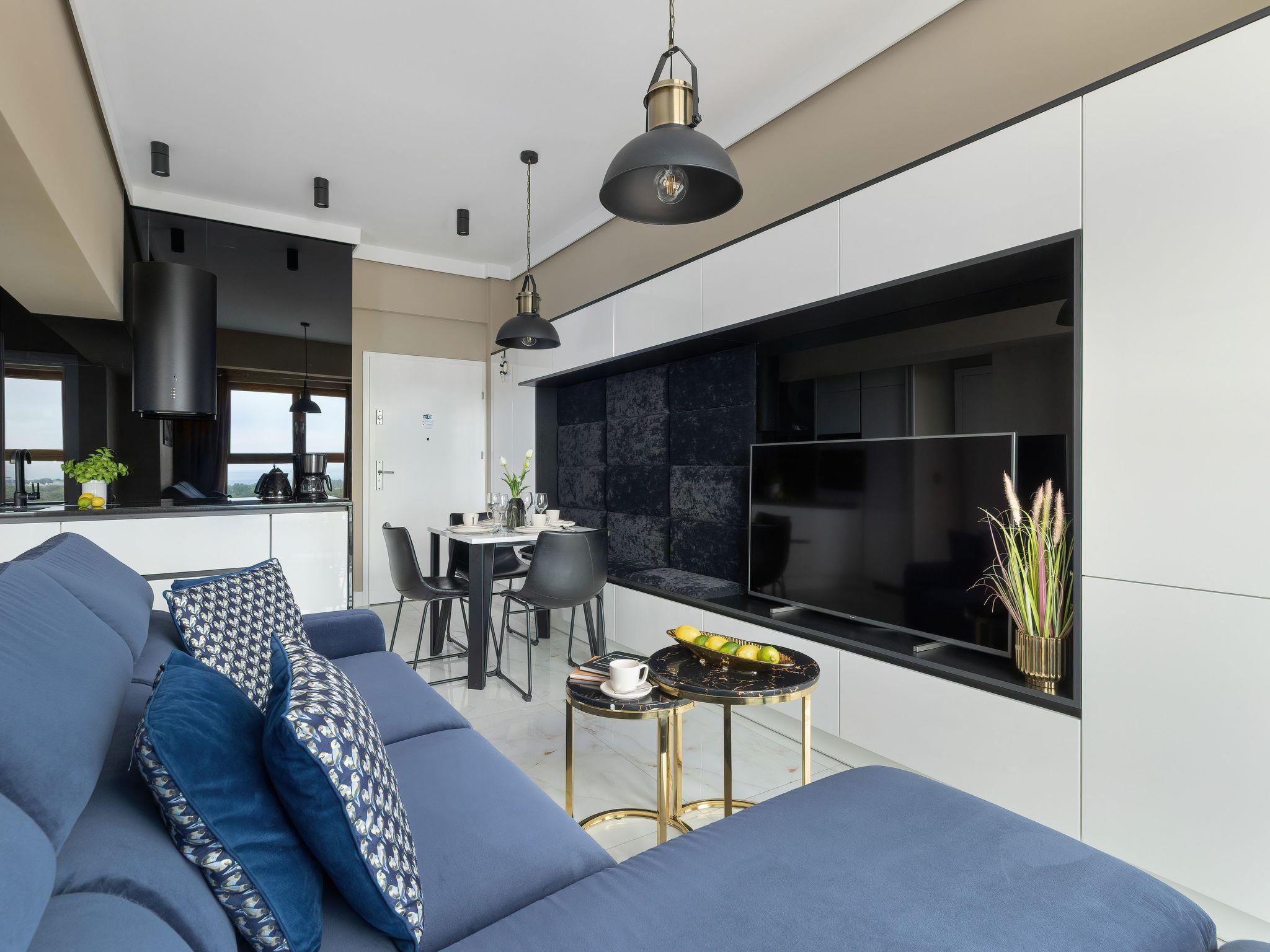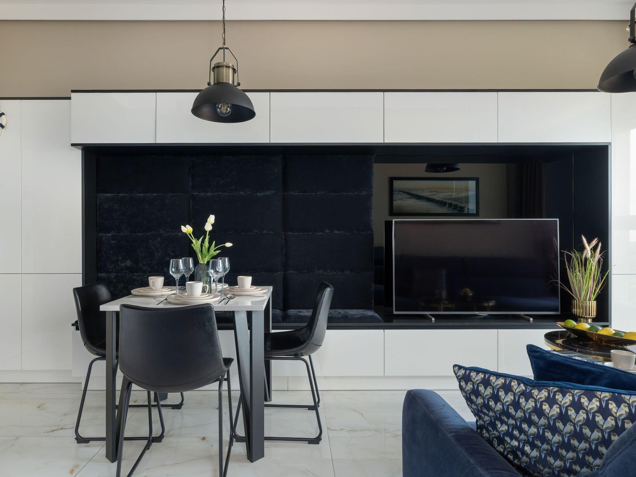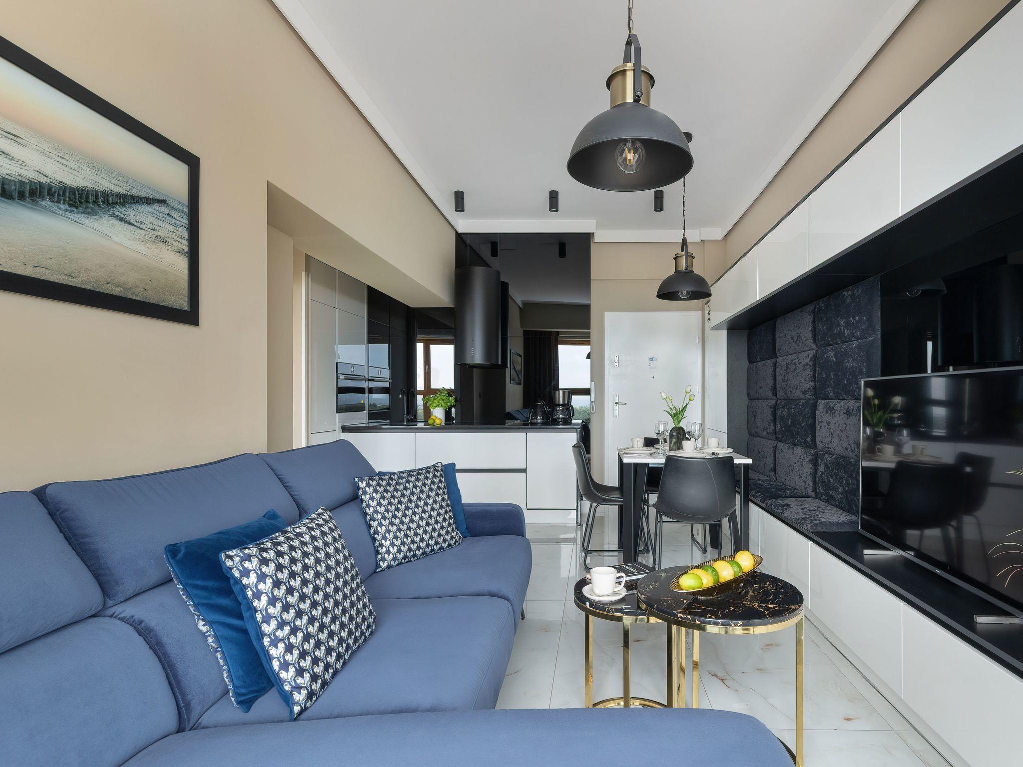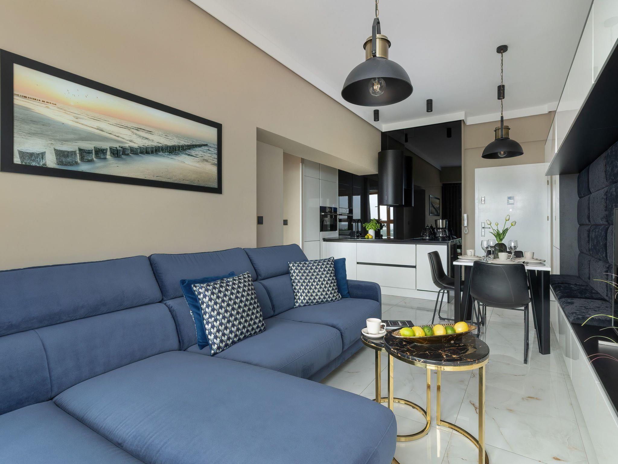 Upon entering the 37 m² flat, it is immediately clear that the interior has been designed with the utmost care. The harmonious blend of light white and beige tones, combined with golden details and modern black accents, is reminiscent of soft sandy beaches while exuding elegance. Large windows optimise the brightness of the room and emphasise the beach-inspired furnishings. With a comfortable bedroom with a large double bed, an inviting living room with a sofa bed, a fully equipped kitchenette and an elegant bathroom, the flat is perfect for couples, families or those planning a longer stay at the Baltic Sea.