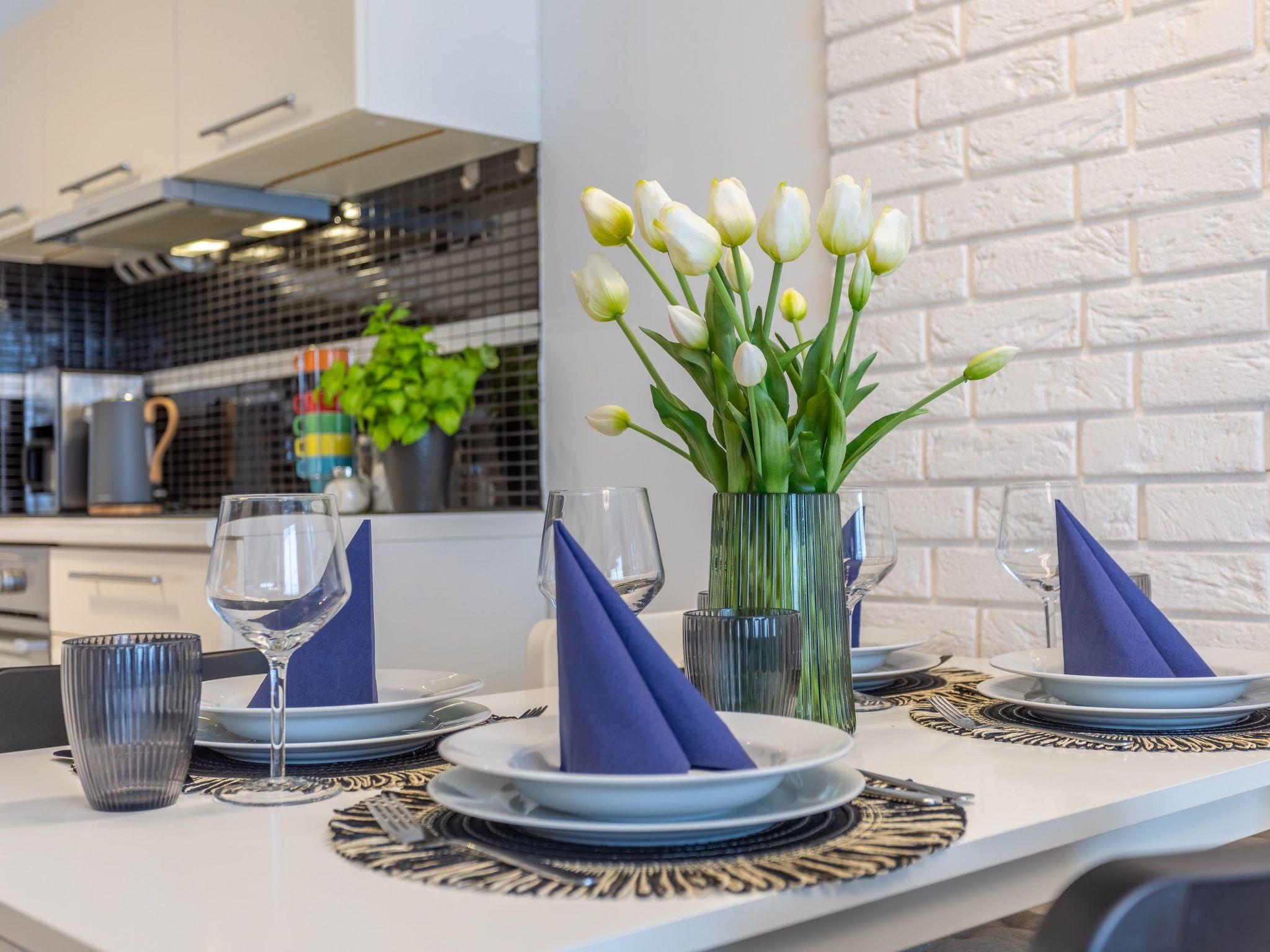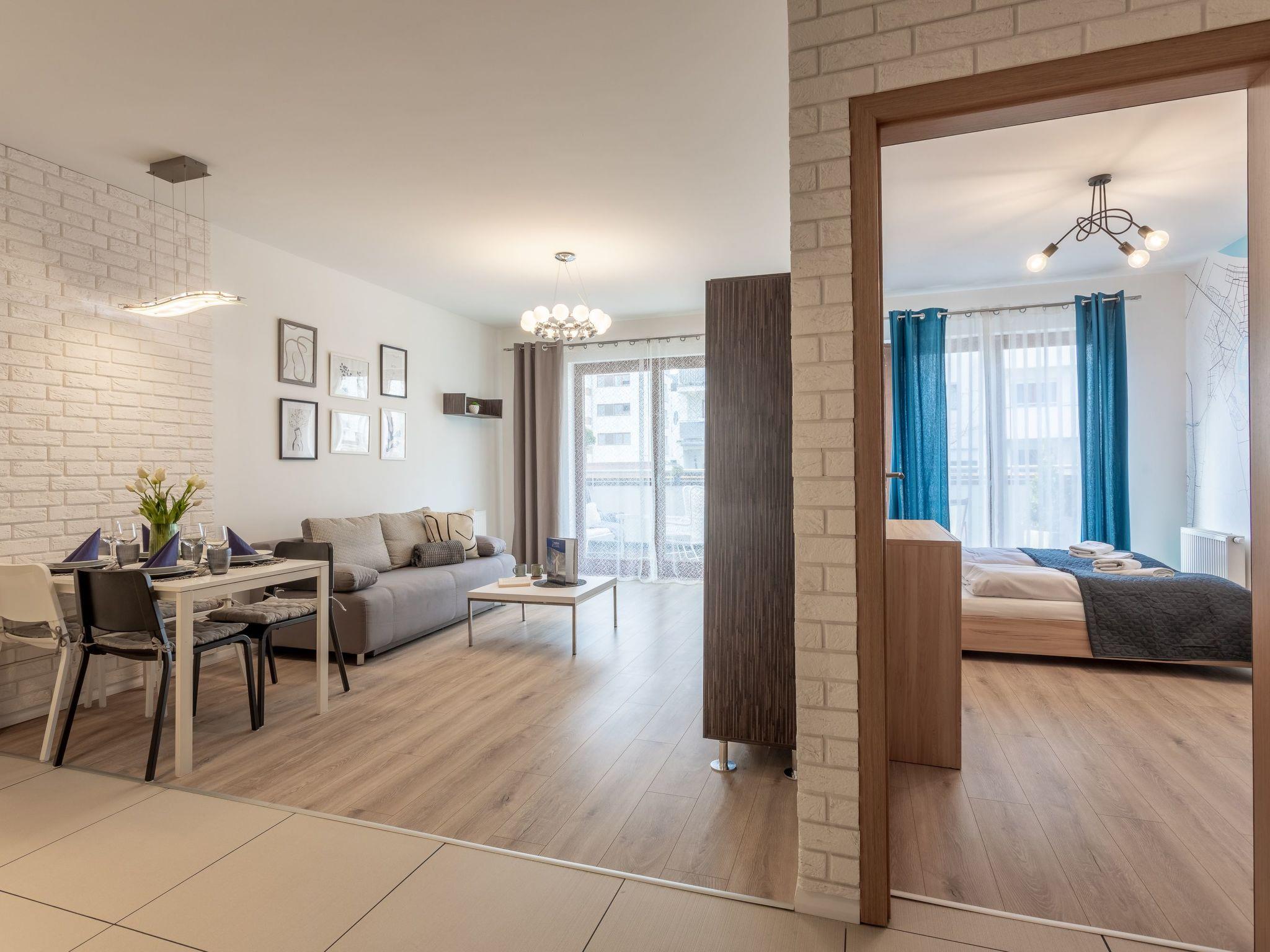 It is a very spacious and fully equipped flat with bedroom, living room with kitchenette and bathroom with total area of 48 m2 and a large terrace with a sofa set. It is the perfect place to feast with your loved ones and spend long summer evenings in comfort. The interior is dominated by light, extremely soft colours: Blue, grey and beige. Numerous textile and decorative accessories complement the room and make you feel at home.