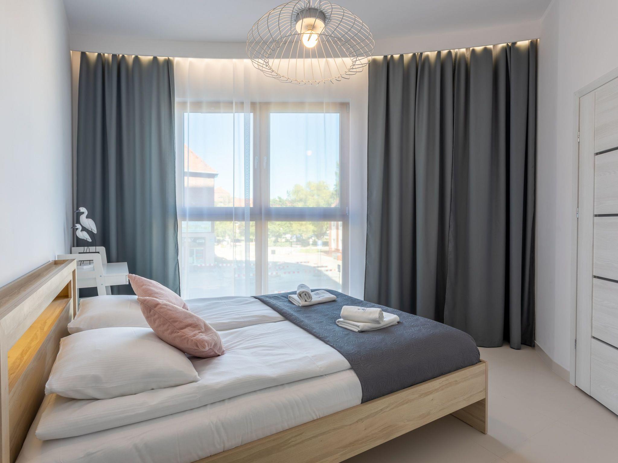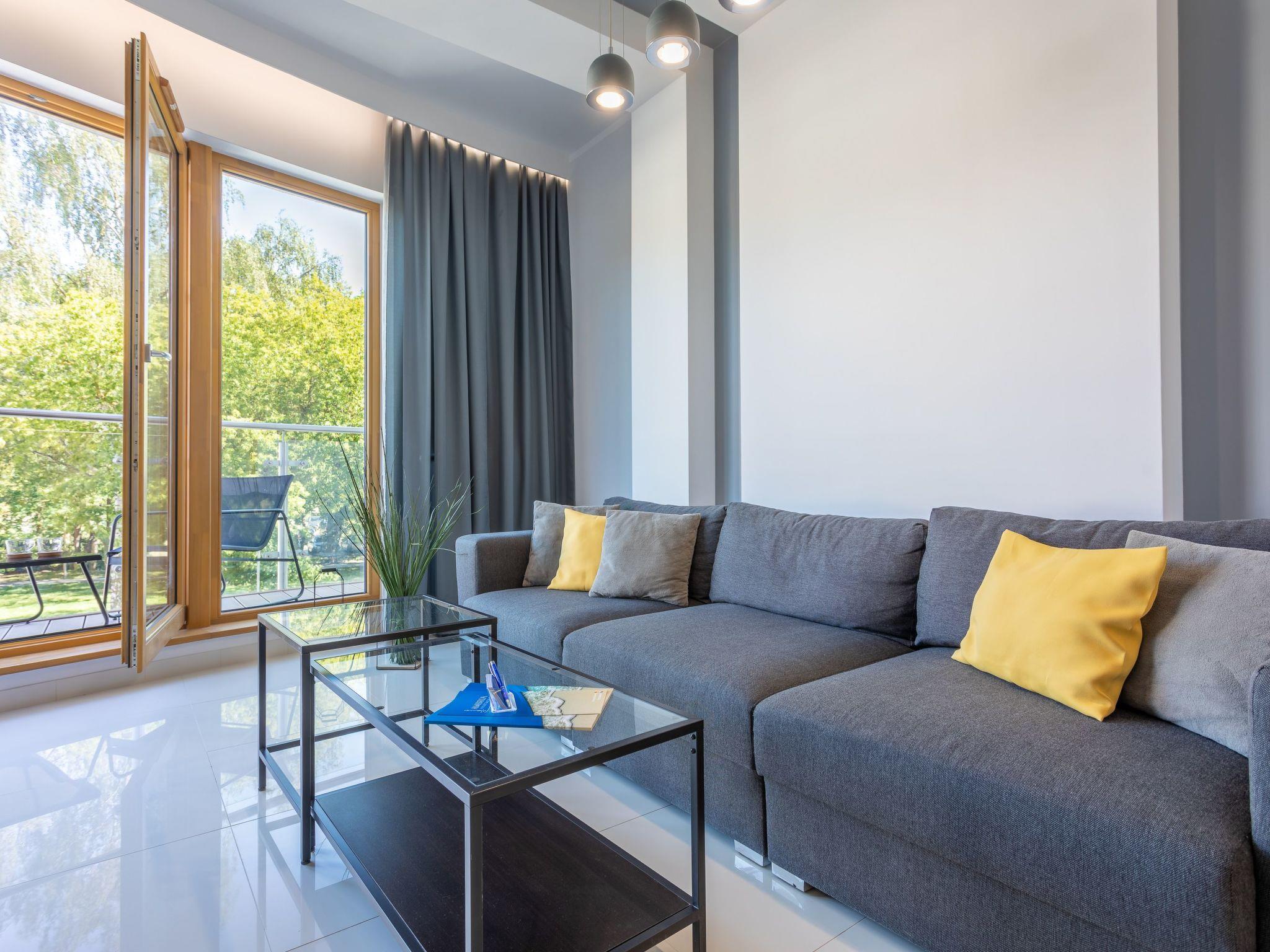 It is a very spacious and luxurious flat on the first floor with two large bedrooms, a dressing room, a living room with a well-equipped kitchenette and a bathroom. Its total area is 70 m2. The usable area is extended by the balcony, where you can spend pleasant moments while enjoying a cup of freshly brewed coffee or a glass of your favourite wine and enjoying the sea air. The flat is furnished in a minimalist style with expressive glamour motifs: The eye is dominated by muted colours, grey, beige and white with a balanced yellow accent like a ray of sunshine, as well as beautiful wooden details, furniture discreetly smuggled into modernity or accessories that warm up the interior and delight with their texture and unconventional look. In addition, high-gloss lacquered furniture not only lends elegance and a certain lightness to the individual elements of the interior, but also brings an informal style to the room and perfectly complements the arrangement. As a result, this extremely spacious flat radiates calm and promises cosiness and relaxation. Here, attention is paid not only to the aesthetic value of the room, but also to the individual needs of the guests, with functional furniture such as a spacious sofa, large and comfortable beds and a dressing table.