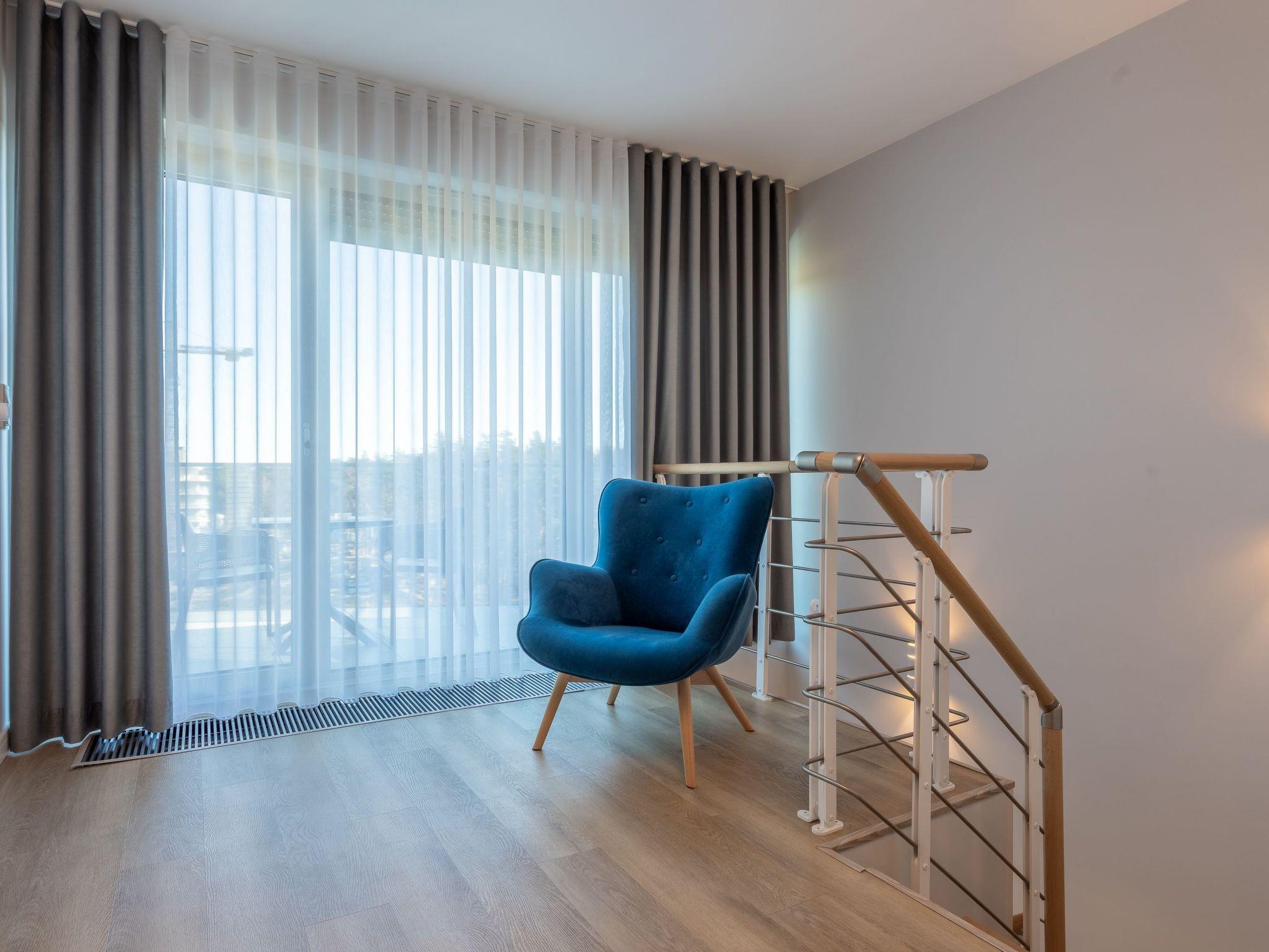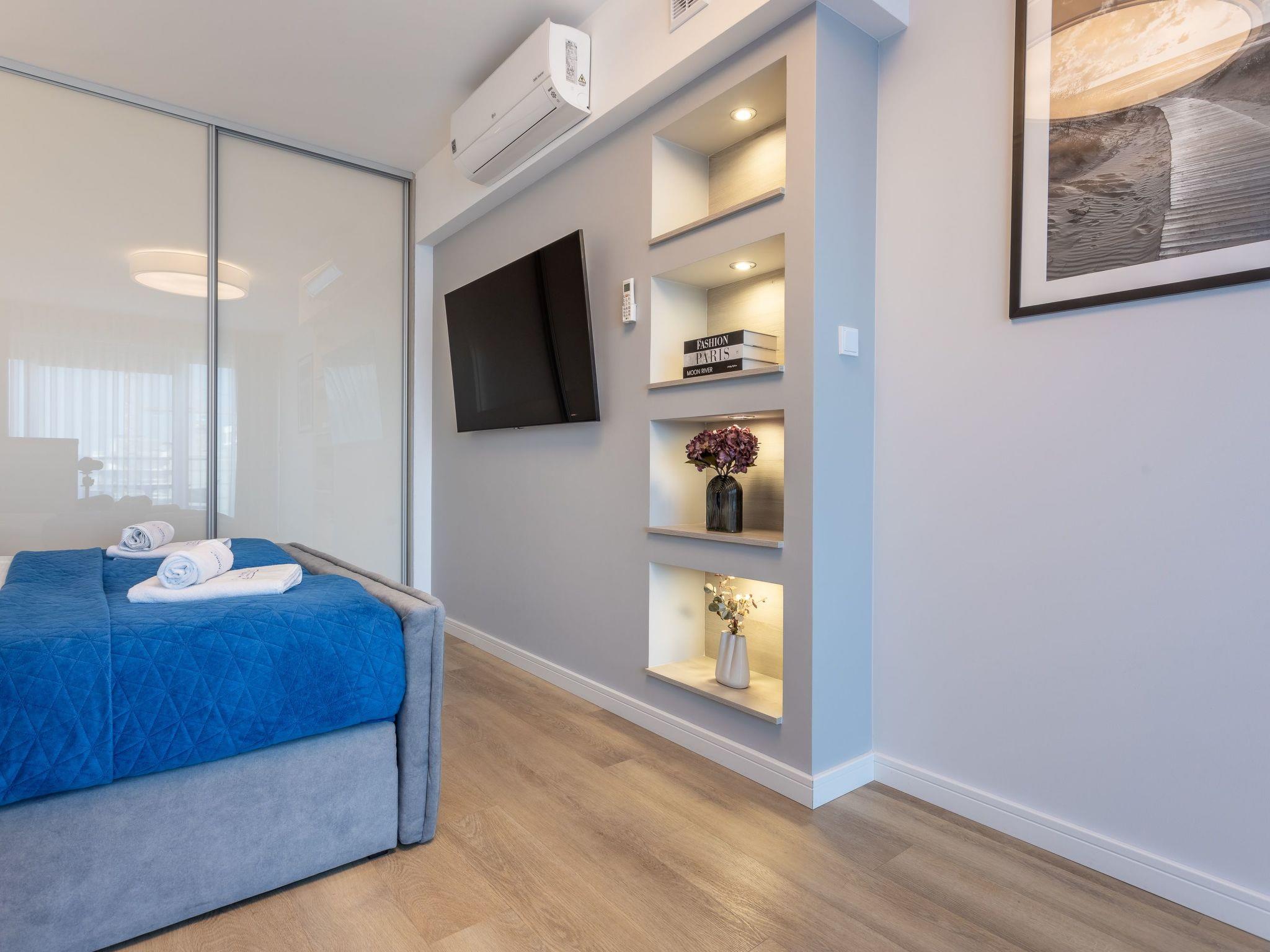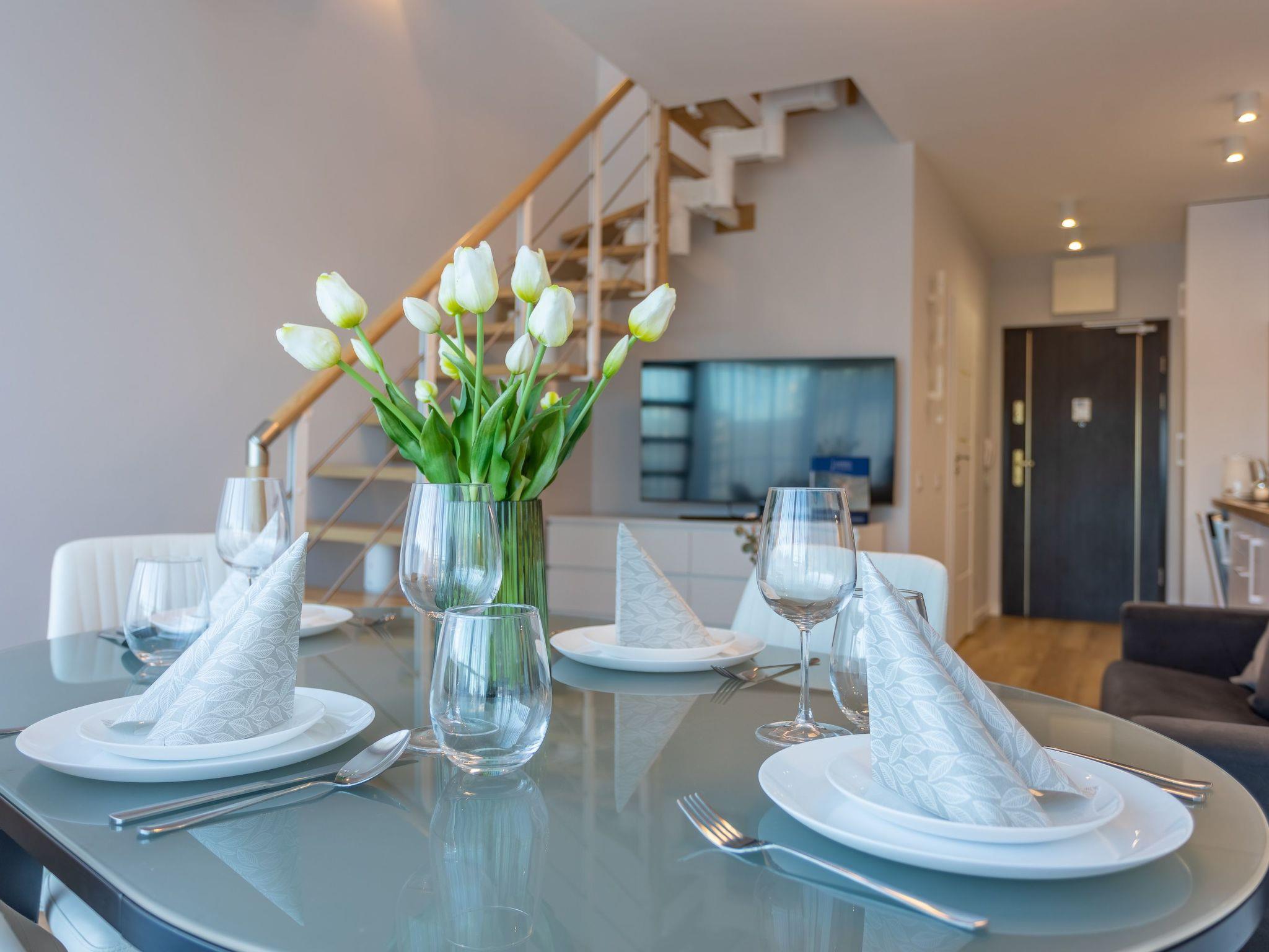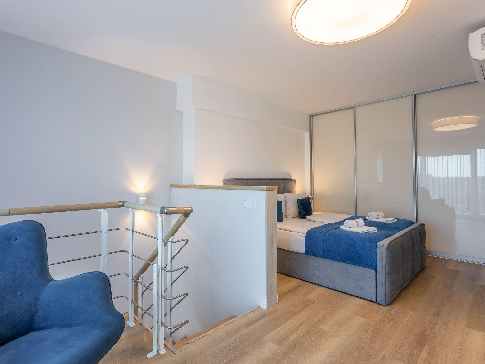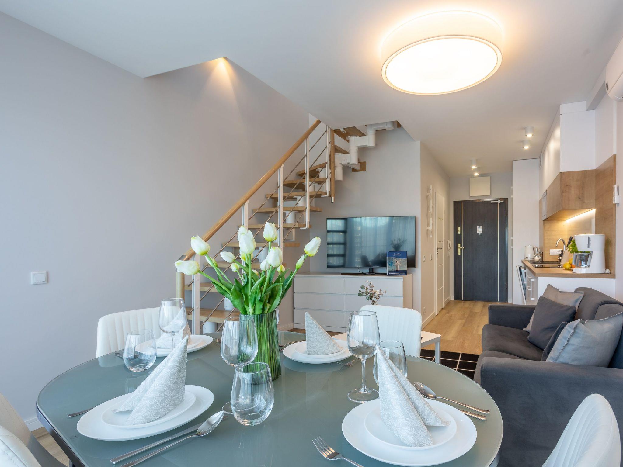 The flat "Albus 409" is two-storey and can accommodate four people. It consists of a living, dining and sleeping area, a fully equipped kitchenette and a very spacious bathroom - its total area is 50 m2. Its additional advantage are the two balconies, which are a very practical extension of the flat, from which you have the coveted view of the sea. The price of the flat also includes a parking space in the underground car park belonging to the flat. The interior is very aesthetically pleasing and furnished to a high standard, which is reflected in the beautiful modern furniture. White, grey and beige dominate here, broken up with a deep shade of blue. There are also wooden elements that complement the arrangement in a natural way. Numerous glazed areas visually enlarge the space and make the flat extremely bright and functional. Look out for additional amenities, such as air conditioning installed on each level and two large televisions. All this ensures the comfort of rest and allows you to regenerate after everyday challenges, guaranteeing peace and relaxation in the intimate privacy of a beautiful interior.