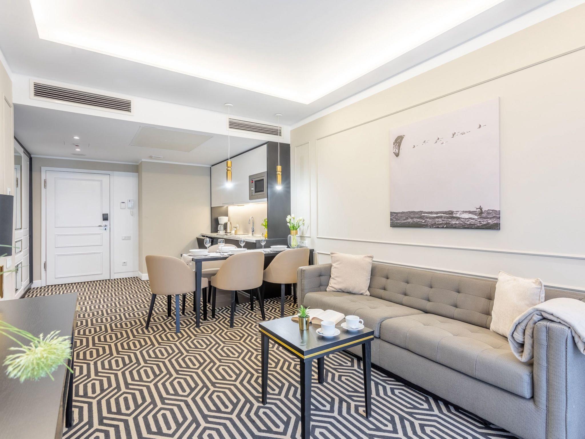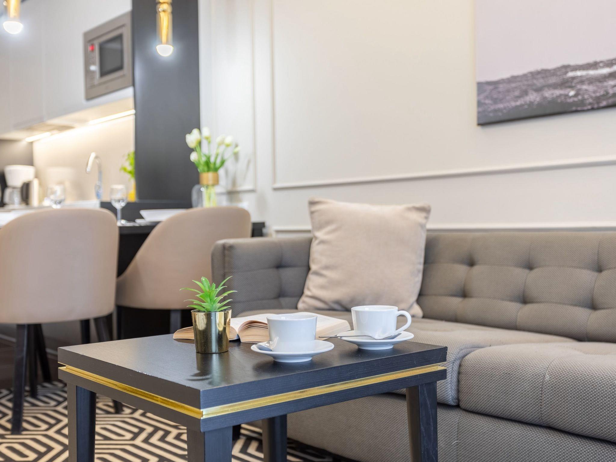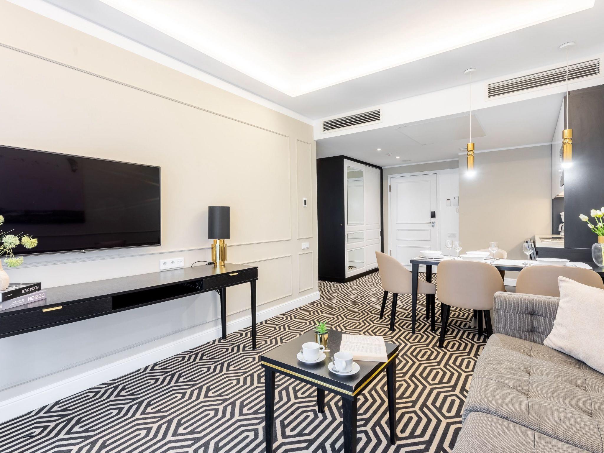 The flat consists of a living area with kitchenette, bedroom and very spacious bathroom - its total area is 42 m2. Its great advantage is air conditioning in every room and a balcony, which is a very practical extension of the living area. Each element of this classic interior has been selected not only to provide the greatest comfort of use, but also to influence the aesthetic sense and inspire pleasure in communicating with beauty and sophistication. The flat combines luxury and sensuality with a touch of lightness - the furnishings are expressive yet harmonious, warm and very sublime. It certainly encourages you to stay longer and allows you to spend your free time comfortably after all-day trips by the sea in a spirit of opulence and elegance.