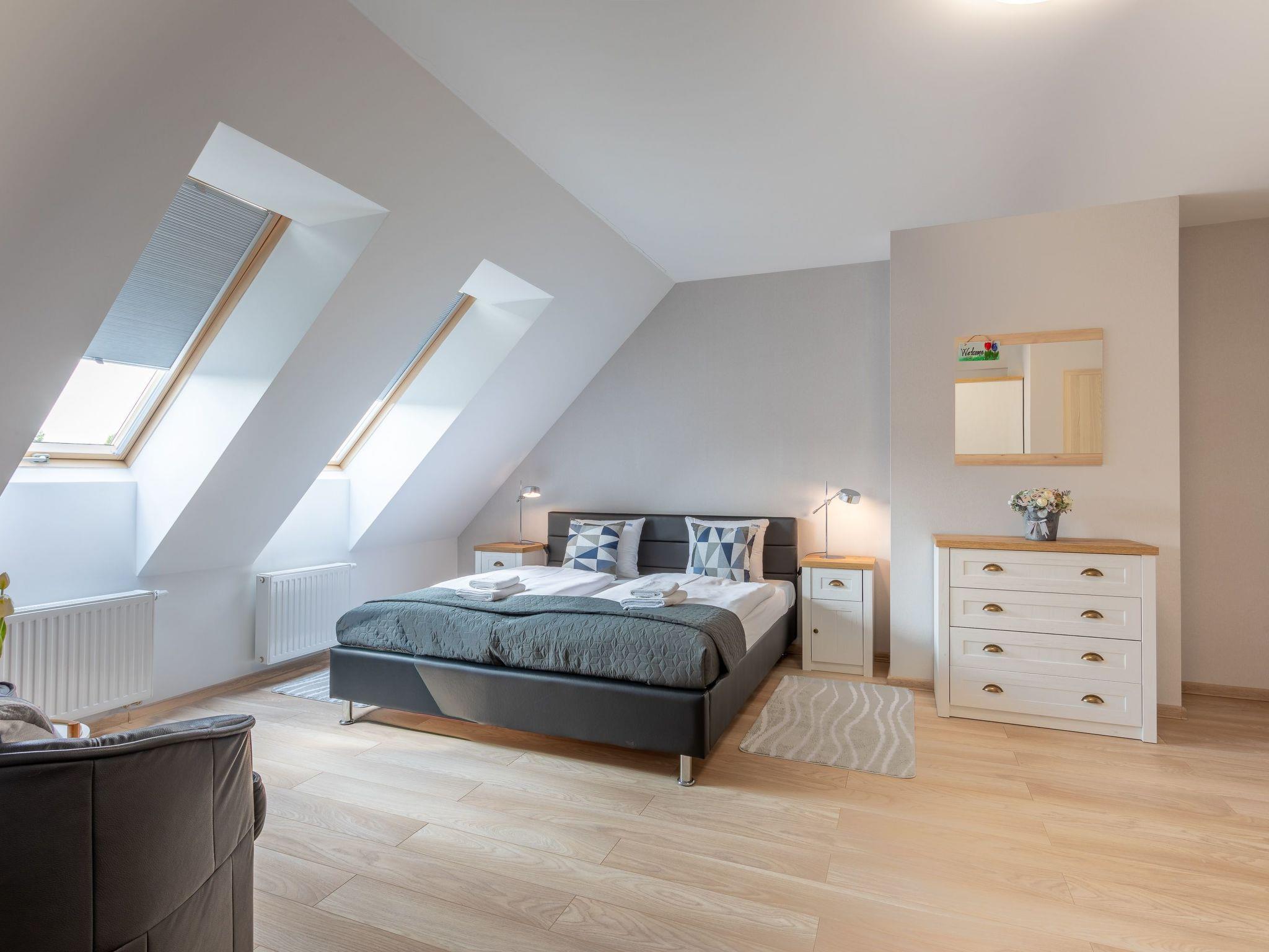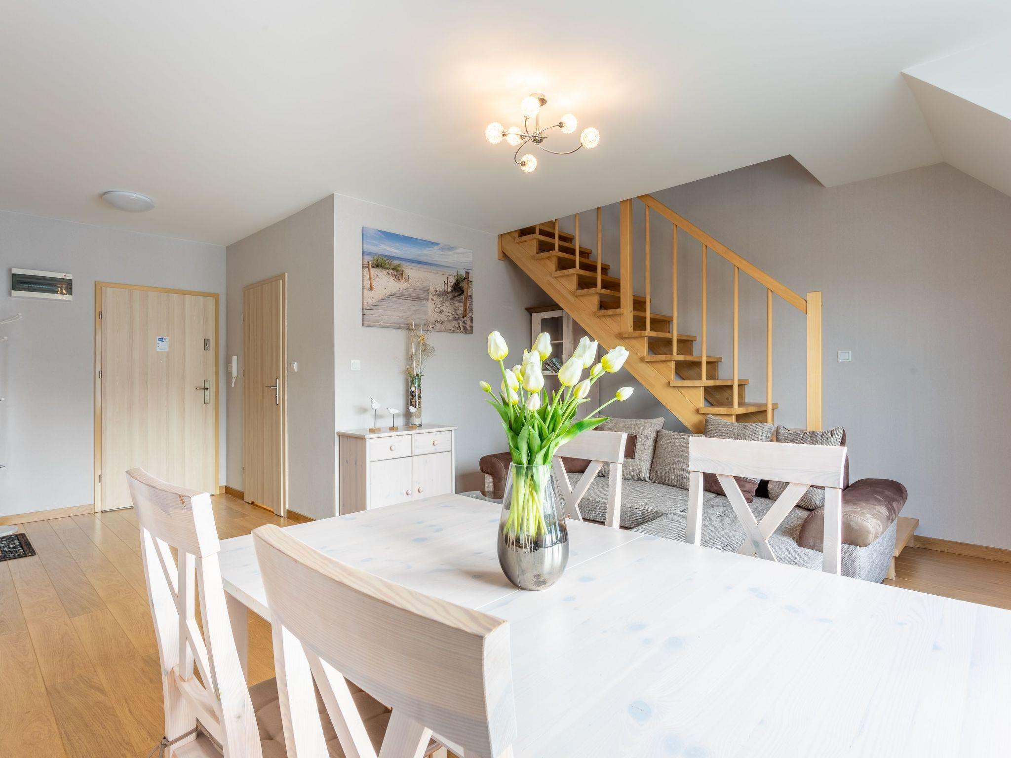 The flat "Bianco 49" is two-storey and offers space for four people. It consists of a living, dining and sleeping area, a fully equipped kitchenette and two bathrooms - its total area is 58 m2. Good facilities guarantee a pleasant stay, both for private and business purposes. The interior is extremely spacious, decorated in light colours, dominated by white, grey and beige. It is warmed by furniture and accessories made of light-coloured wood, with rustic elements that are reminiscent of the Scandinavian style and suggest a strong relationship with nature. Harmony and minimalism thus prevail in the flat and individual zones encourage different forms of leisure: from lazing in bed, to relaxing on the couch with a book or music in the headphones, to activities that create space, e.g. party games. An additional advantage is the balcony, which is a practical and functional extension of the flat and allows moments of relaxation in the fresh air. Therefore, the flat is ideal for large families, but also for friends who want to spend time together and have a private space to relax.