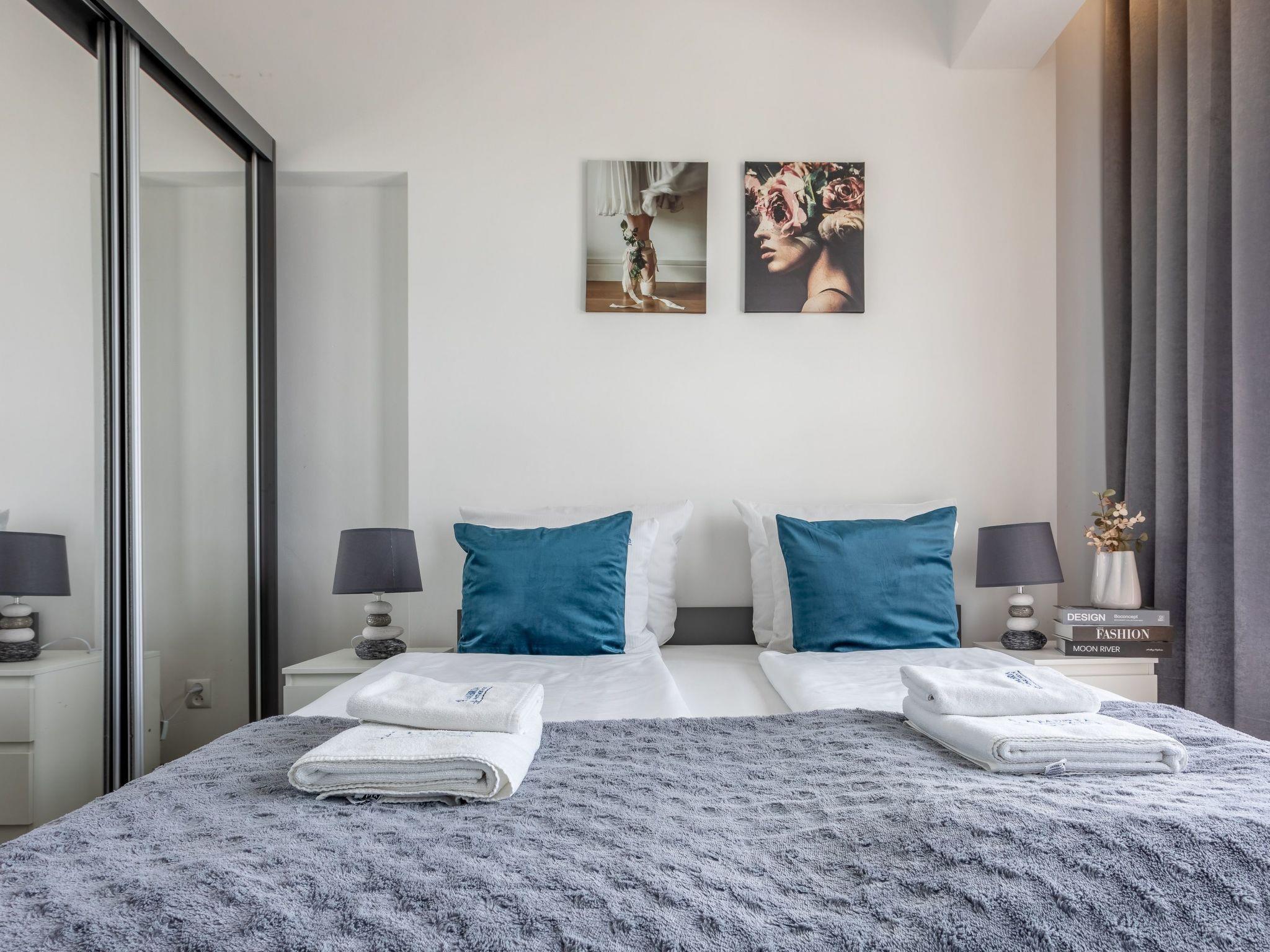 This is an air-conditioned flat on the eleventh floor. It consists of one bedroom, living room with well-equipped kitchenette and modern bathroom with total area of 49 m2. A great advantage is the balcony with a beautiful view and the opportunity to spend special moments admiring picturesque sunrises and sunsets or enjoying the beautiful panorama at any time of the day. The interior is very bright, dominated by shades of white, grey and beige mixed with deep blue, which undoubtedly evoke associations with the coastal climate, the sea and holidays.