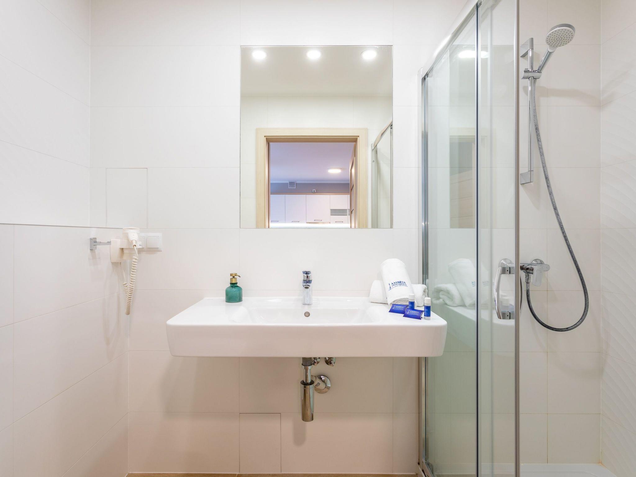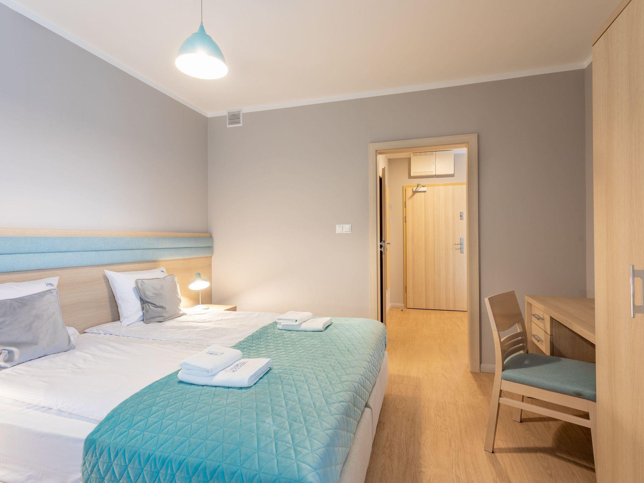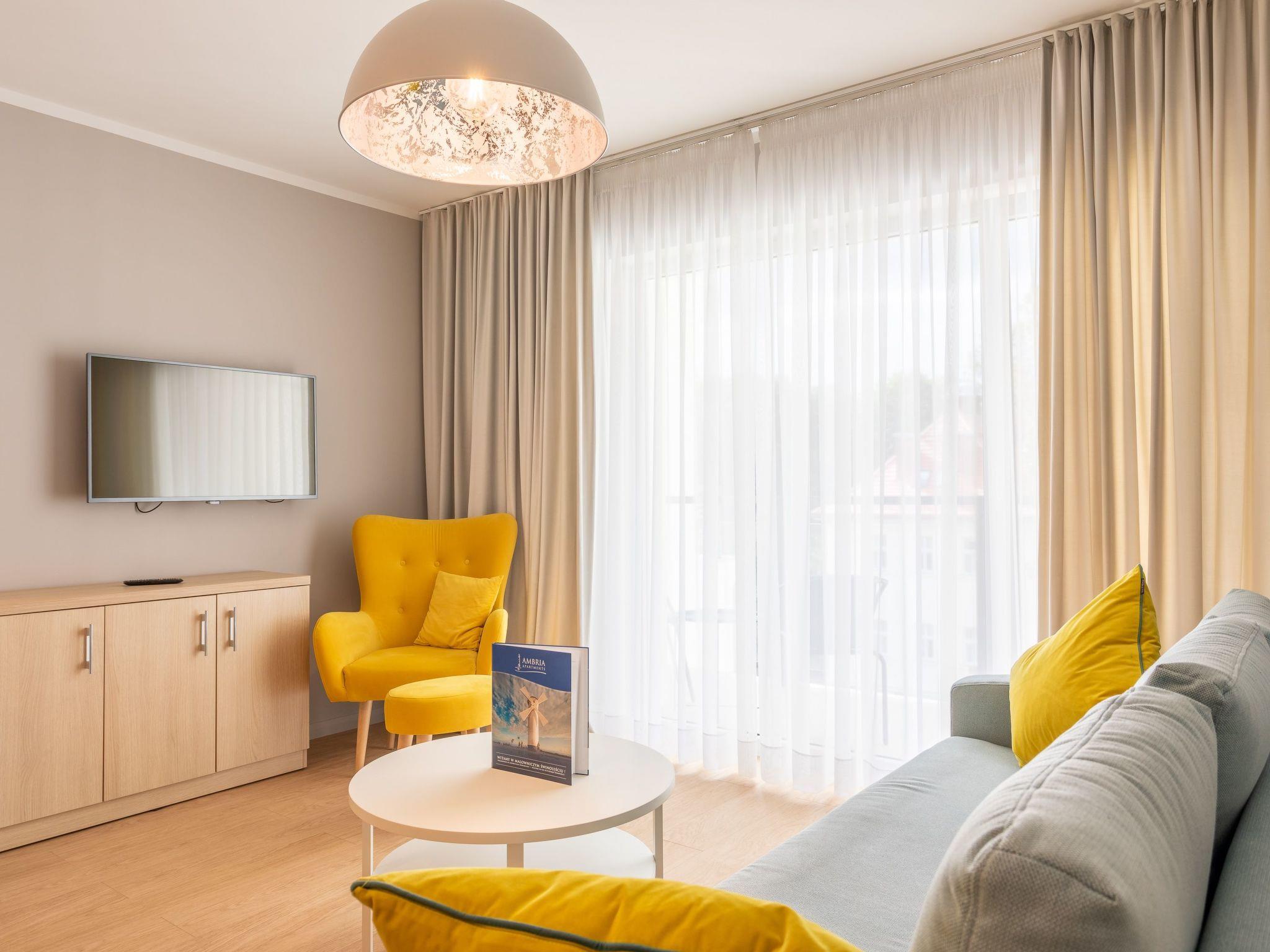 It is a flat with a very spacious bedroom, a living room with a well-equipped kitchenette and a modern bathroom with a total area of 41 m2, as well as a large south-east facing balcony, very well lit, where you can enjoy hours of sunlight. The interior is dominated by light, extremely soft colours: Blue, grey and beige. Numerous textile and decorative accessories complement the space and make you feel at home. It is an ideal offer for people who want to spend some time on the couch, read a book or have breakfast in an extremely comfortable bed and enjoy the aesthetics of an elegant interior.