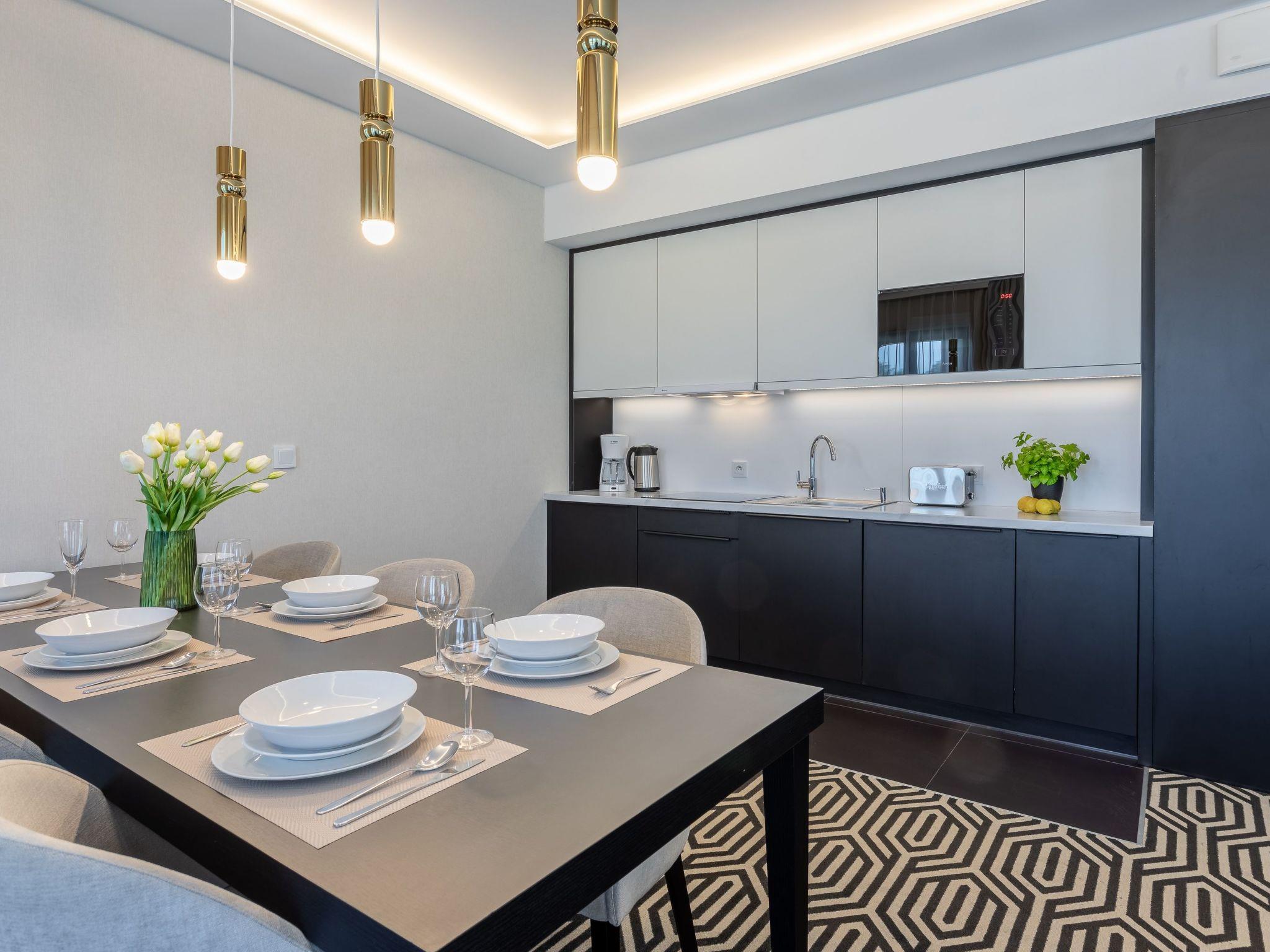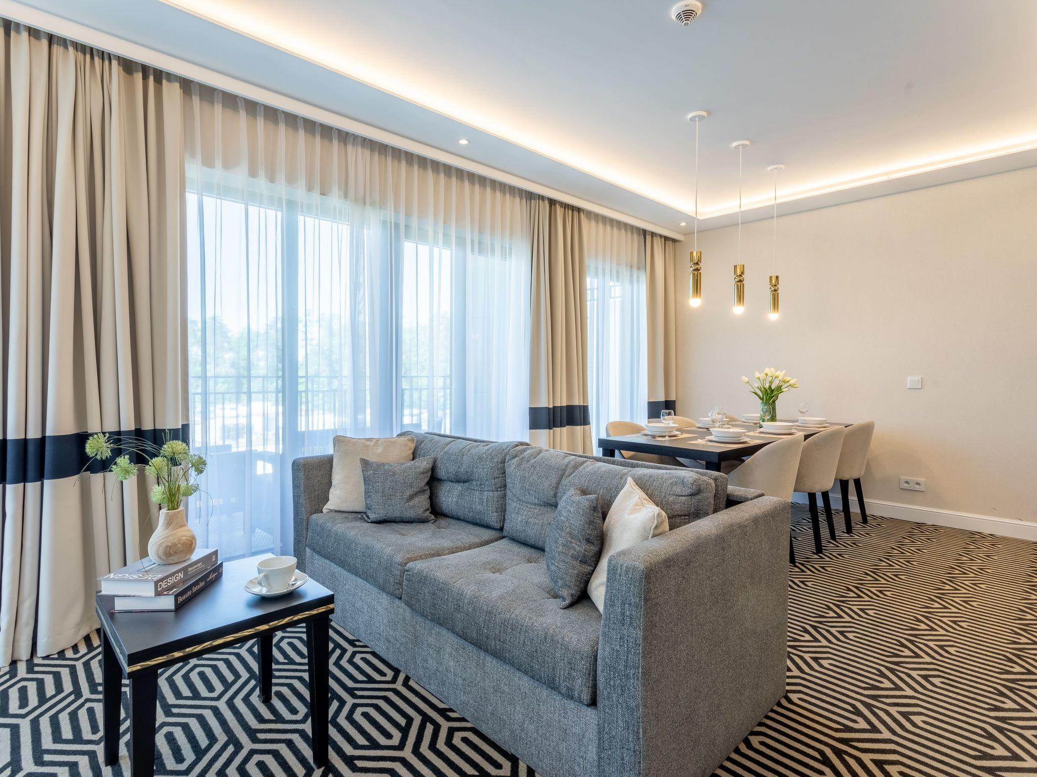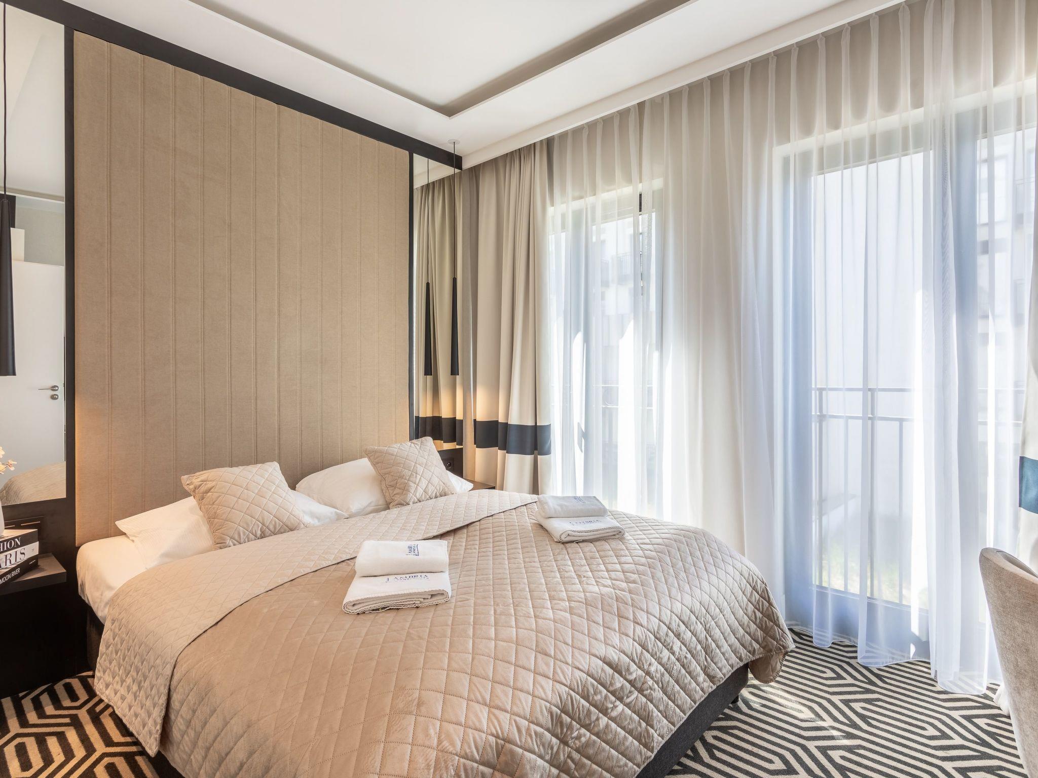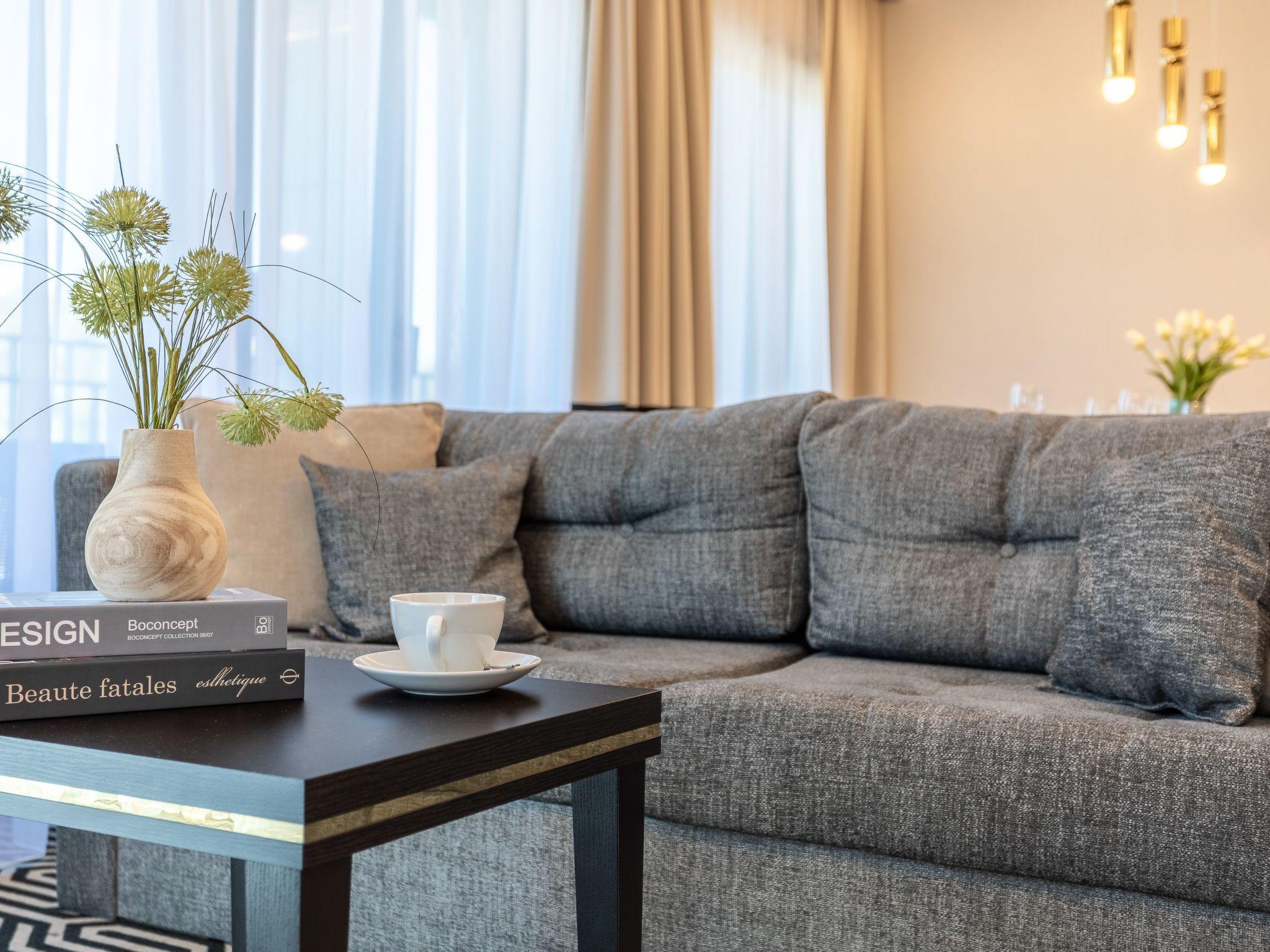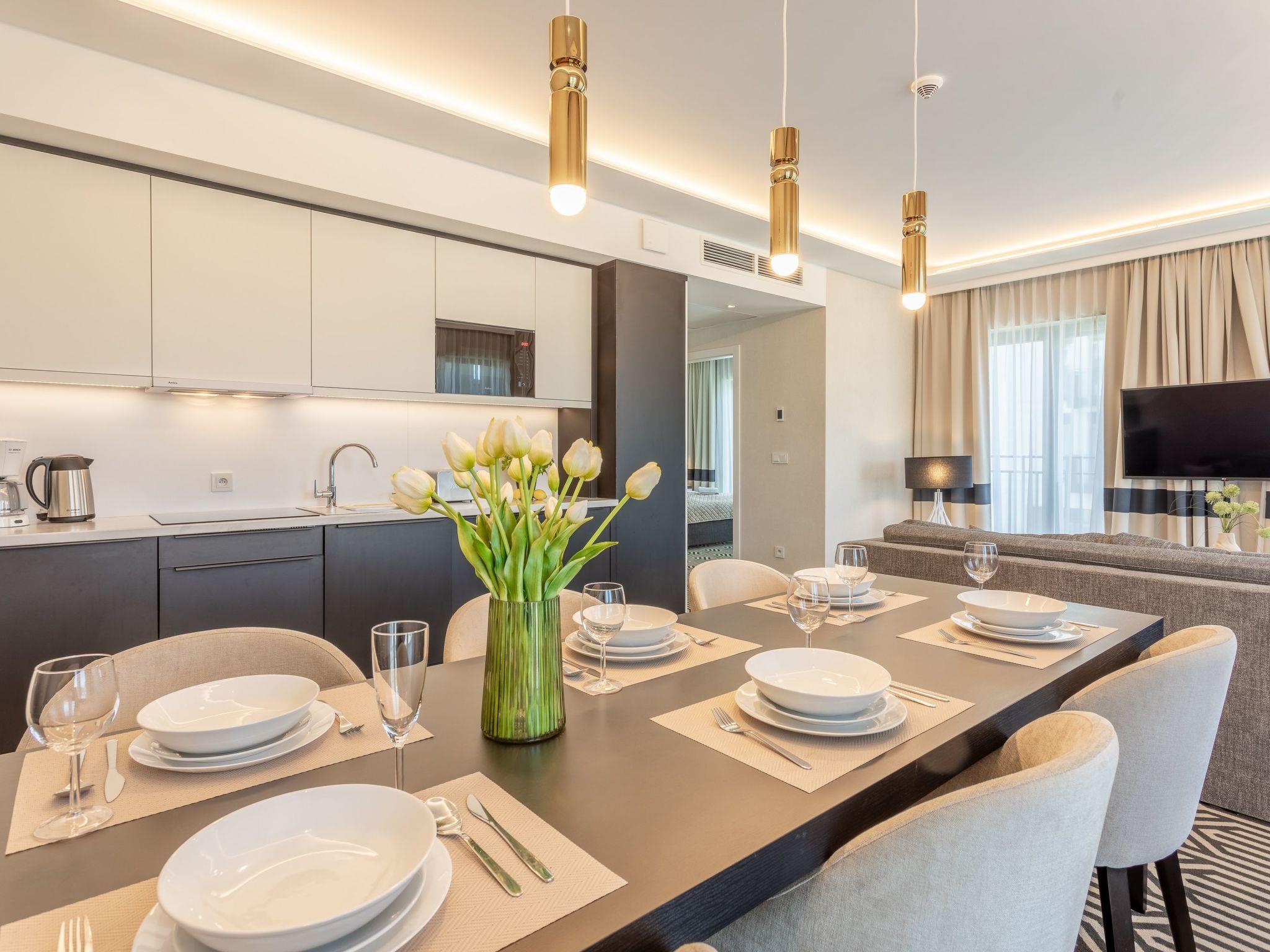 The flat consists of a living area with a kitchenette, two bedrooms and two bathrooms - its total area is 69m2. Its great advantage is air conditioning in every room and a balcony, which is a very practical extension of the living area. Each element of this classic interior has been selected to provide not only the greatest comfort of use, but also to influence the aesthetic sense and inspire pleasure in communicating with beauty and sophistication. The flat combines luxury and sensuality with a touch of lightness - the furnishings are expressive yet harmonious, warm and very sublime. It certainly encourages you to stay longer and allows you to spend your free time comfortably after all-day trips by the sea in a spirit of opulence and elegance.