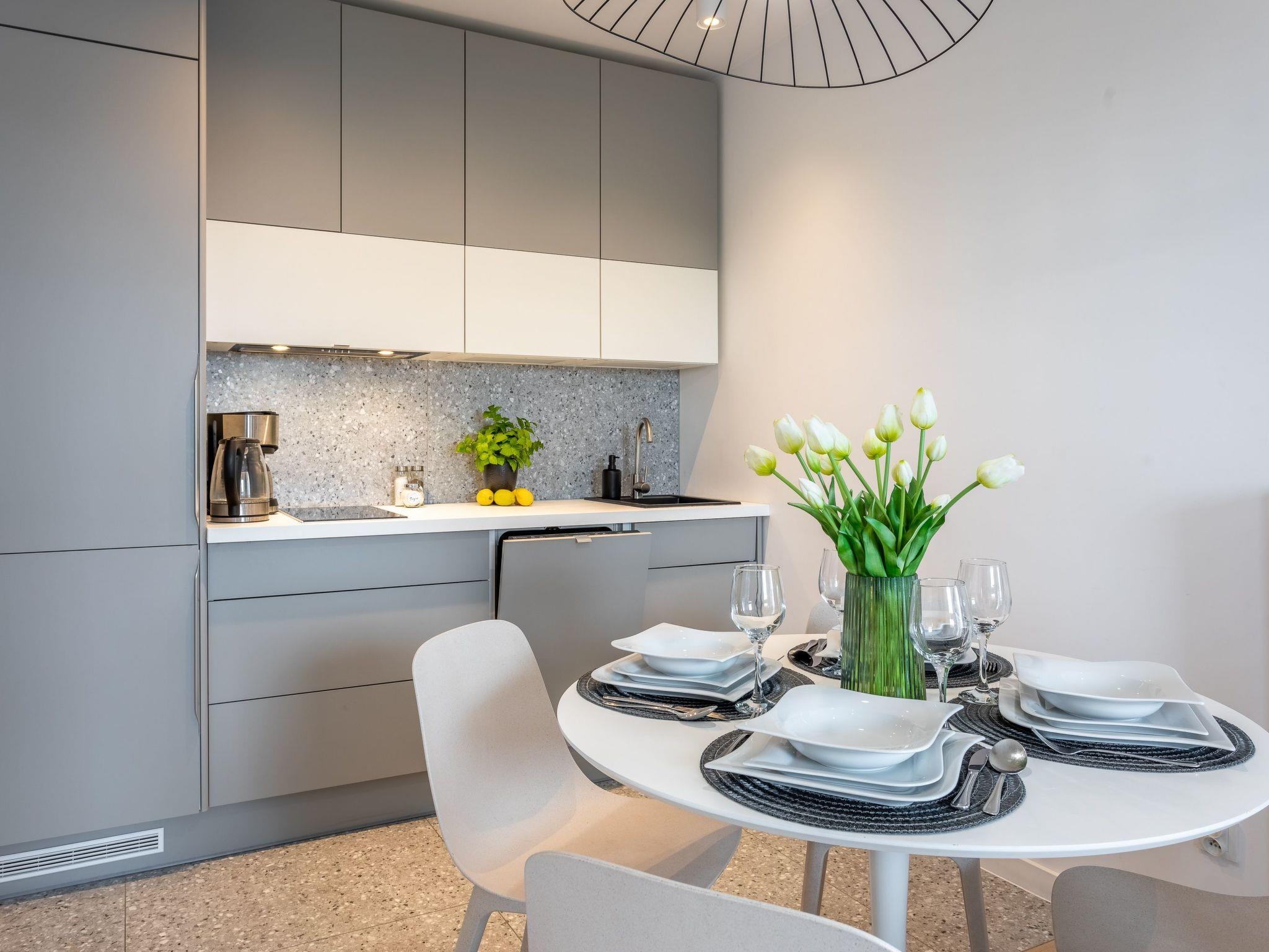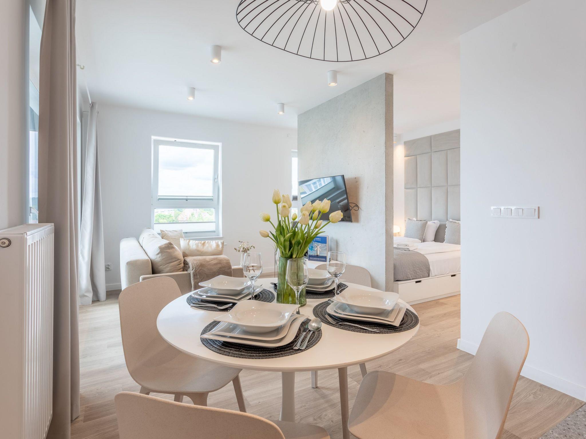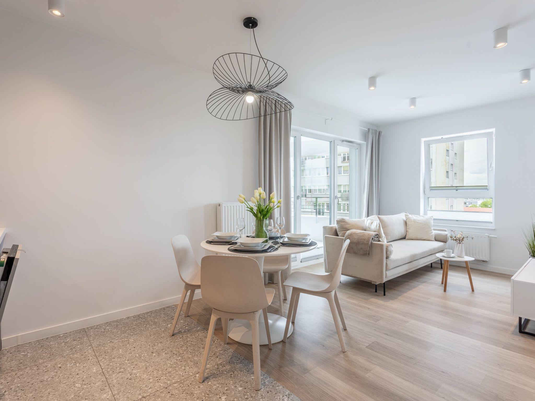 It is a studio flat with a well-equipped kitchenette and a modern bathroom with a total area of 33 m2 and a terrace where you can enjoy the moments between successive attractions. The interior is dominated by muted neutral colours - white, grey and ecru, enhanced by natural light and simple shapes that bring the mood of order and harmony as well as sublime elegance. In addition, a complete interior not only increases the functionality of the space, but also affects the comfort and true pleasure of use. It is an ideal place for people who appreciate elegance in an interior where they want to perfectly relax and return to.