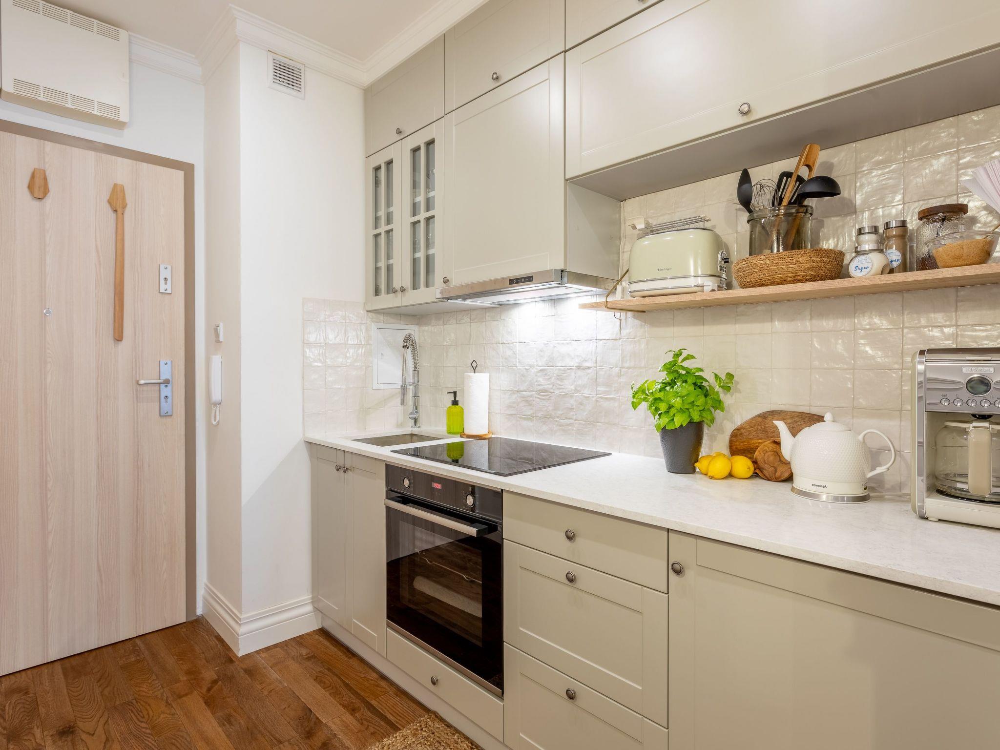 It is a studio flat with total area of 26 m2. It combines comfort, convenience and functionality, which are so desirable in this type of facilities, and allows you to rest freely and enjoy the unique holiday moments full of excitement. The interior is very originally designed, dominated by wood, white and beige tones that evoke associations with sand, beach and sun, as well as beautiful wooden details smuggled into accessories that warm up the interior and delight with their texture and unconventional look.
