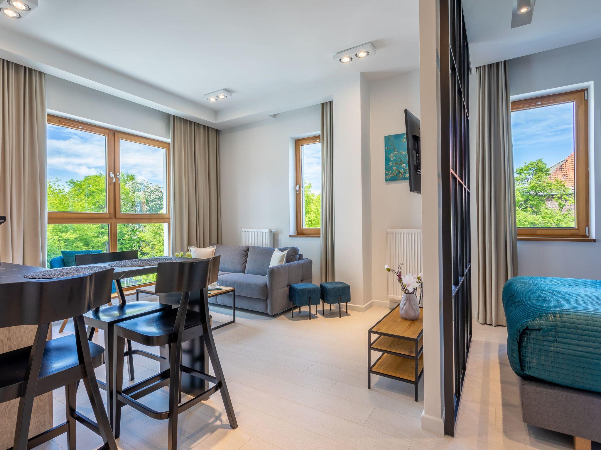 The interior is very originally designed, white, turquoise and black are dominated by light wood with visible grains and knots, which undoubtedly makes the space more atmospheric and cosy. Large glazing gives the room a very luxurious, modern character and lets in plenty of natural light. The flat is finished to a high standard and is a mosaic of different furniture, details and textures - it combines different styles that complement each other and allow you to create an eclectic space full of interesting and original combinations that you will surely remember for a long time and encourage you to return quickly.