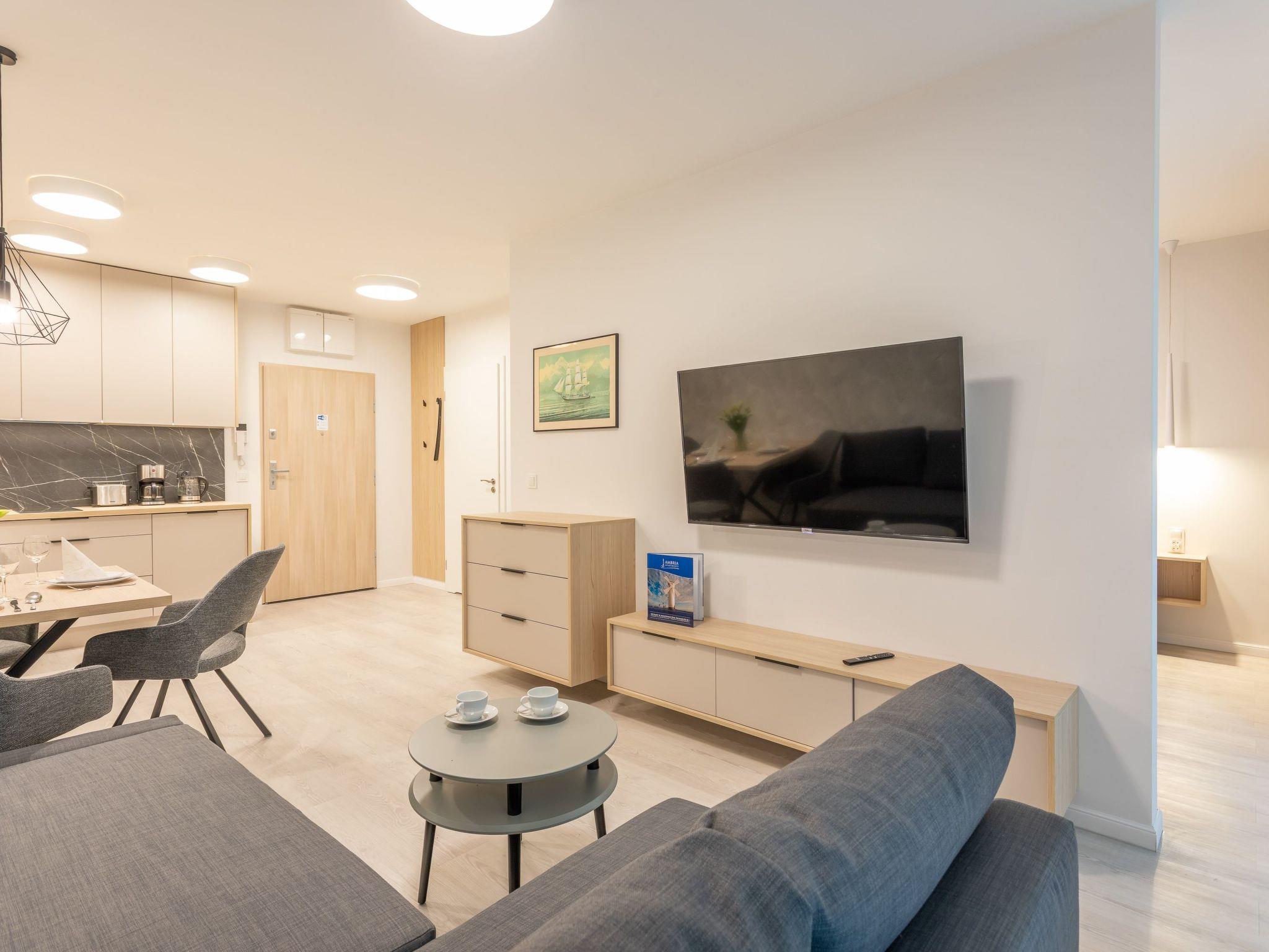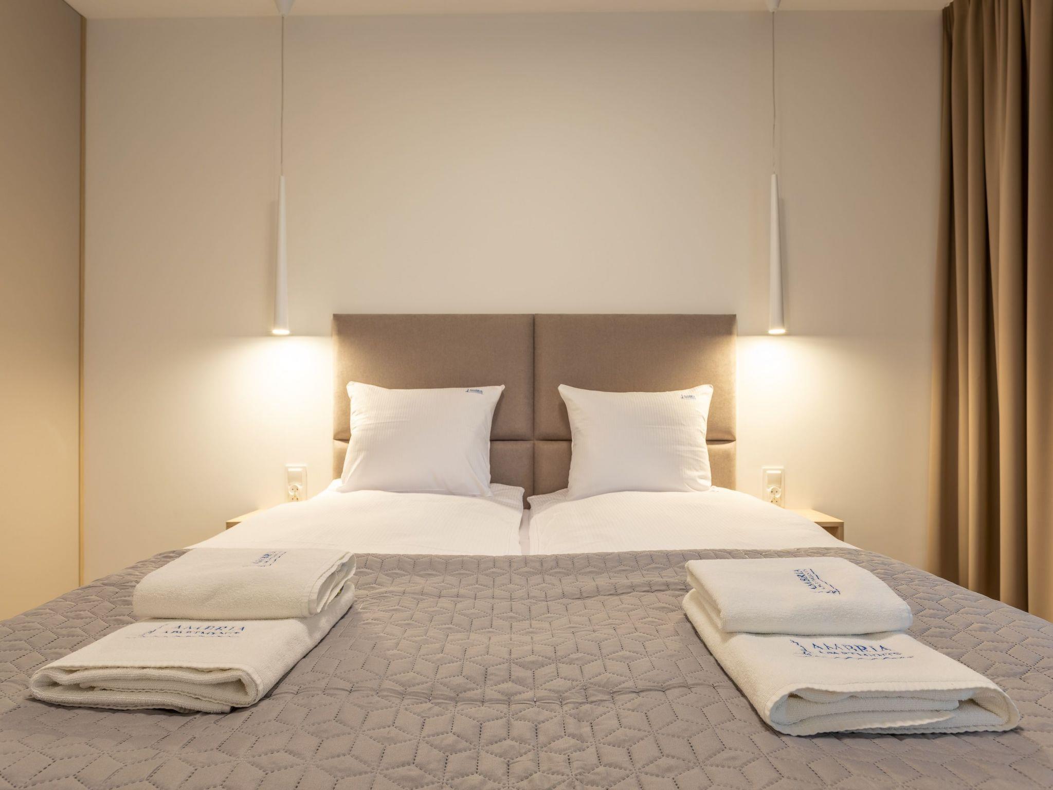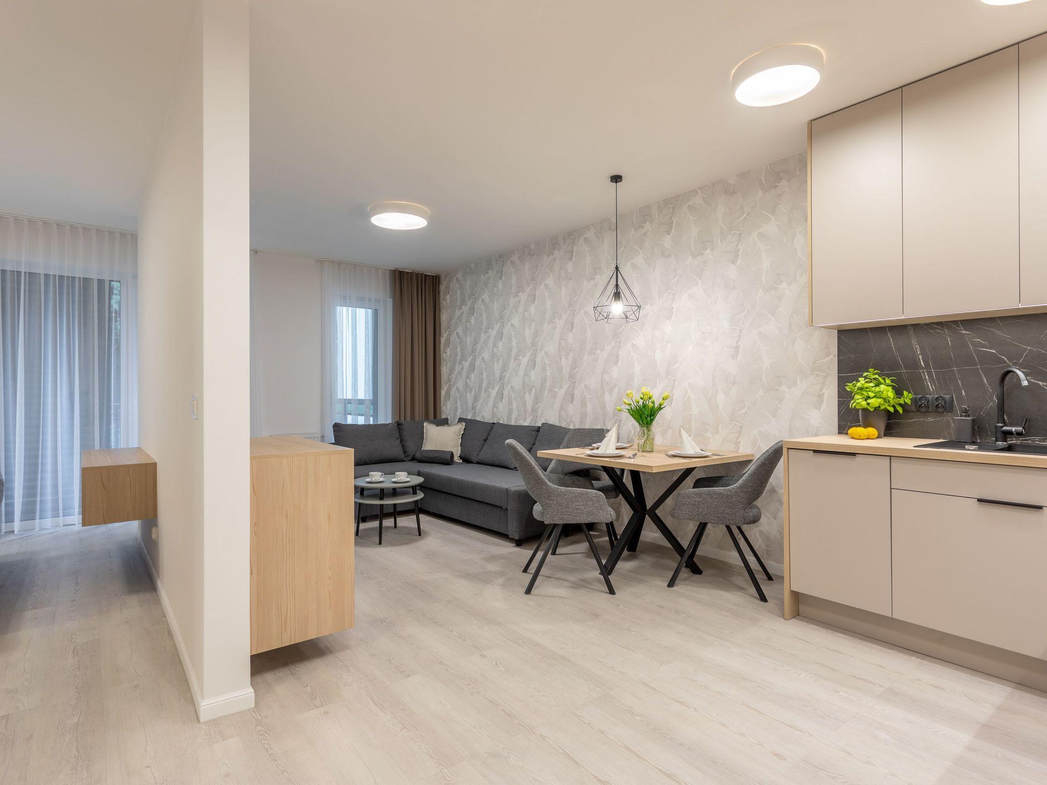 It is a flat with a very spacious bedroom, a living room with a well-equipped kitchenette and a modern bathroom with a total area of 40 m2, as well as a large balcony. The interior is dominated by light, extremely mild colours: White, grey and beige. The flat is also extremely cosy and is characterised by simple shapes and high quality. Numerous textile and decorative accessories complement the room and make you feel at home. It is ideal for people who want to spend some time on the sofa during their stay, read a book or have breakfast in an extremely comfortable bed.