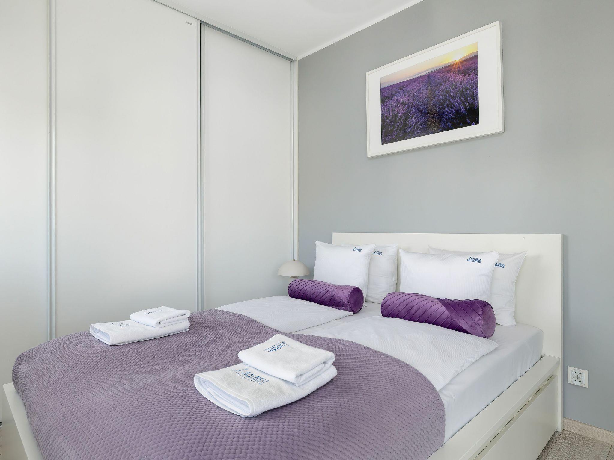 The interior of the 36 m² flat radiates a friendly and cosy atmosphere in soft purple tones. It has a cosy bedroom with a double bed and an inviting living room with a sofa bed, ideal for couples, families and business travellers. The extensive facilities leave nothing to be desired: You have a fully equipped kitchenette with dishwasher, filter coffee machine and kettle, a bathroom with shower, fast Wi-Fi, a smart TV and a washing machine for your sole use. Large windows provide light-flooded rooms and the balcony offers a wonderful place to relax.