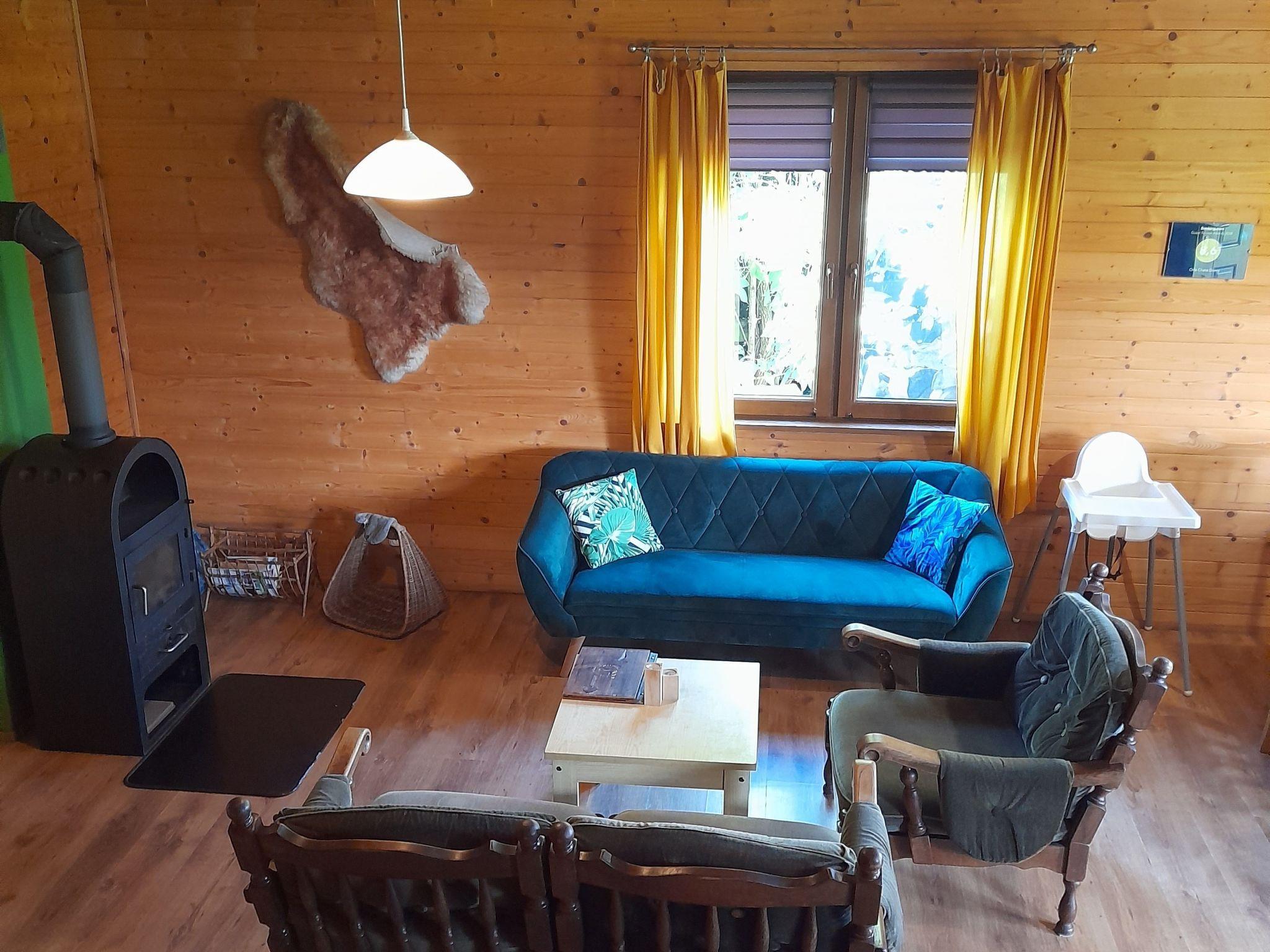 Eagle Cottage II is heated by a fireplace. The cottage has three separate bedrooms, 2 and 3 on the first floor, providing accommodation for a total of 7 people. On the ground floor of the cottage there is a lounge area, consisting of a living room with a fireplace connected to an open kitchen and dining area and a bathroom with a shower cubicle. The following are available to guests in each cottage: TV channels in Polish and German, home cinema, board games. The kitchen is equipped with a pressure coffee maker, toaster, microwave oven, dishes and pots necessary for preparing meals. You enter the cottage through a covered terrace, which is a place to relax where you can use the grill and smoke a cigarette.