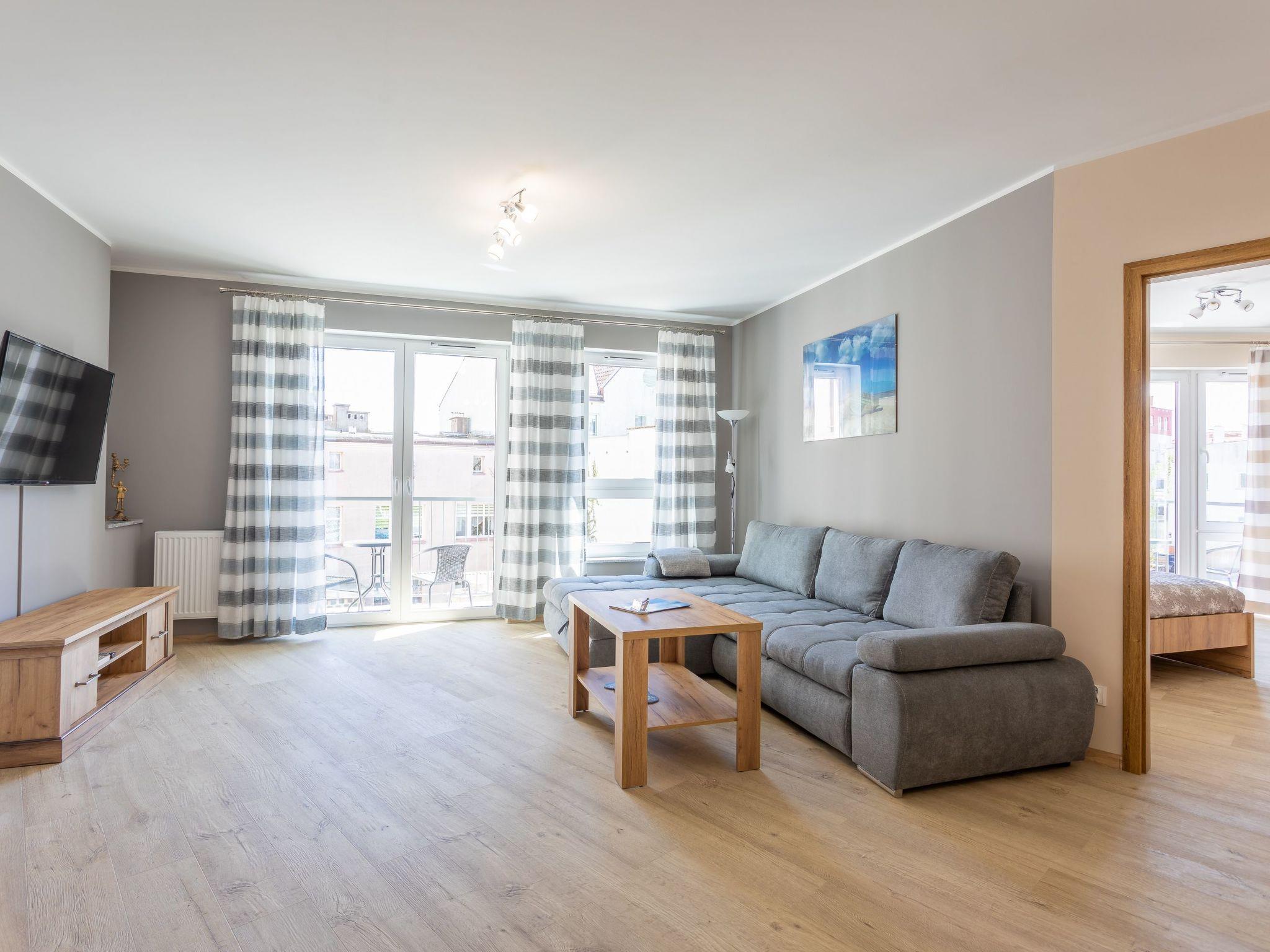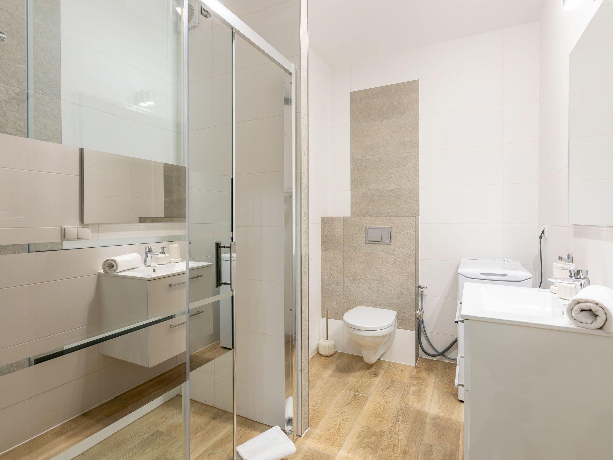 The interior is extremely spacious, in light colours, dominated by white, grey and beige, warmed by furniture and accessories in light wood, with rustic elements that refer to the Scandinavian style and suggest a strong relationship with nature. Harmony and minimalism thus prevail in the flat and individual zones encourage different forms of leisure: from lazing in bed, to relaxing on the couch with a book or music in the headphones, to activities that create space, e.g. party games. An additional advantage of the flat are two balconies - especially appreciated by people who like independence. Therefore, the flat is ideal for large families, but also for friends who want to spend time together and have a private space to relax.