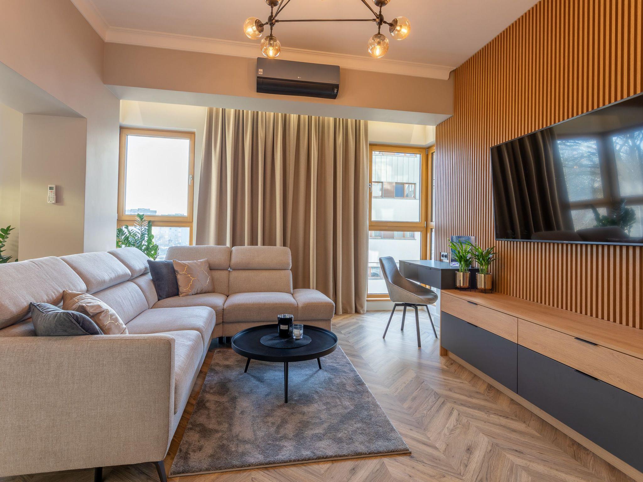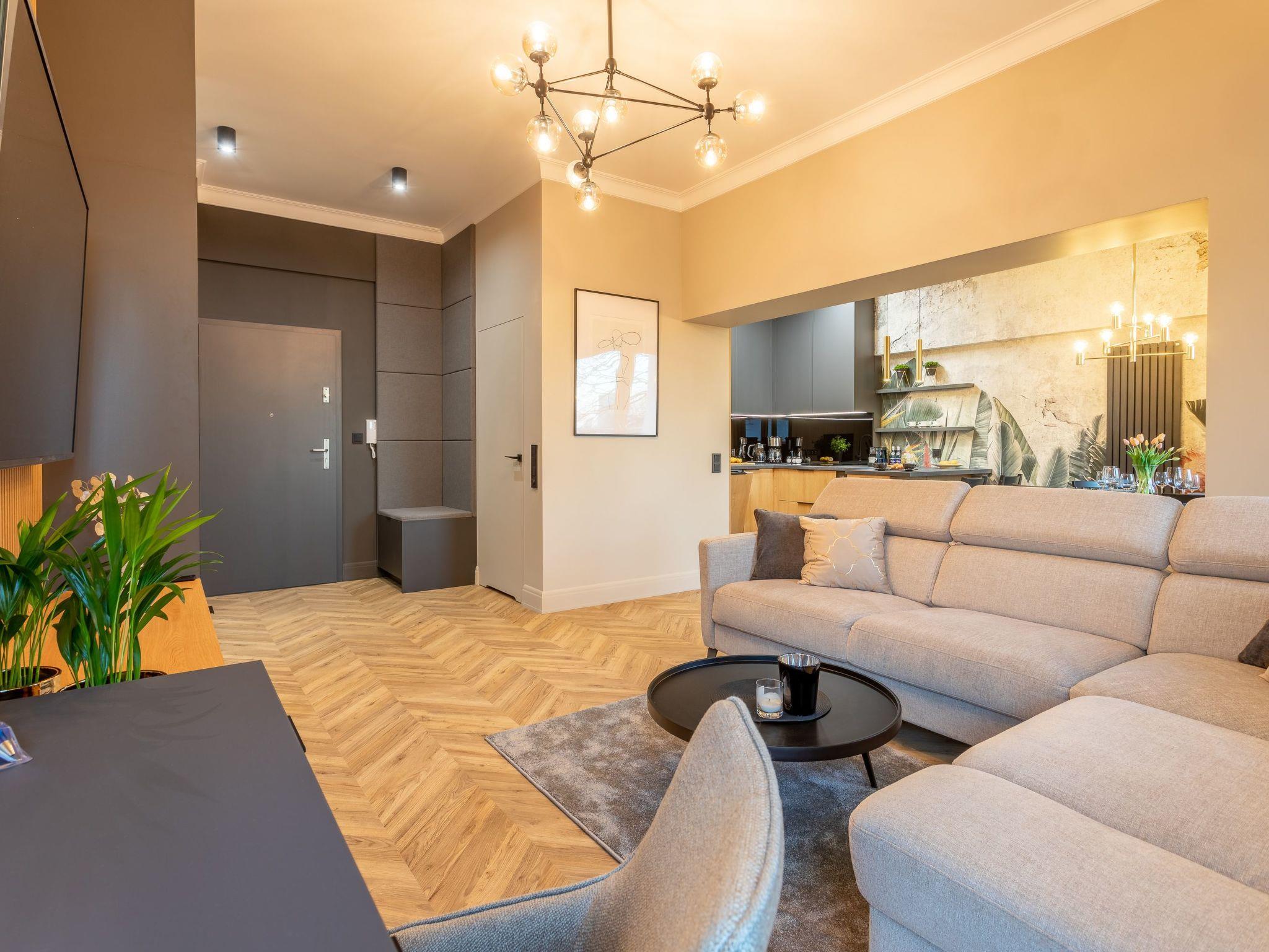 It is an air-conditioned flat located on the second floor - with a bedroom furnished with a high-quality hotel bed, a living room with a luxurious corner sofa and a cinema-sized TV with free access to Netflix, as well as a well-equipped kitchenette where you can prepare the most exquisite dishes while enjoying perfectly chilled wine (thanks to the built-in wine fridge!) or delicious Nespresso coffee. A great advantage of the flat are two balconies - one with garden furniture and another with a cocoon armchair, which will allow you to cosy up in the fresh air. The total area of the flat is 58 m2. The interior is decorated in light colours, dominated by wood, grey and beige tones that evoke associations with sand, beach and sun. In addition, large windows on the south side allow plenty of daylight into the interior, which also visually enlarges the room. The elegant furnishings are also emphasised by expressive, modern accessories and interesting shapes and textures.