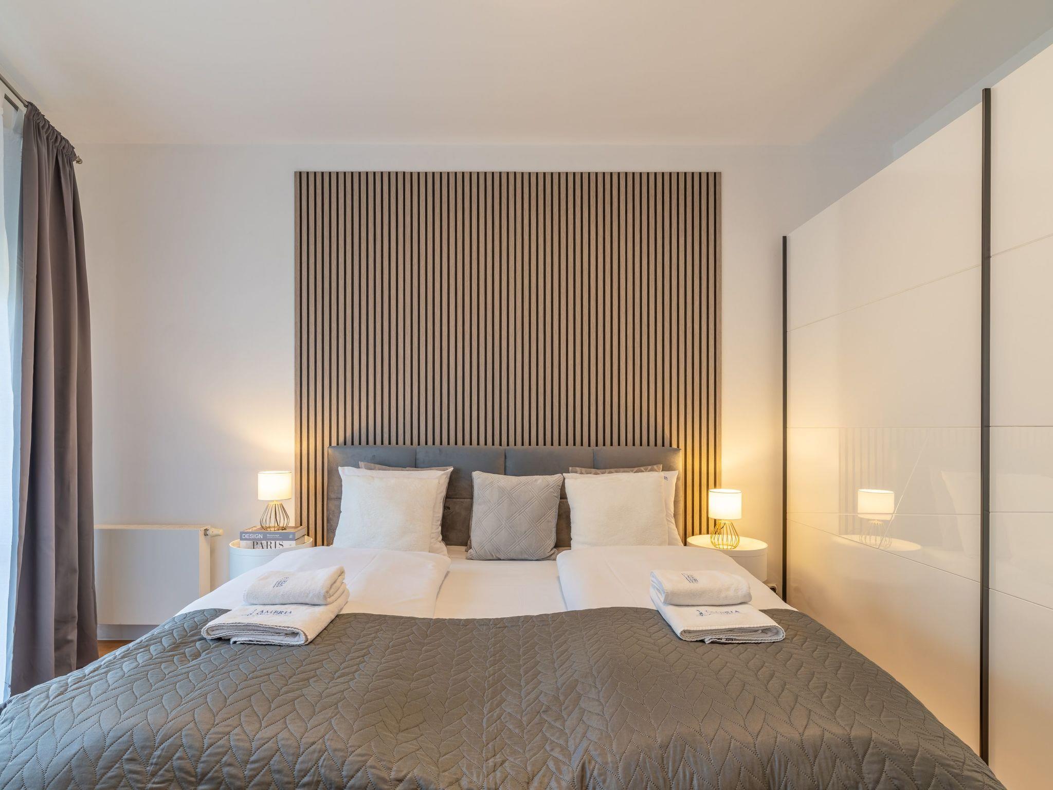 Spacious and well-equipped flat with one bedroom, living room with kitchenette and bathroom - the total area is 40 m2. The flat is stylishly furnished in bright, warm colours and ensures a comfortable stay by the sea. The living room, in combination with the kitchenette and dining room, offers a cosy space for relaxing and sharing meals with the family. The bedroom with a large, comfortable bed and a wooden accent on the wall invites you to relax and unwind. Large windows allow plenty of natural light into the flat and carefully selected decorations and accessories give the interior a unique character.