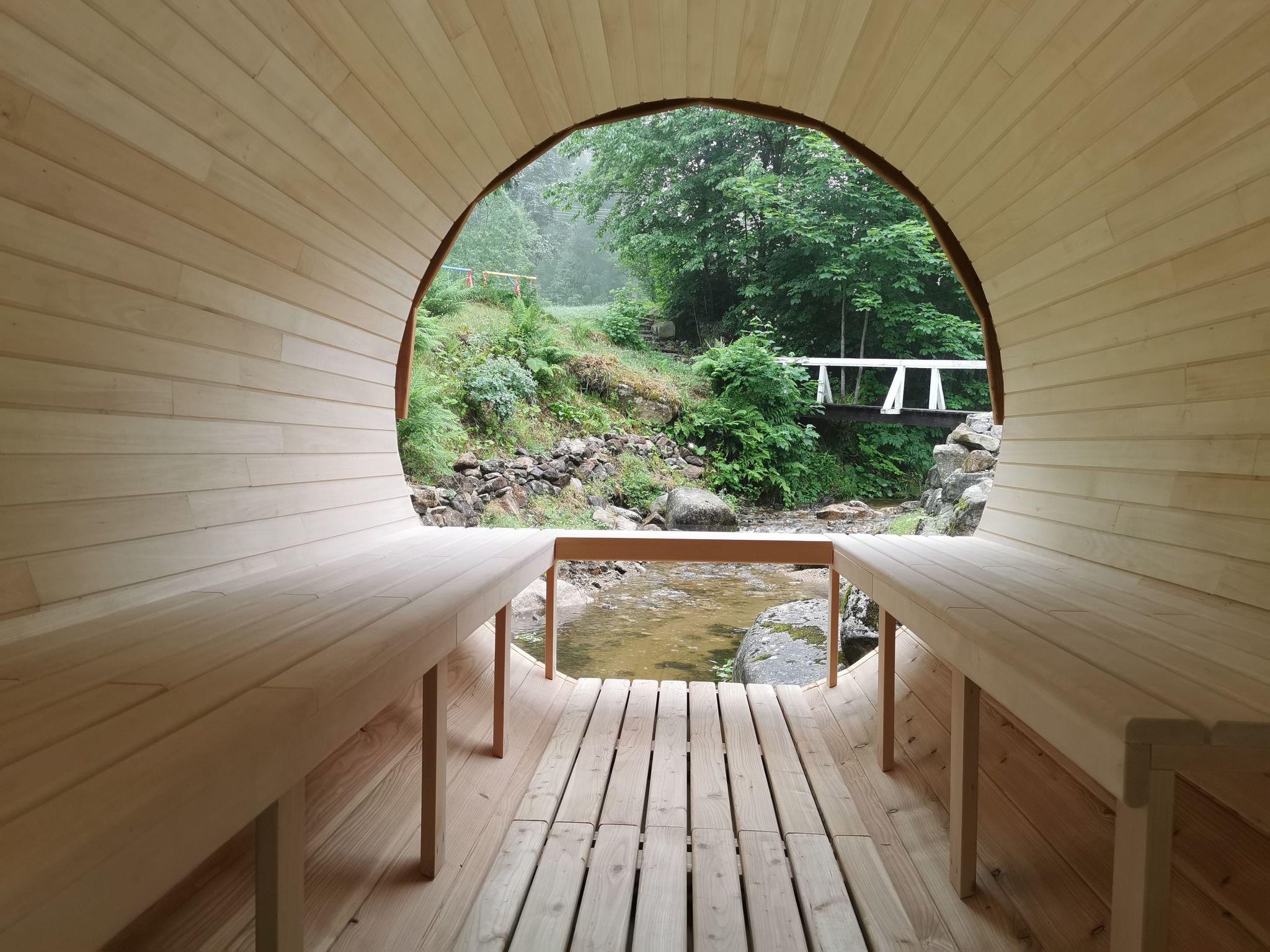 5) SAUNA - Outdoor sauna in the form of a barrel located in the riverbed directly above the river with a 200 cm glass window overlooking the flowing water. Prepared on guests' individual request and may incur an additional charge.