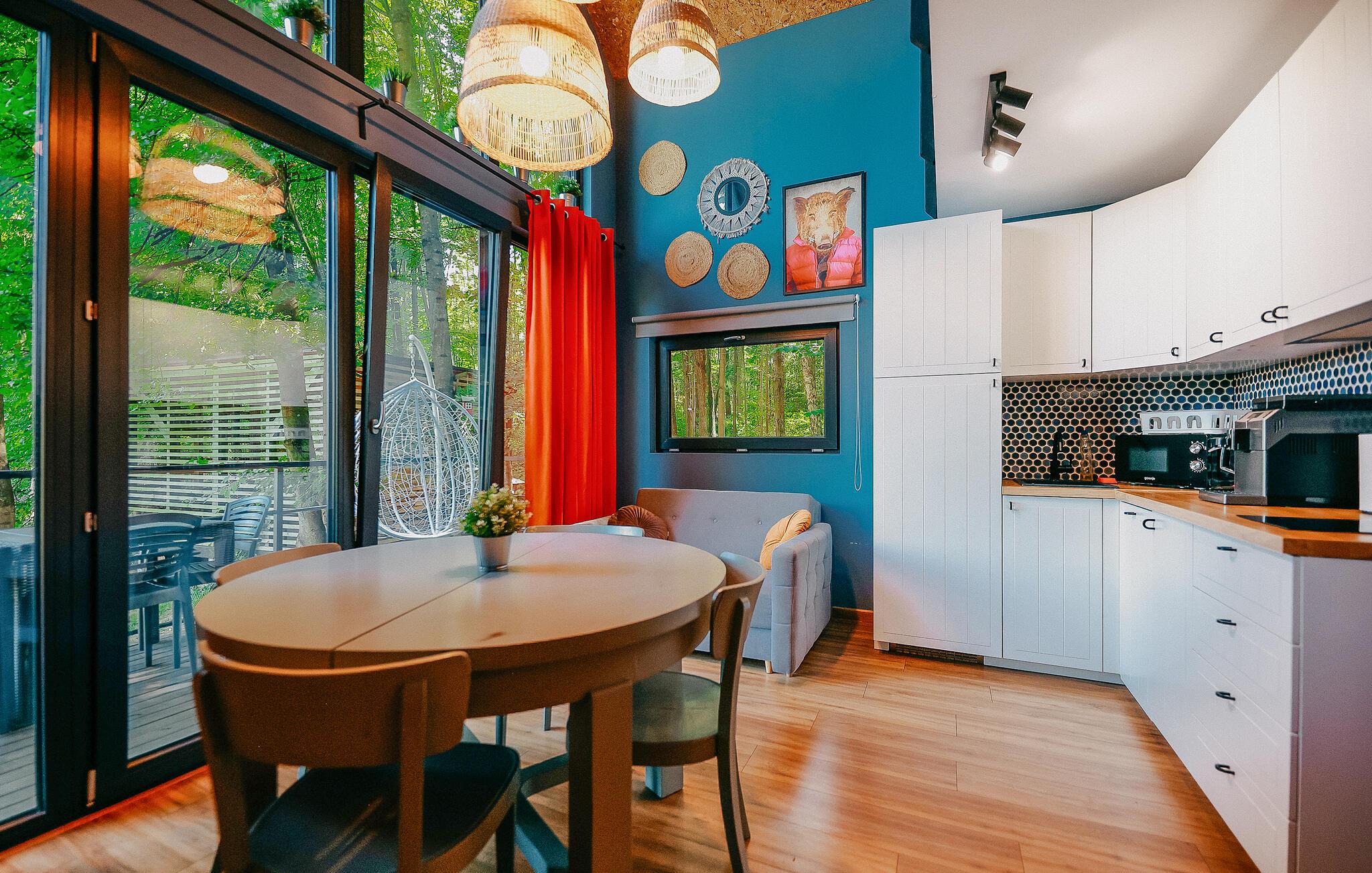 Beliggende i idylliske, skovklædte omgivelser byder dette komfortable og velindrettede feriehus jer velkommen med et moderne og indbydende interiør. Glæd jer til hyggelige og luksuriøse dage med udsigt over det omkringliggende grønt, og læg hverdagen bag jer, mens I tilbereder lækre retter og nyder hyggelige måltider i en hyggelig atmosfære.