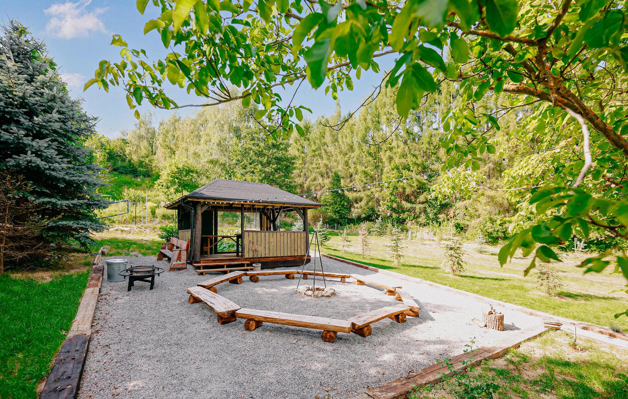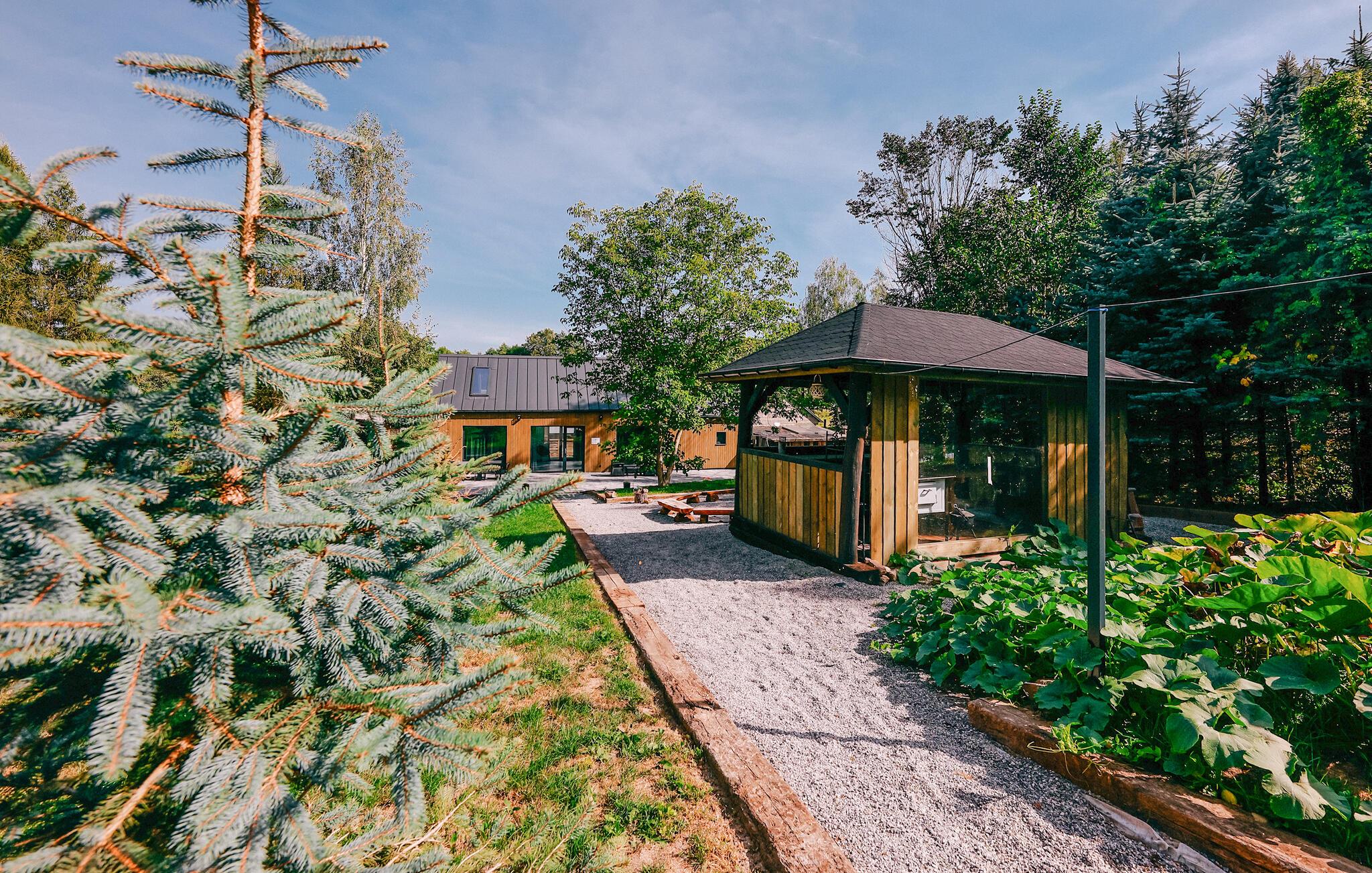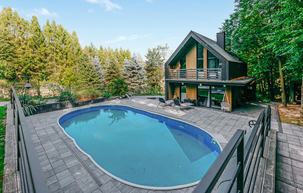 Beliggende i idylliske, skovklædte omgivelser byder dette komfortable og velindrettede feriehus jer velkommen med et lyst og moderne interiør. Glæd jer til hyggelige og luksuriøse dage med udsigt over det omkringliggende grønt, og læg hverdagen bag jer, mens I tilbereder lækre retter og nyder hyggelige måltider i en behagelig atmosfære.