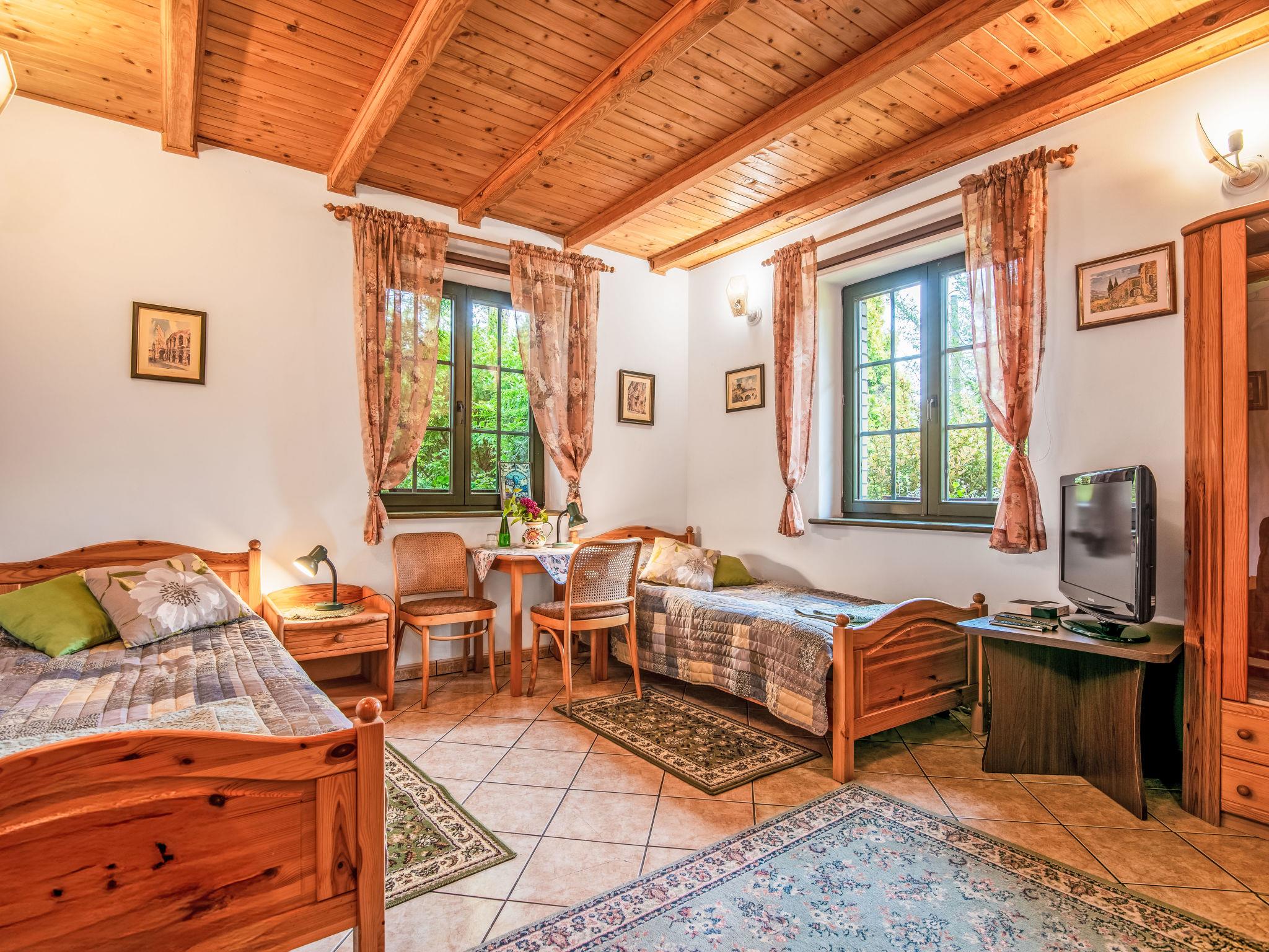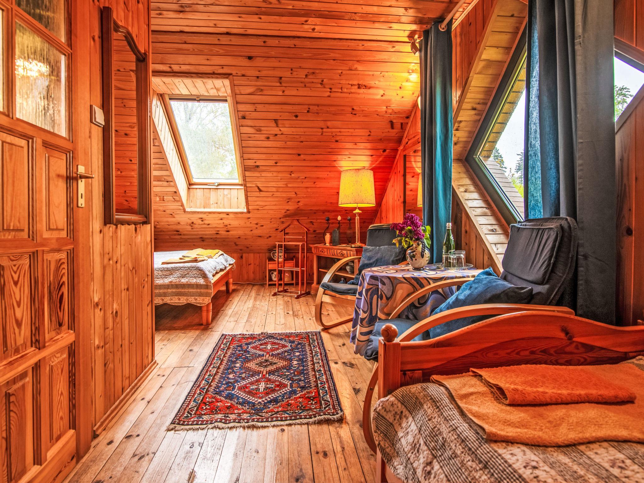 5-room house 168 m2 on 2 levels. Comfortable and beautiful furnishings: living/dining room 21 m2 with panoramic window with open-hearth fireplace and satellite TV. Exit to the garden, to the terrace. Open gallery with sloping ceilings with 3 beds (90 cm), bath/bidet/WC. 1 room 17 m2 with 1 double bed (160 cm), shower/bidet/WC and satellite TV. 1 room 14 m2 with 2 beds (90 cm), hip bath/bidet/WC and satellite TV. Kitchen (4 hot plates, oven, microwave, electric coffee machine). Upper floor: entrance hall with sloping ceilings with satellite TV. 1 room 18 m2, with sloping ceilings with 1 bed (90 cm), 1 double bed (160 cm), shower/bidet/WC. Terrace, porch. Terrace furniture, barbecue. Beautiful view of the garden. Facilities: washing machine, children's high chair, baby cot for up to 3 year olds. Parking at the house. Suitable for families. Maximum 1 pet/ dog allowed. Instead of an enclosed bedroom, some sleeping areas are located in an open-plan area (gallery, alcove, etc.).