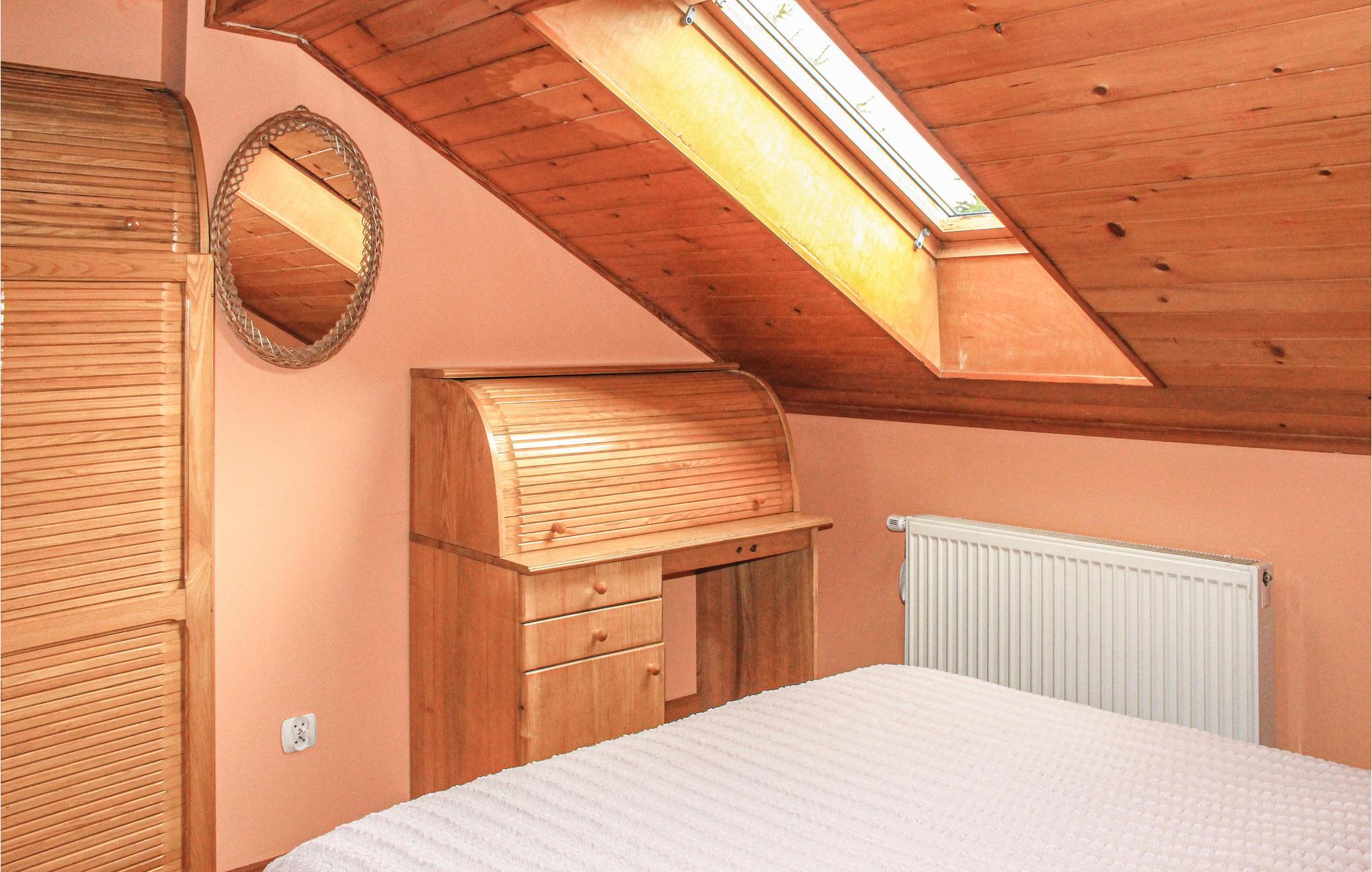 Bo i den lille by Wielochowo, i dette feriehus der ligger på en indhegnet grund sammen med PMA383 på en bakke ved vandet. Huset er enkelt og praktisk indrettet. Der er kun 800 meter til byen og I bor heller ikke langt fra en rideskole. Giv jer selv en behagelig dag i kurbadet Termy Warminskie. Her er mange attraktioner for aldre, så her vil I få en ferie fuld af oplevelser. Der er ikke langt til den berømte vandre- og cykelsti Green Velo, der fører gennem hele Polen. Har I lyst til selv at begive jer ud på to hjul, kan I leje cykler i byen Lidzbark Warminski.