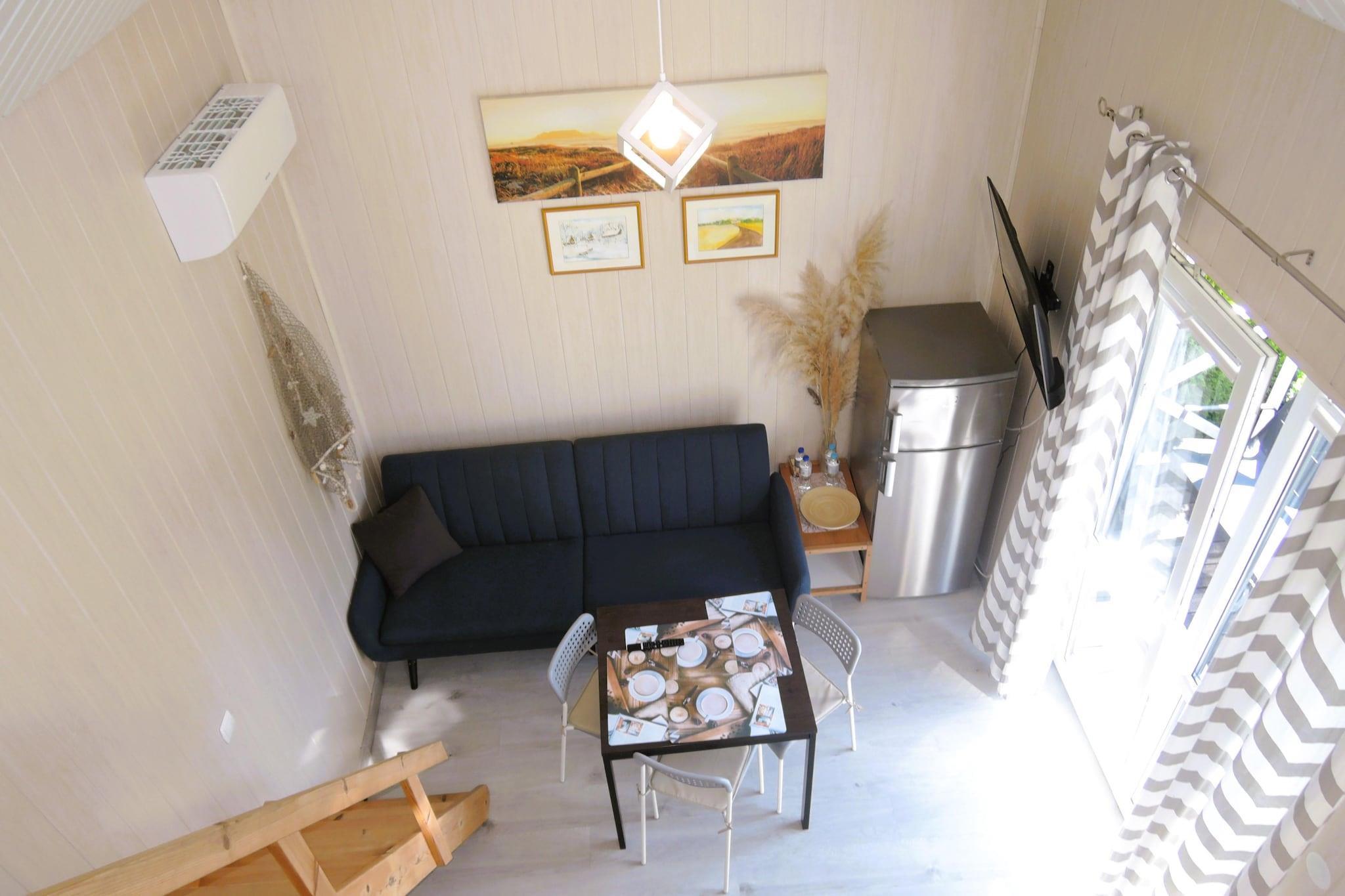 Stueetage: (åbent køkken(elkedel, cooker, komfur, køle-fryseskab), stue / spisestue(Fjernsyn, spisebord, sofahjørne), soveværelse(enkeltseng), soveværelse(dobbeltseng), badeværelse(bruser, håndvask, toilet)) På 1. etage: (svalegang soveværelse(enkeltseng, enkeltseng)) Lokale produkter til salg, Æg, grill, terrasse, have(deles med andre gæster, indhegnet, anlagt have, 400 m2), havemøbler, solstole, hængekøje, barnestol
