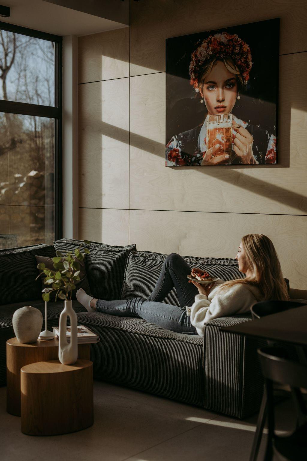 The interior of each cottage conceals comfort and luxury. A comfortable night's sleep is ensured by hotel-quality beds: in the master bedroom and the second bedroom there are double beds (160×200 cm), in the living room there is a sofa bed (150×200 cm, for two people), and for an extra person there is a folding hotel bed (90×200 cm). Two travel cots (60×120 cm) are also available for the youngest guests. Each cottage is equipped with a Smart TV and free WiFi to keep entertainment and comfort at your fingertips.
