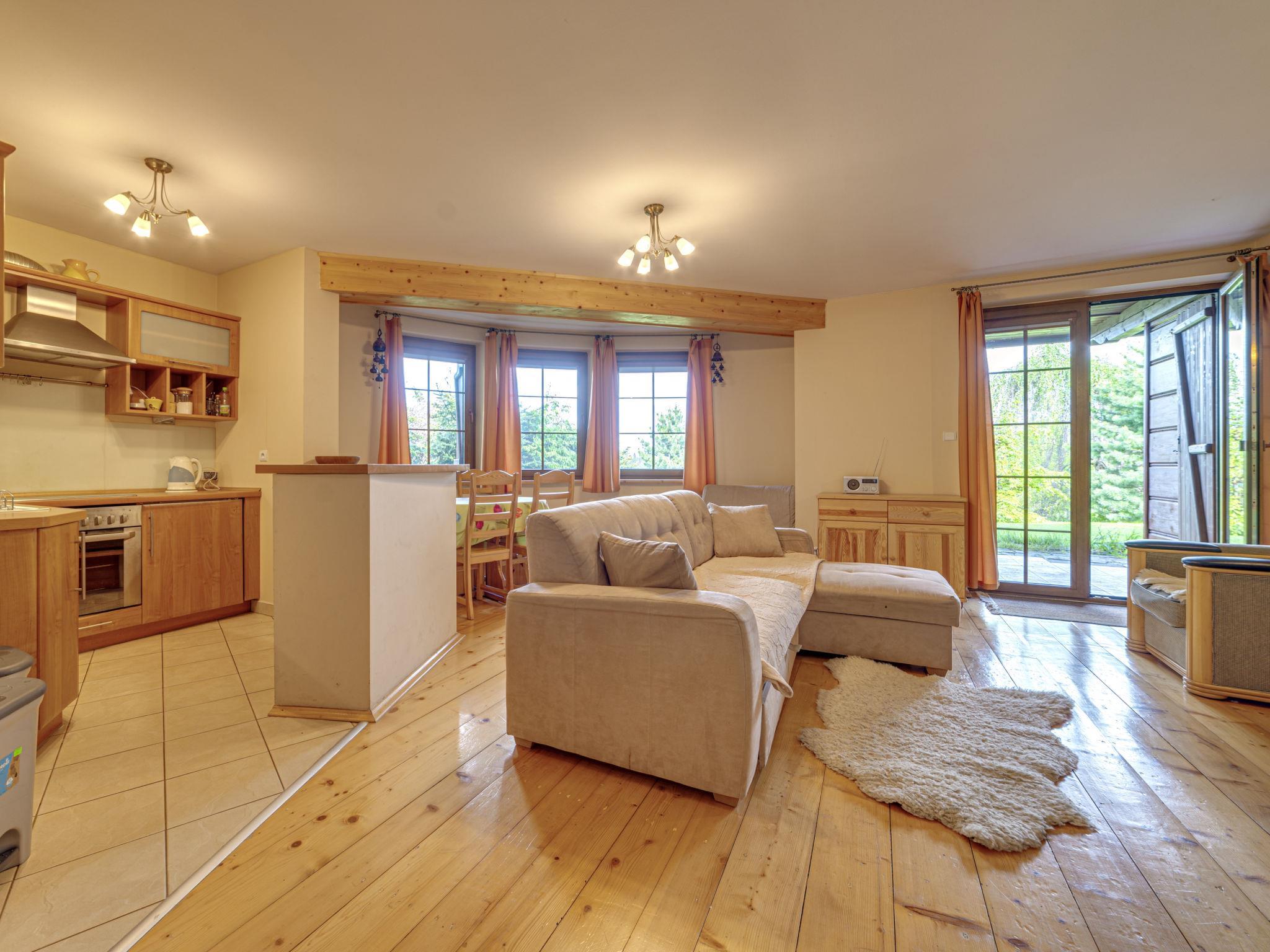 "Pod Jesionem", 2-room apartment 52 m2, on the ground floor. Open living room with 1 sofabed (90 cm), 1 double sofabed (140 cm), open-hearth fireplace, TV, radio and DVD. Exit to the garden, to the terrace. 1 room with 1 french bed (140 cm). Kitchenette (oven, 4 ceramic glass hob hotplates). Shower/WC. Electric heating, boiler (100 litres). Terrace 4 m2. Terrace furniture. View of the mountains. Parking space n 1. Please note: maximum 1 pet/ dog allowed. TV only PL.