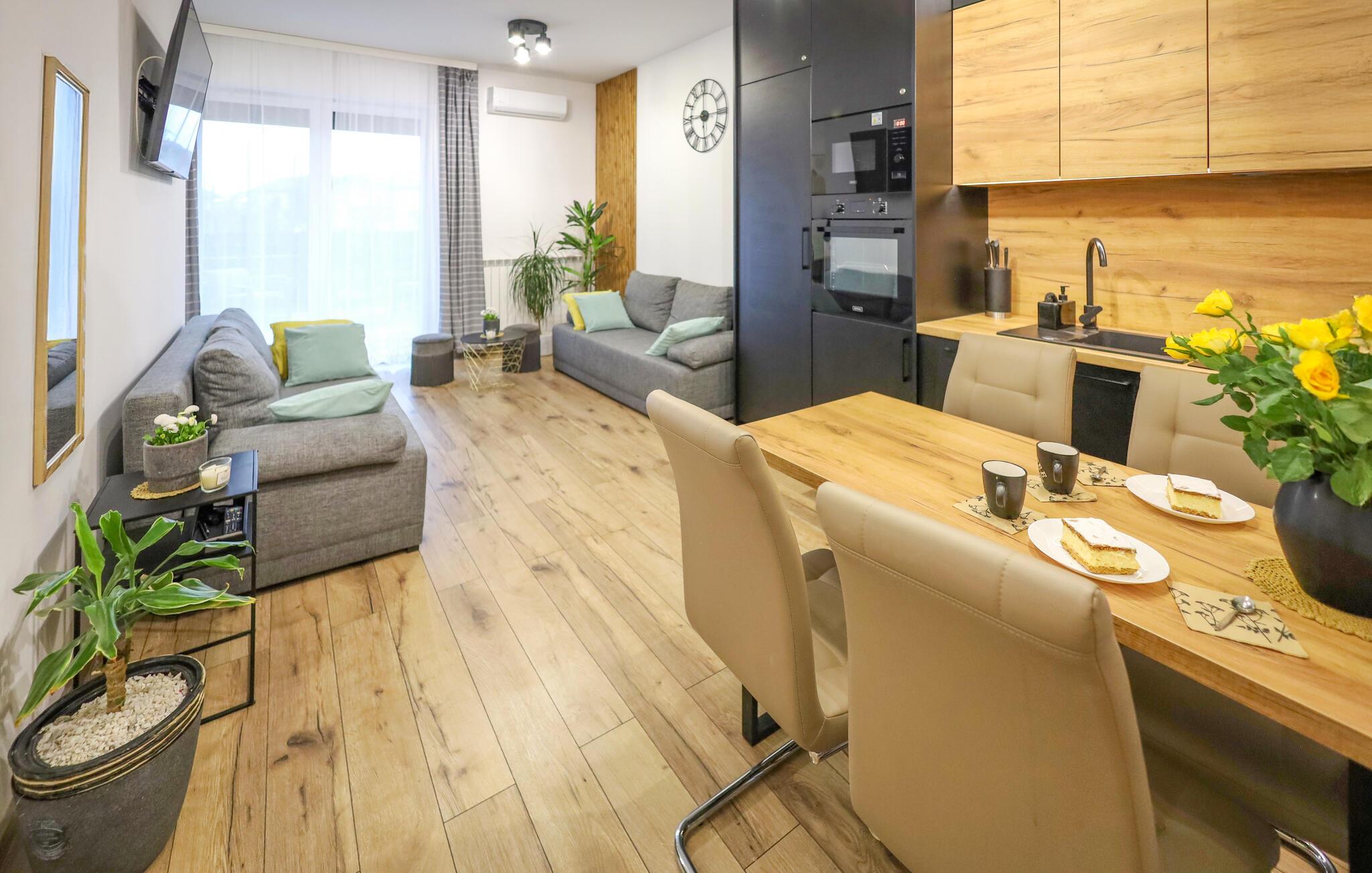 Denne lille lejlighed byder jer velkommen på en fremragende beliggenhed, hvis I vil udforske Zator og området. Den har en terrasse med loungemøbler og ligger kun få minutter fra Energylandia, den største forlystelses- og dinosaurpark i Zator. De hyggelige møbler skaber en behagelig atmosfære, der gør det nemt at føle sig hjemme fra den allerførste dag. Nyd en afslappende pause med spændende udflugter, fælles måltider og hyggelige aftener på sofaen efter jeres eventyr.
