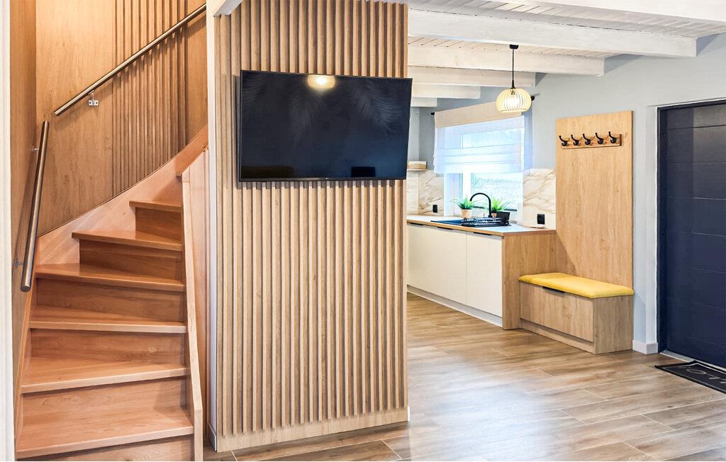 Dette feriehus, der er indrettet i en tidløs moderne stil, har diskrete farver, masser af træ i indretningen og komfortable møbler. Sæt jer til rette med en velduftende kop kaffe, lyt til en interessant podcast eller tilbered lækre måltider i det veludstyrede køkken.