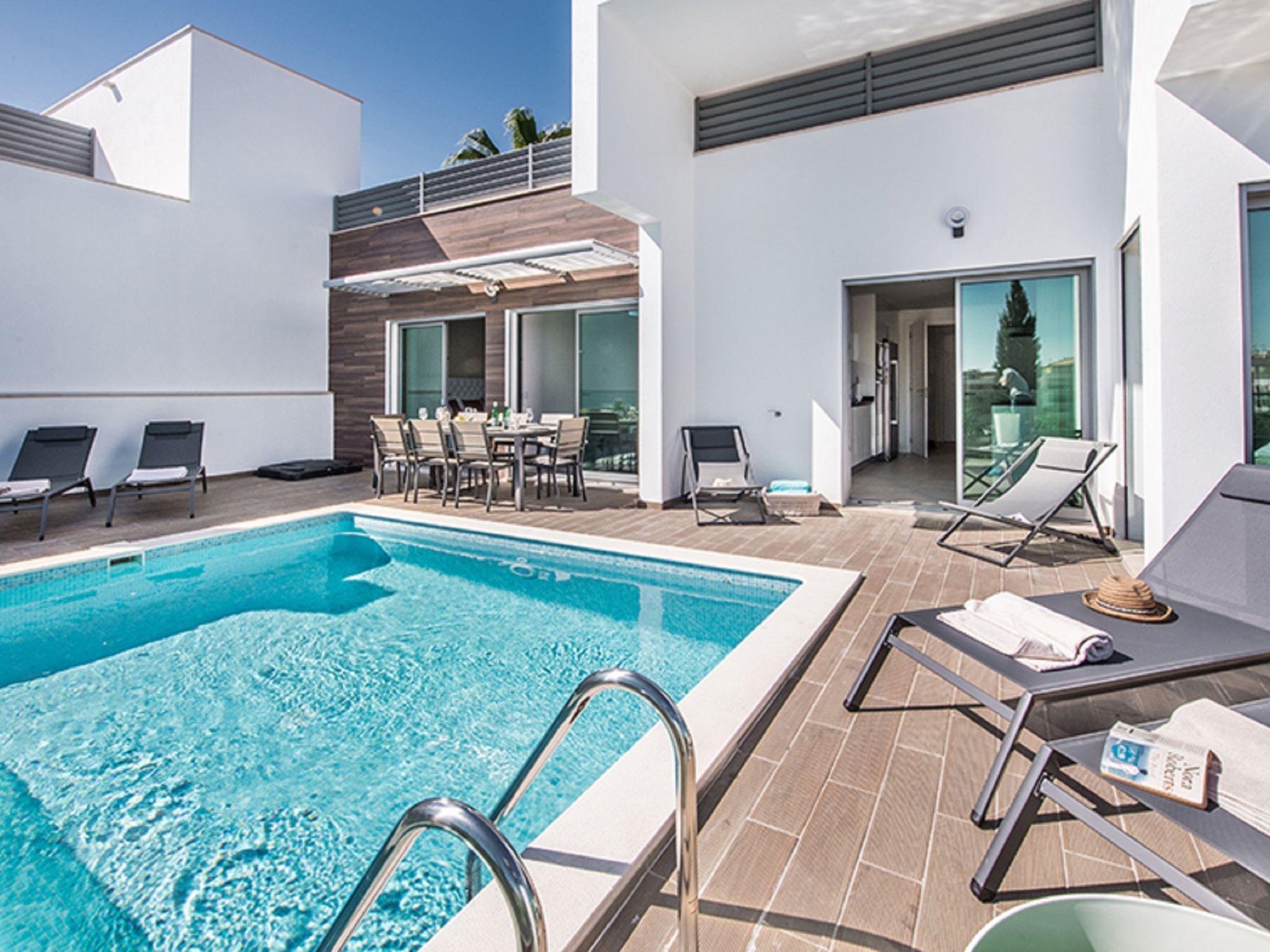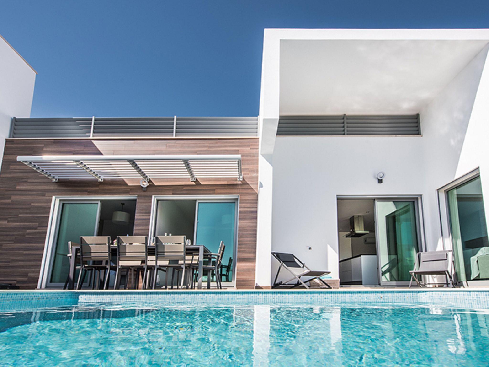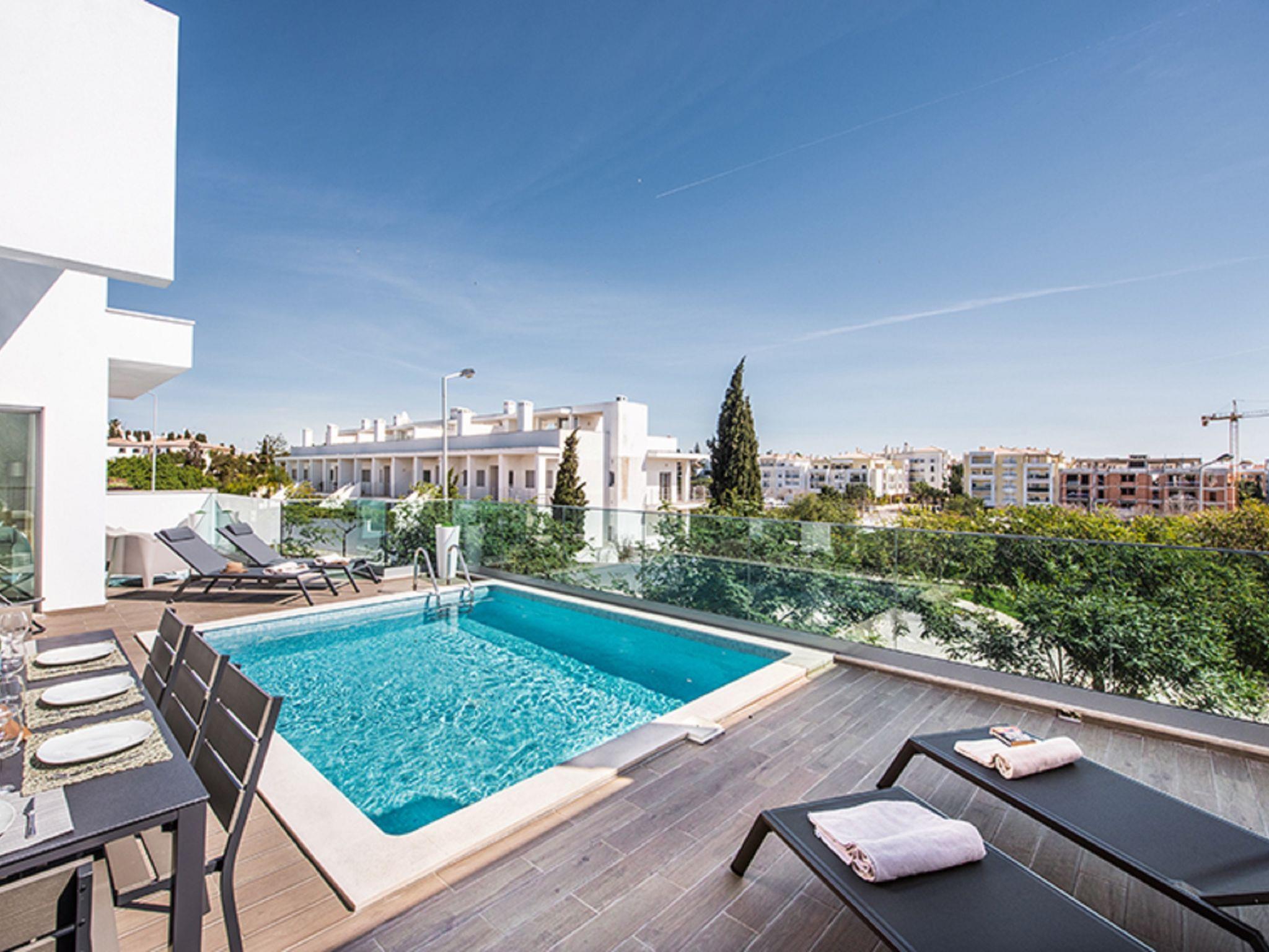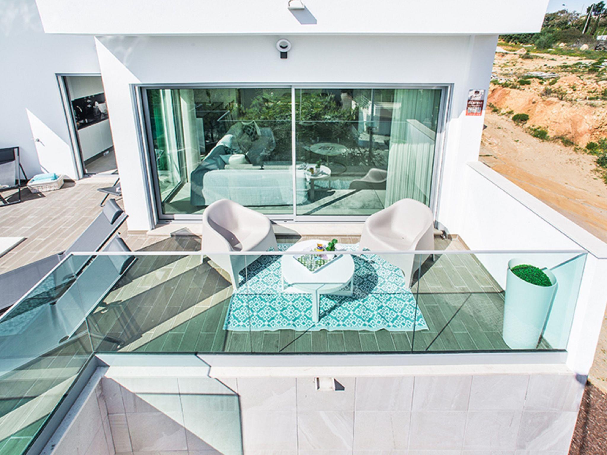 Very modern, comfortable villa. In the resort 2.1 km from the centre of Albufeira, 1.7 km from the sea. Private: swimming pool angular, heated (4 x 6 m, depth 110 - 110 cm, seasonal availability: 01.Jan. - 31.Dec.). In the house: WiFi, air conditioning, drying room. Parking at the house. Grocery, supermarket 250 m, shopping centre 1.1 km, restaurant 350 m, bar 800 m, bakery, café 250 m, bicycle rental 2.9 km, bus stop 220 m, railway station 5.5 km, sandy beach "Praia da Oura" 1.7 km, diving center 5.5 km. Marina 5.9 km, golf course (18 hole) 10.5 km, surf school 10.1 km, minigolf 1 km, riding stable 10.3 km, children's playground 1.2 km. Nearby attractions: Adventure Mini Golf Park 1 km, Zebra Safari Tours 2.9 km, Algarve Shopping 9.4 km, Zoomarine 10.6 km, Krazy World 15.3 km, Faro Airport 35.3 km. Well-known lakes can easily be reached: Lagoa dos Salgados 13.4 km. Please note: Loading and unloading of baggage is possible at the holiday house. All groups of young people under 25 years old must pay an extra deposit in cash on arrival.Pool maintenance is carried out any day of the week without prior notice. The person in charge has access to the outside area.