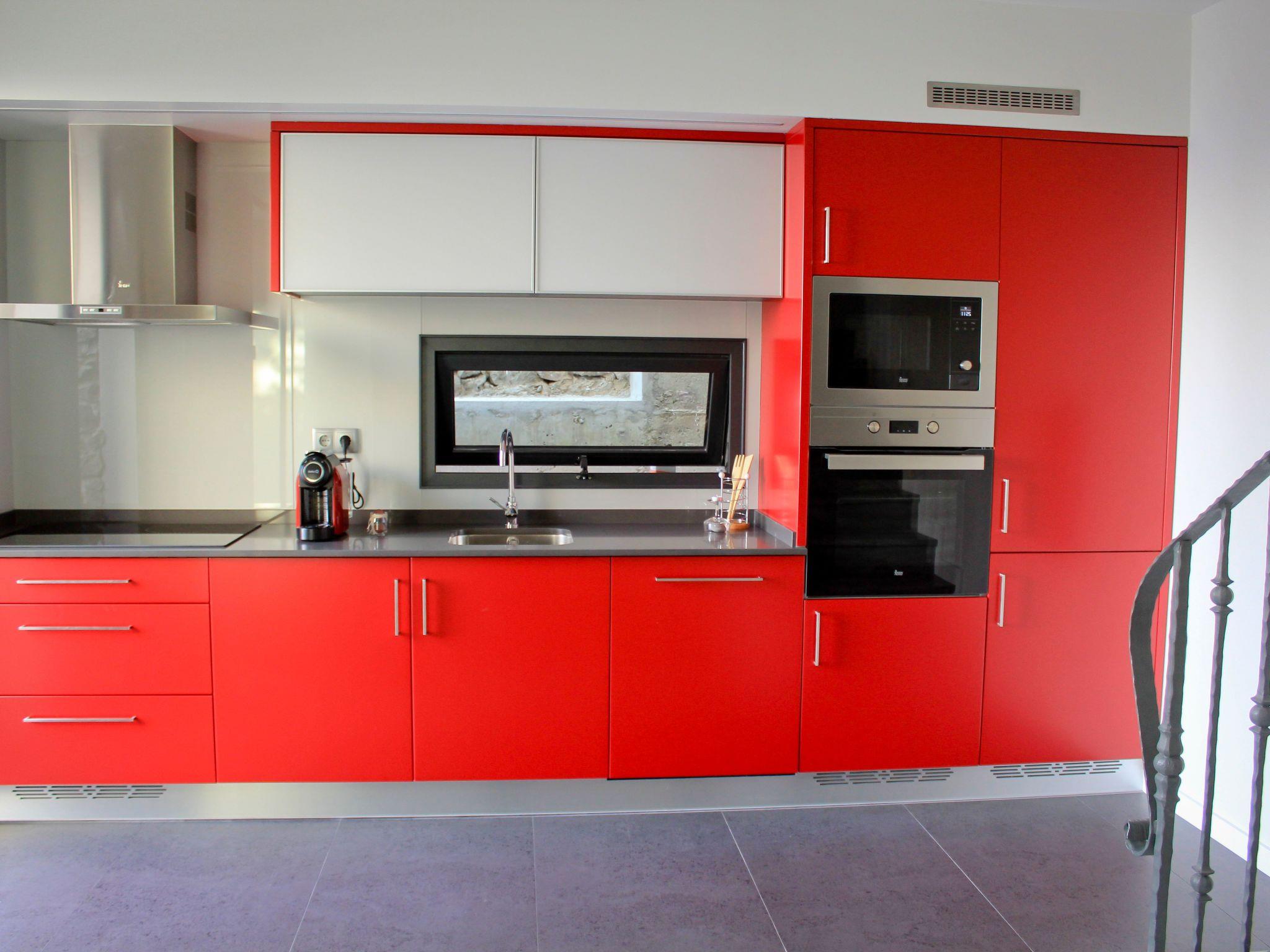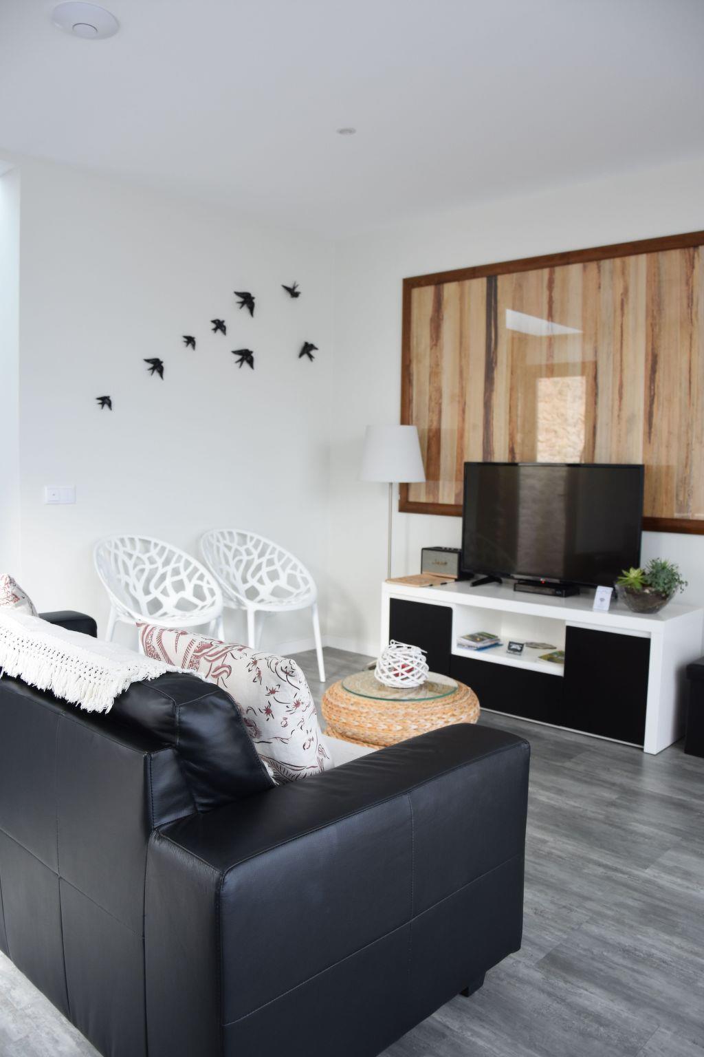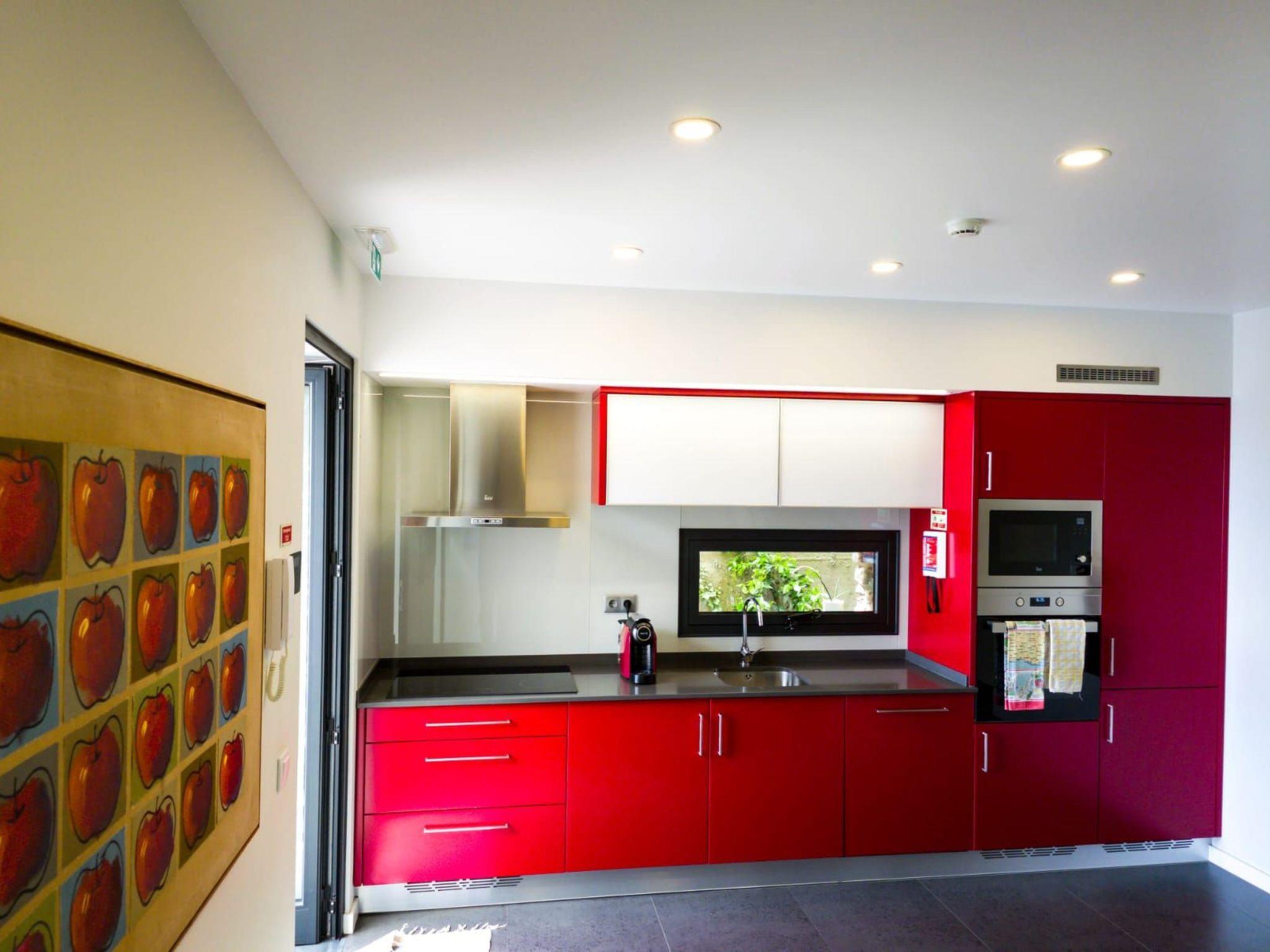 The two-storey villa has two bedrooms and can accommodate four persons. The ground floor is about 70 m² in size and comprises of the following rooms: A living room with a black leather sofa, large flatscreen TV and a dining area. Next to it there is a bedroom with two 90 x 200 cm single beds that you can push together to make a double bed. Plus there is a trendy, fully-equipped red Hi Gloss kitchen complete with Ceran cooktop and stainless steel extractor hood, oven, microwave, fridge with freezer compartment and coffee machine. There also is an adjoining bathroom with a walk in rain shower, wash basin and toilet.