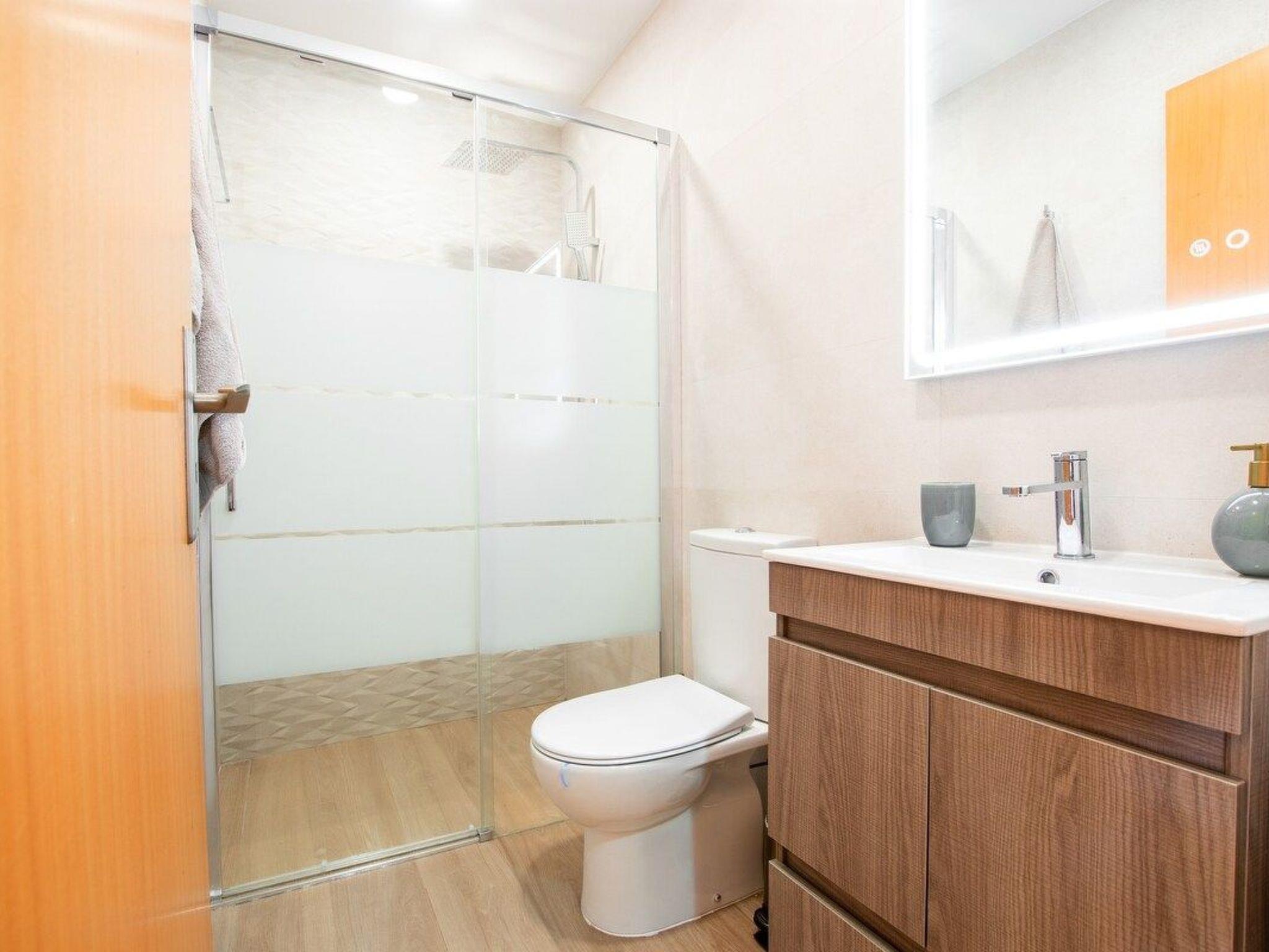 o Lower level WC - Equipped with small cupboard/mirror for small storage, towel rail with towel warmer and bath towels [Service WC with shower] ;