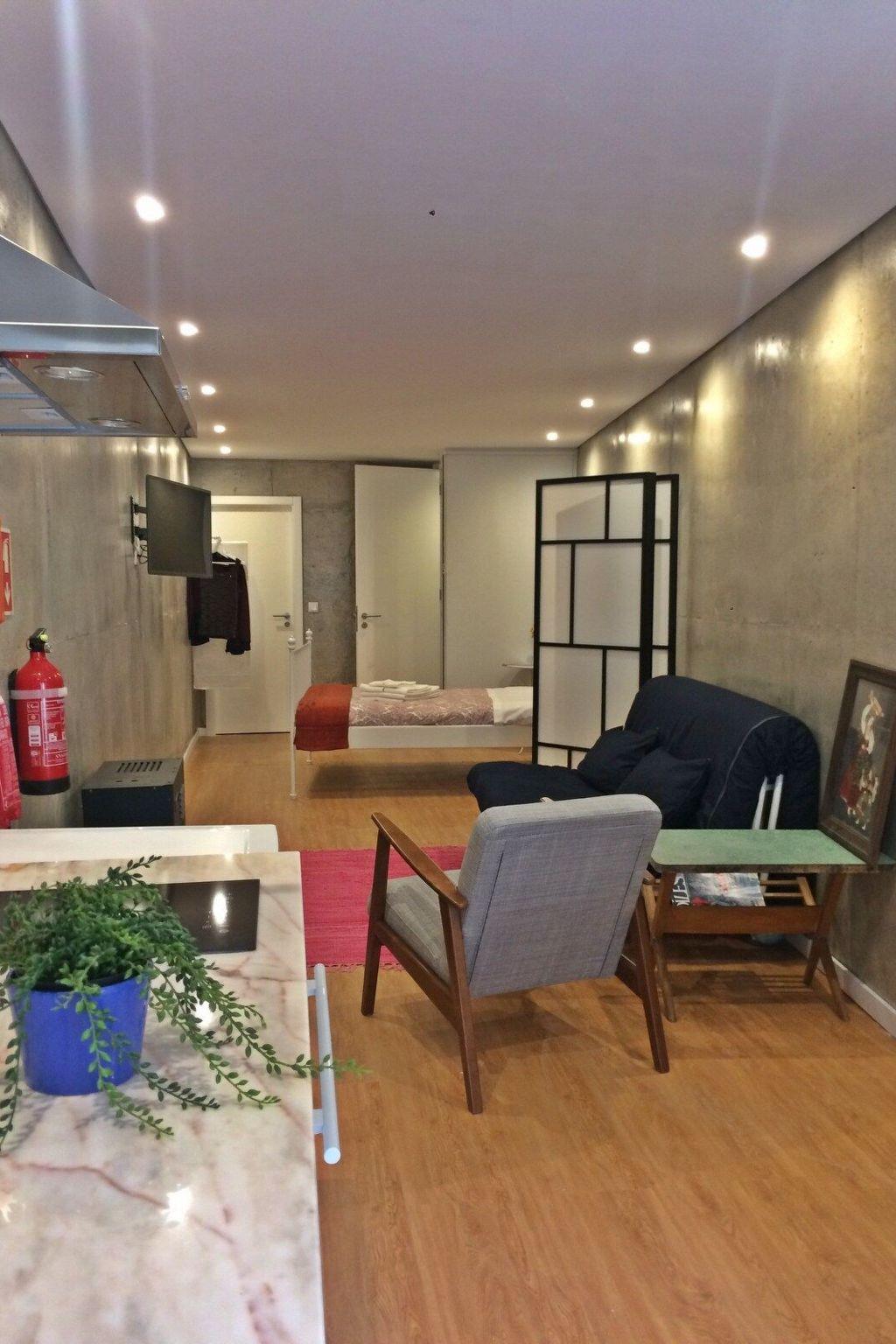 The studio is a modern and cosy space with a bed, living area, kitchen and bathroom.