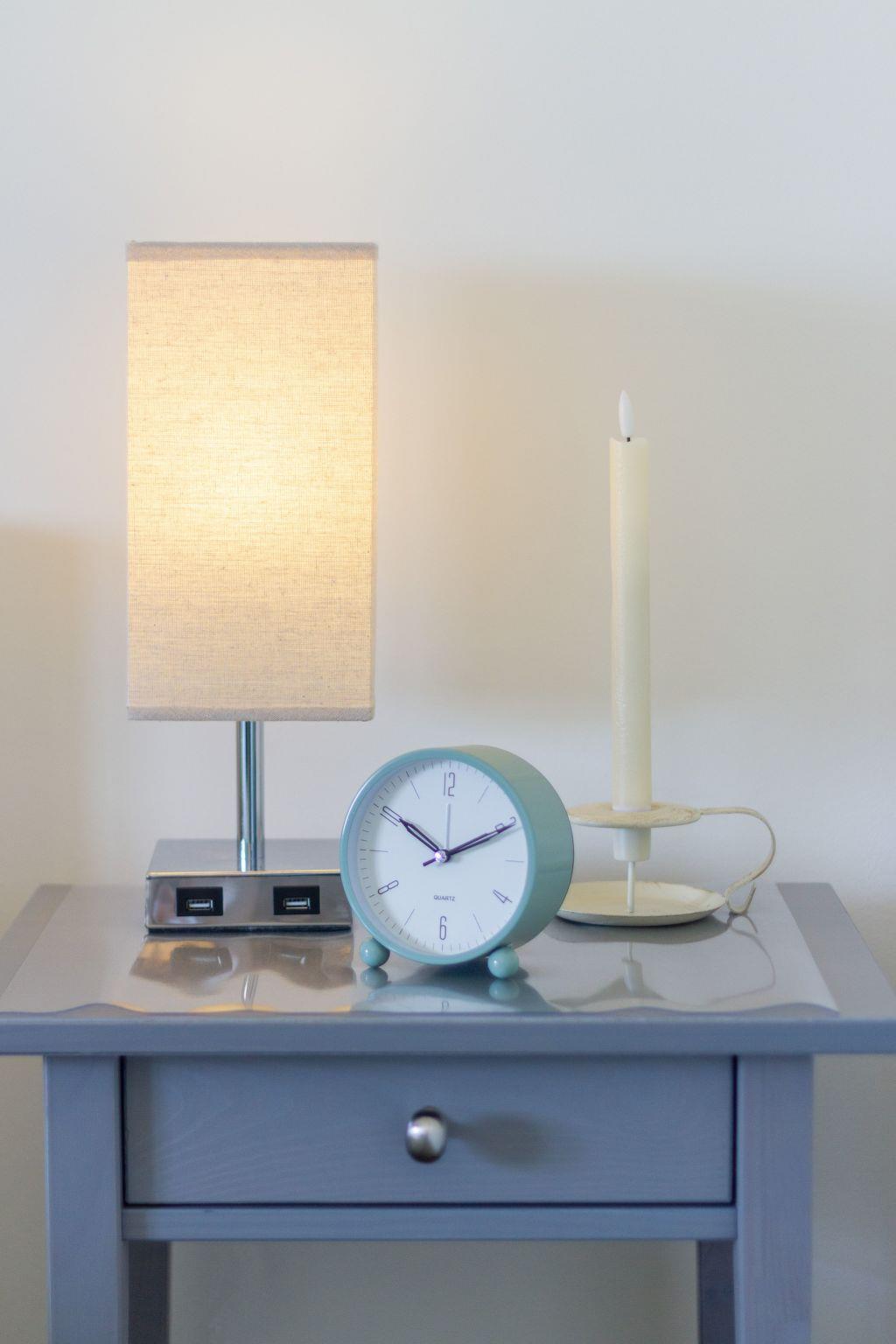 - The bedroom includes a king-sized double bed, a dresser with mirror, a closet with hangers, a luggage bench, and a reading chair. USB charging outlets are provided on both bedsides, as are an electrical fan and an air cleaner / dehumidifier.