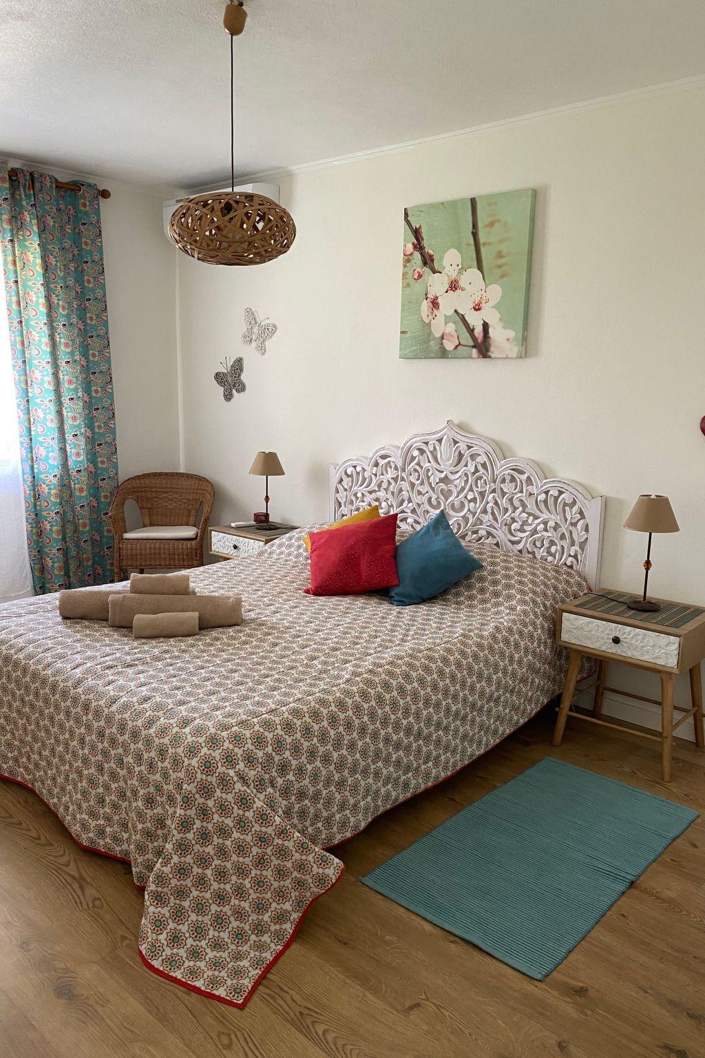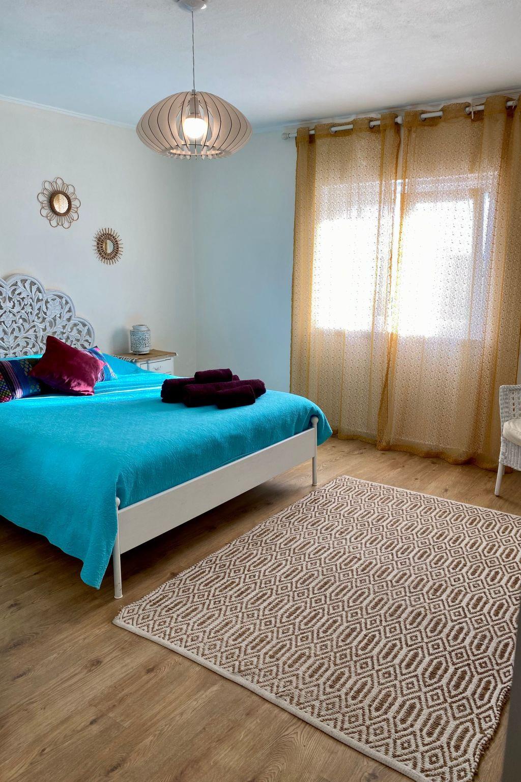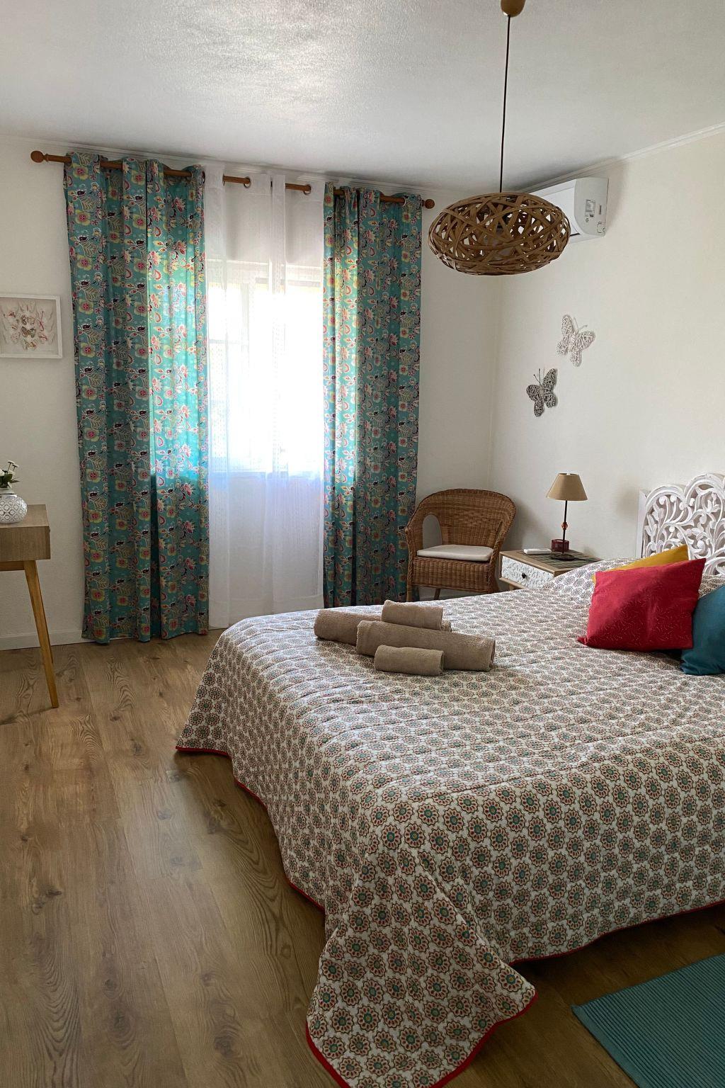 The detached house was built 30 years ago and was recently restored, in order to bring it up to the requisite holiday house standards. Here you can enjoy the amazing weather, the peacefulness of the surroundings and the lovely beaches and breathtaking landscape. The 140m² two-storey villa has five bedrooms, of which four have a double bed and one has a single bed. Two of the five bedrooms are on the ground floor, while the other three are on the upper floor. All of them are tastefully decorated and are light and inviting. The ground floor has a bathroom with a bath and WC. On the upper floor there is the second bathroom with a shower and WC. There is also a single bed in the upstairs hallway. The centrepiece of the house is the living room with an open fireplace, a comfortable sofa, a TV and a dining area, with an adjoining kitchen equipped with all the basics, as well as a dishwasher. There is another kitchen in the garage.