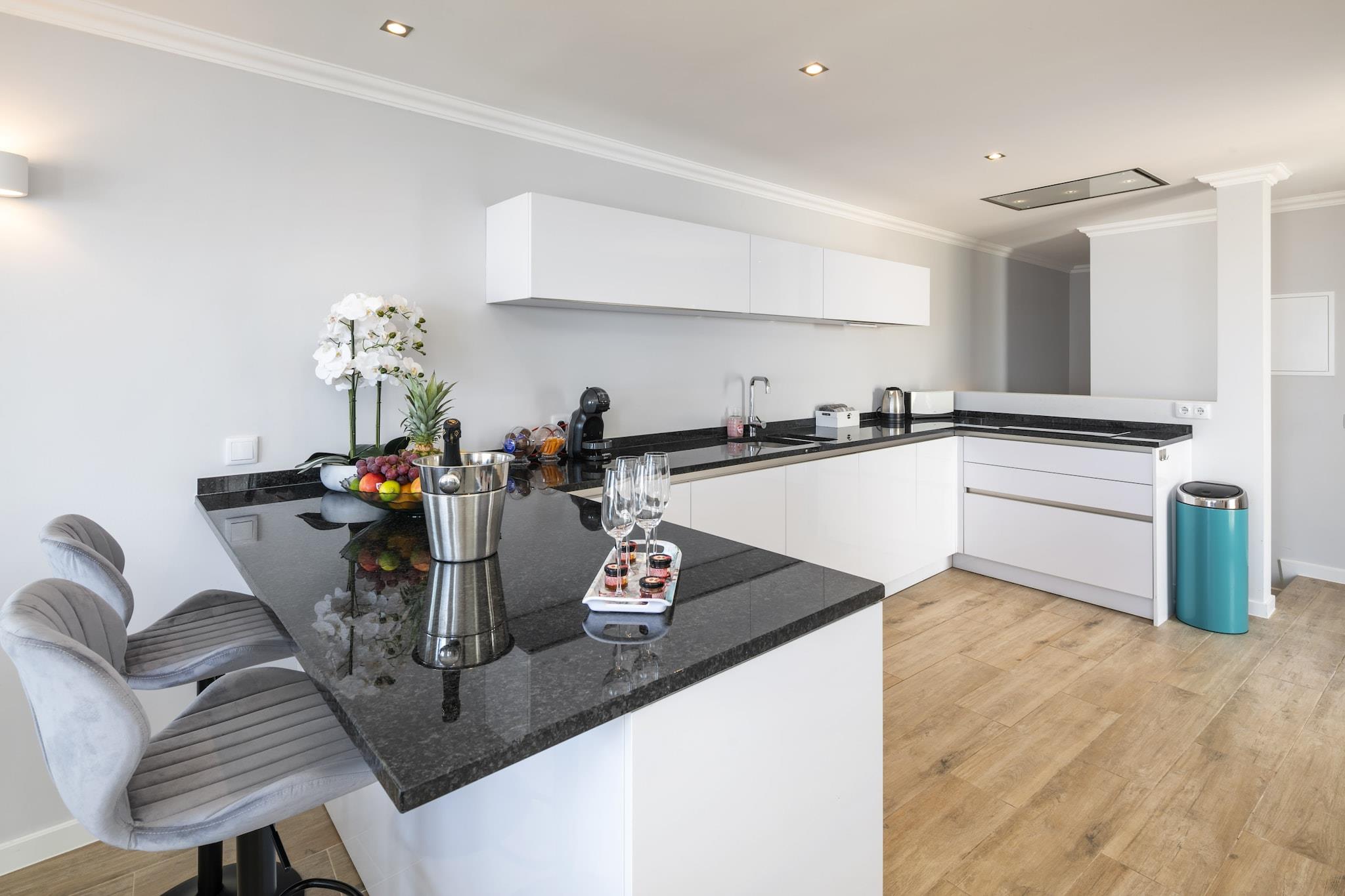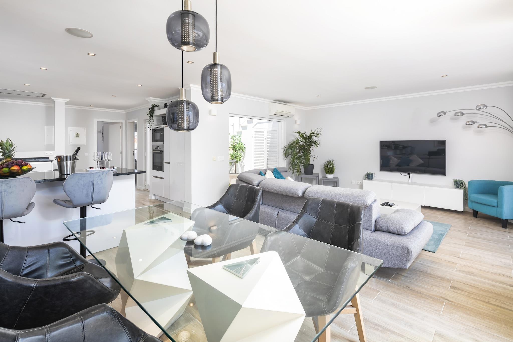 På 1. etage: (åbent køkken(elkedel, brødrister, kaffemaskine, ovn, mikrobølgeovn, opvaskemaskine , køle-fryseskab, Saftpresser, ), stue / spisestue(enkeltsovesofa, Fjernsyn(fladskærm, parabol, Smart-TV), spisebord, sofahjørne, radio), soveværelse(enkeltseng, enkeltseng, Fjernsyn(fladskærm, parabol, Smart-TV)), soveværelse(king size-seng, Fjernsyn(fladskærm, parabol, Smart-TV)), badeværelse(bruser, føntørrer, , ), badeværelse(bruser, føntørrer, , ), Internetadgang) Havemøbler, tørretumbler, vaskemaskine, balkon, varme(central), klimaanlæg, terrasse, grill, parkering, swimmingpool(opvarmet), strygebræt, strygejern, føntørrer, , Wine glasses
