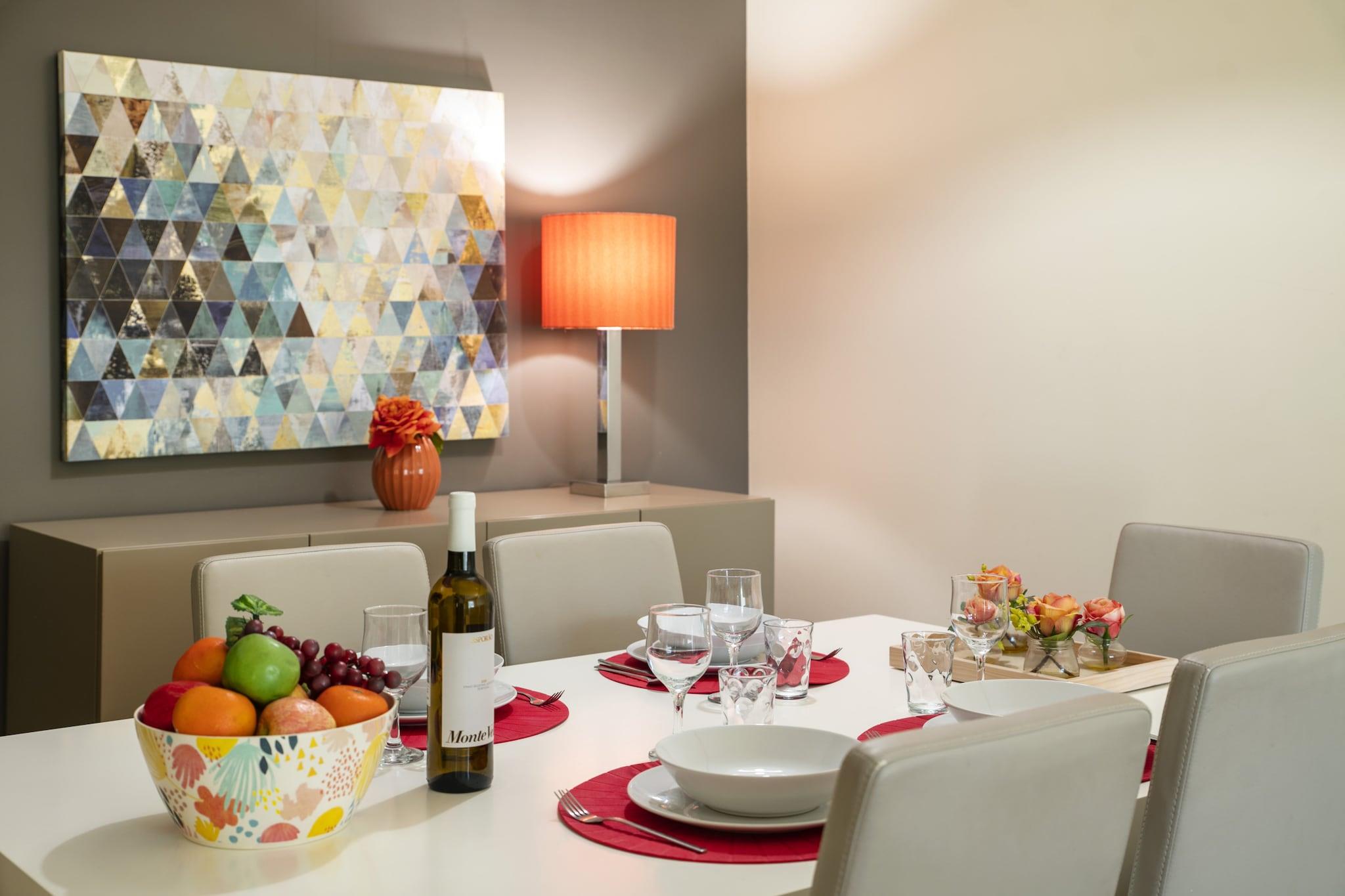 Stue(enkeltsovesofa, Fjernsyn(fladskærm, parabol, Smart-TV), spisebord, sofahjørne, radio), Køkken(elkedel, brødrister, kaffemaskine, ovn, mikrobølgeovn, opvaskemaskine , køle-fryseskab, Saftpresser, , Wine glasses), soveværelse(king size-seng), soveværelse(enkeltseng, enkeltseng), badeværelse(bruser, føntørrer, ), badeværelse(bruser, håndvask, toilet), badeværelse(badekar, håndvask, toilet), Internetadgang, Havemøbler, grill, vaskemaskine, balkon, patio, varme(elektrisk), terrasse, have(indhegnet), parkering, swimmingpool(deles med andre gæster, udendørs), strygebræt, strygejern,