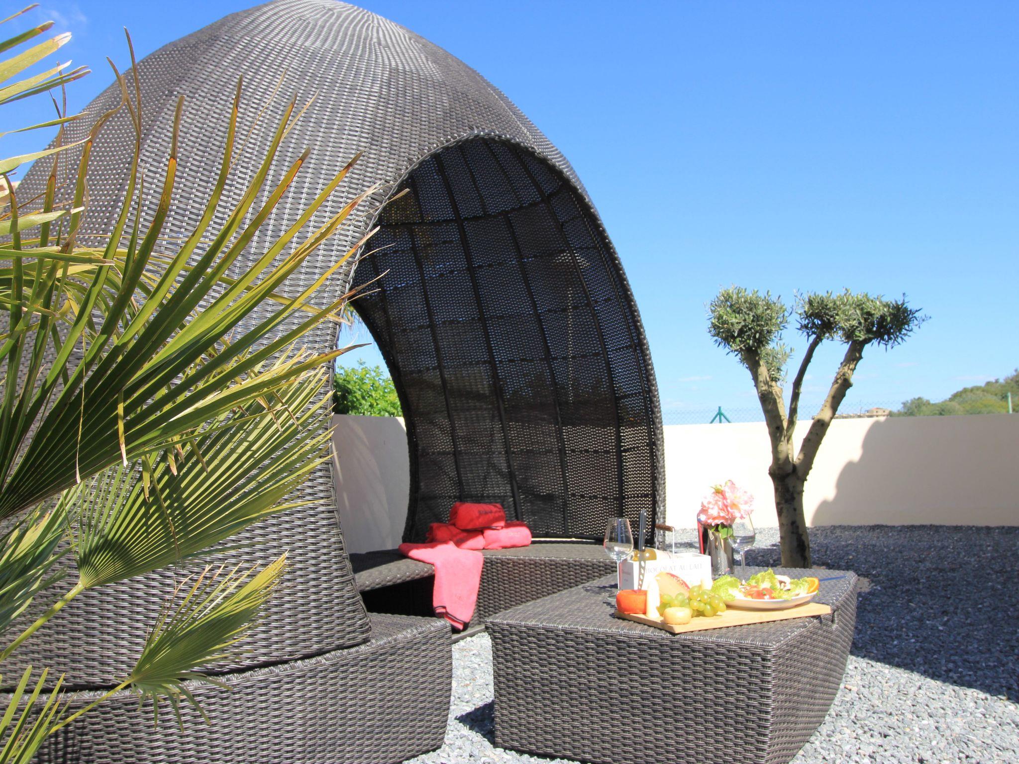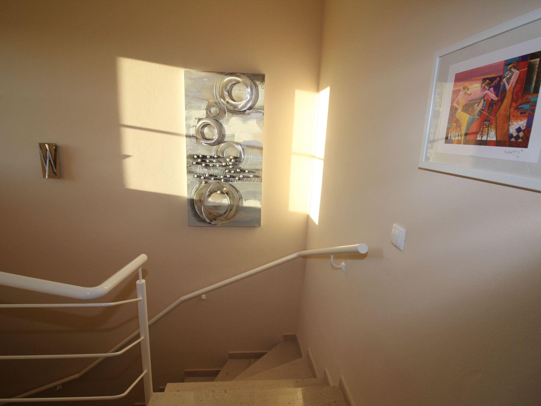 The interior of the villa underlines your demands for comfort and aesthetics: Completed over two floors, equipped with electric underfloor heating, the ground floor presents itself with a fully equipped kitchen, an inviting chill-out room with comfortable couch, a guest bathroom including washer-dryer, and a separate guest WC. The living room, with a wood-burning fireplace and cosy brown leather chaise longue, opens onto a breathtaking view of the terrace. On the first floor, two bedrooms with luxurious box-spring beds, balcony and sea view invite you to relax, complemented by a bathroom with bathtub, bidet, shower and a separate guest WC.